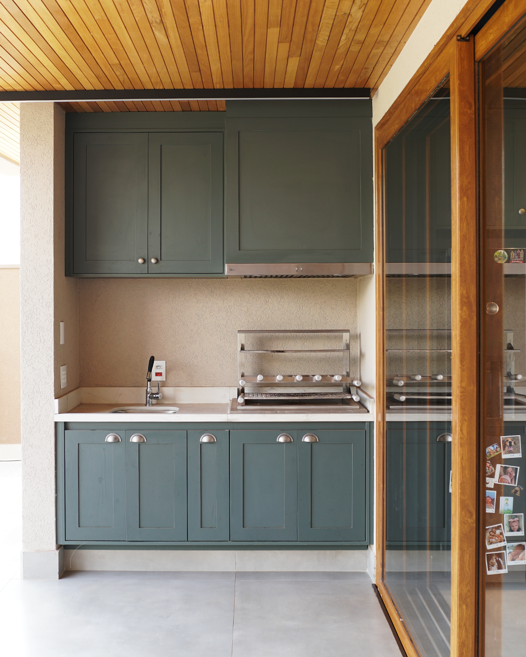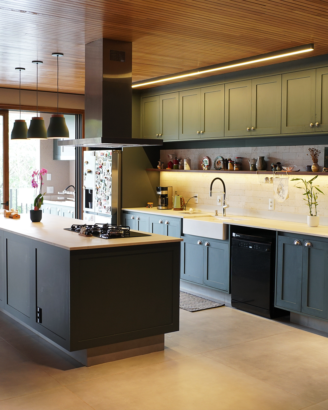 Esta casa destaca a força dos móveis planejados com portas shaker em tom verde acinzentado, criando uma estética charmosa e contemporânea. A marcenaria se repete de forma integrada pela cozinha, espaço gourmet, sala de estar e home office, unificando todos os ambientes com elegância. Nichos, prateleiras iluminadas e composições funcionais reforçam o cuidado nos detalhes e transformam cada espaço em uma experiência acolhedora e personalizada.