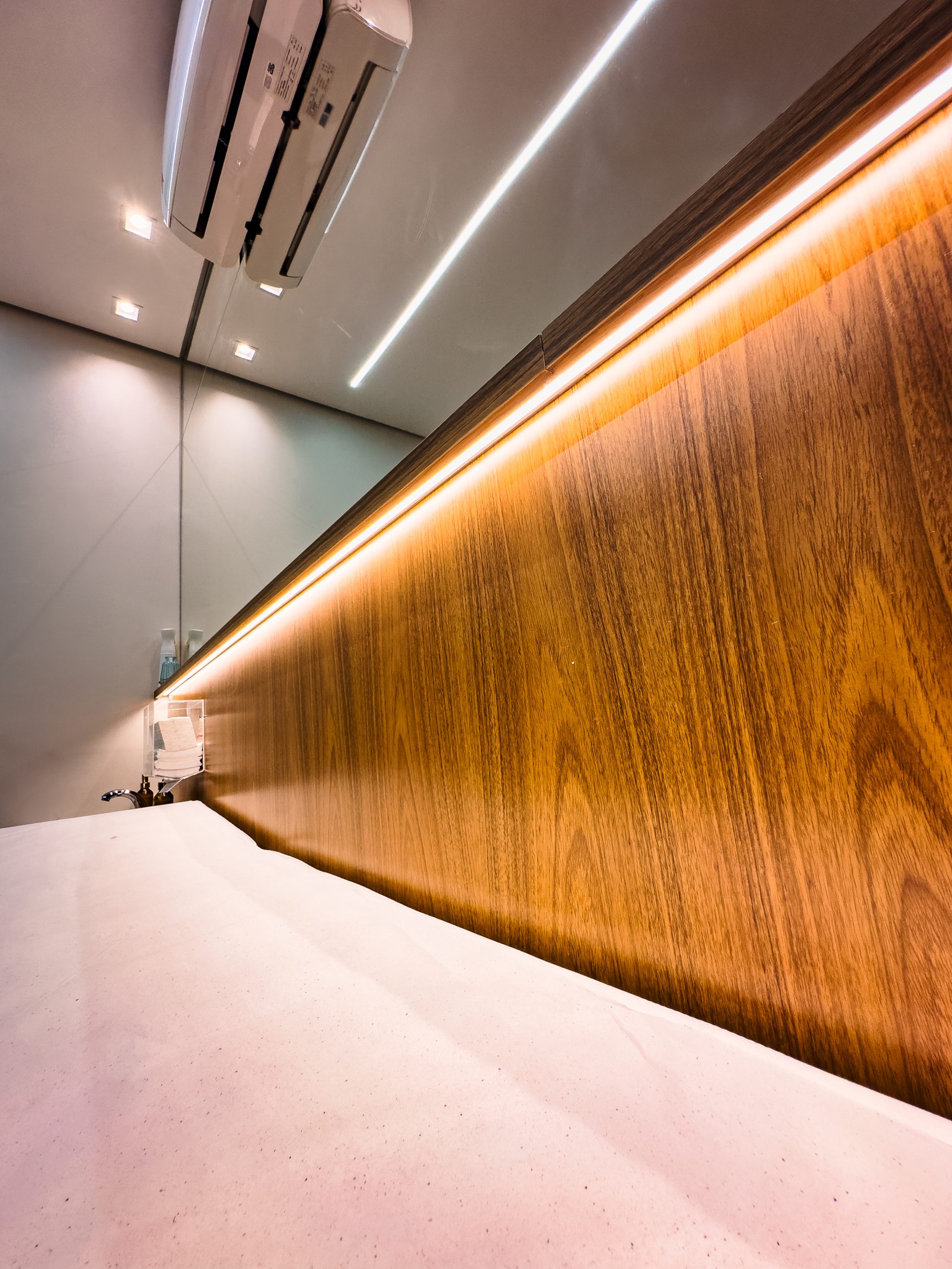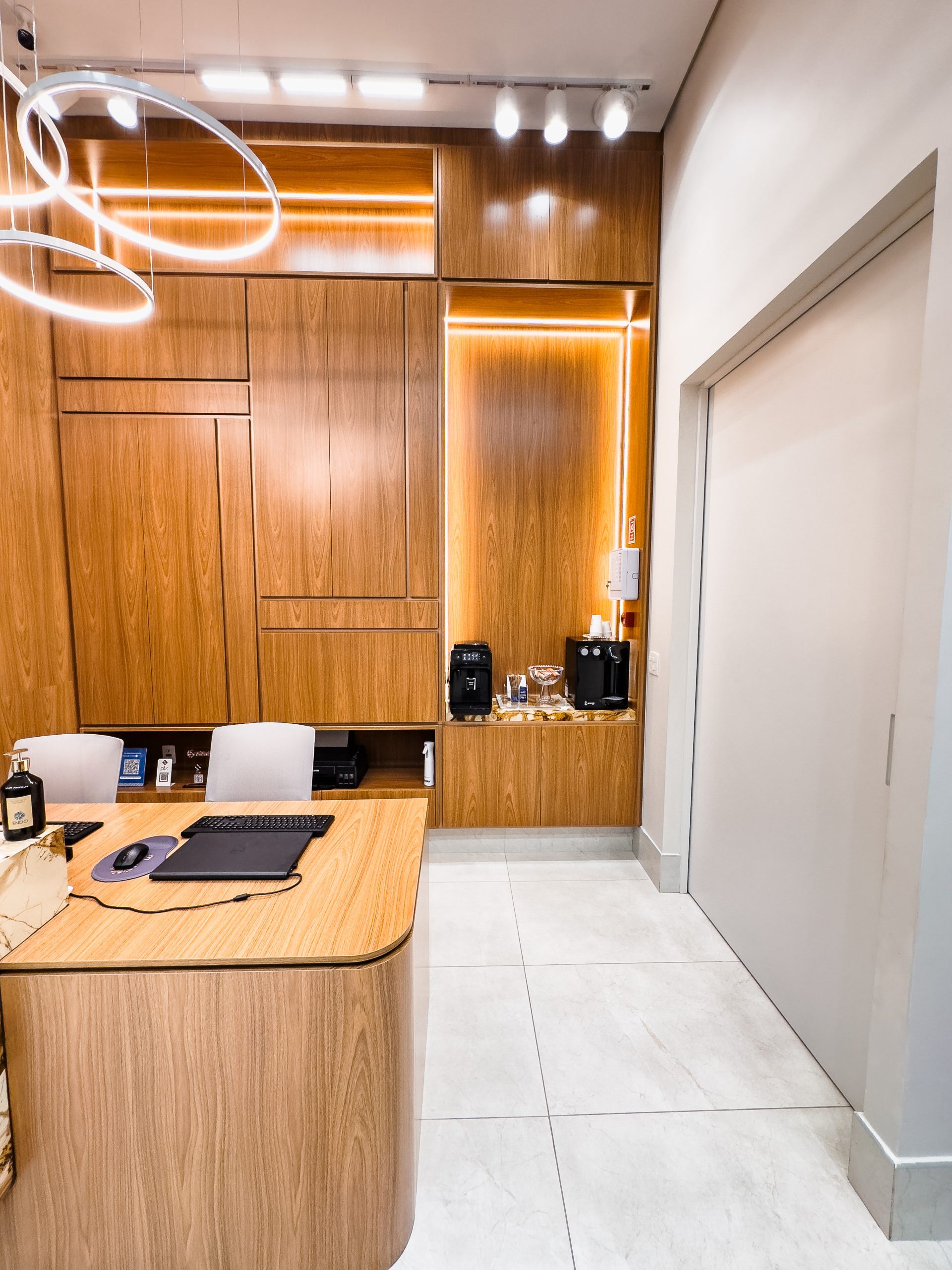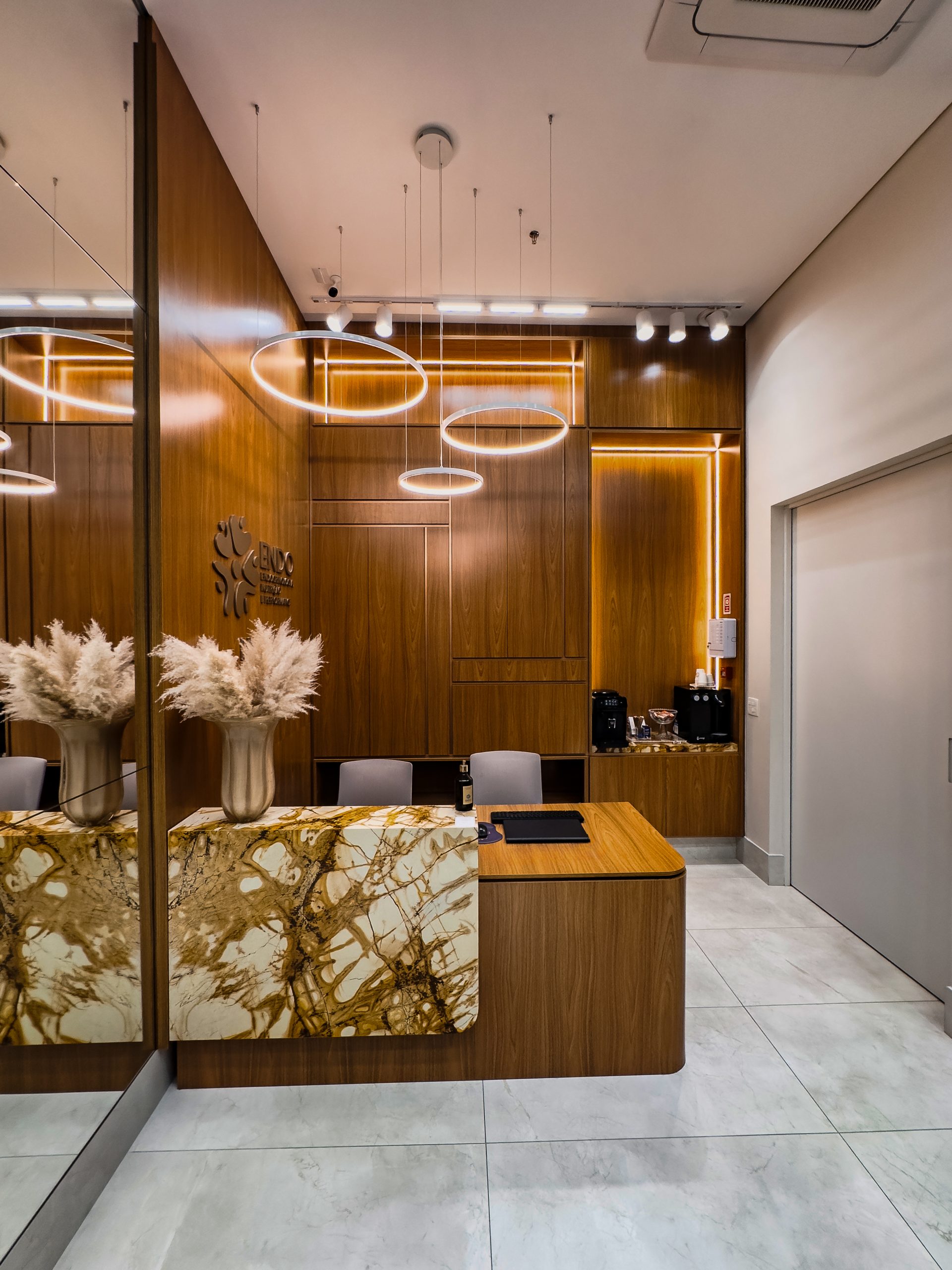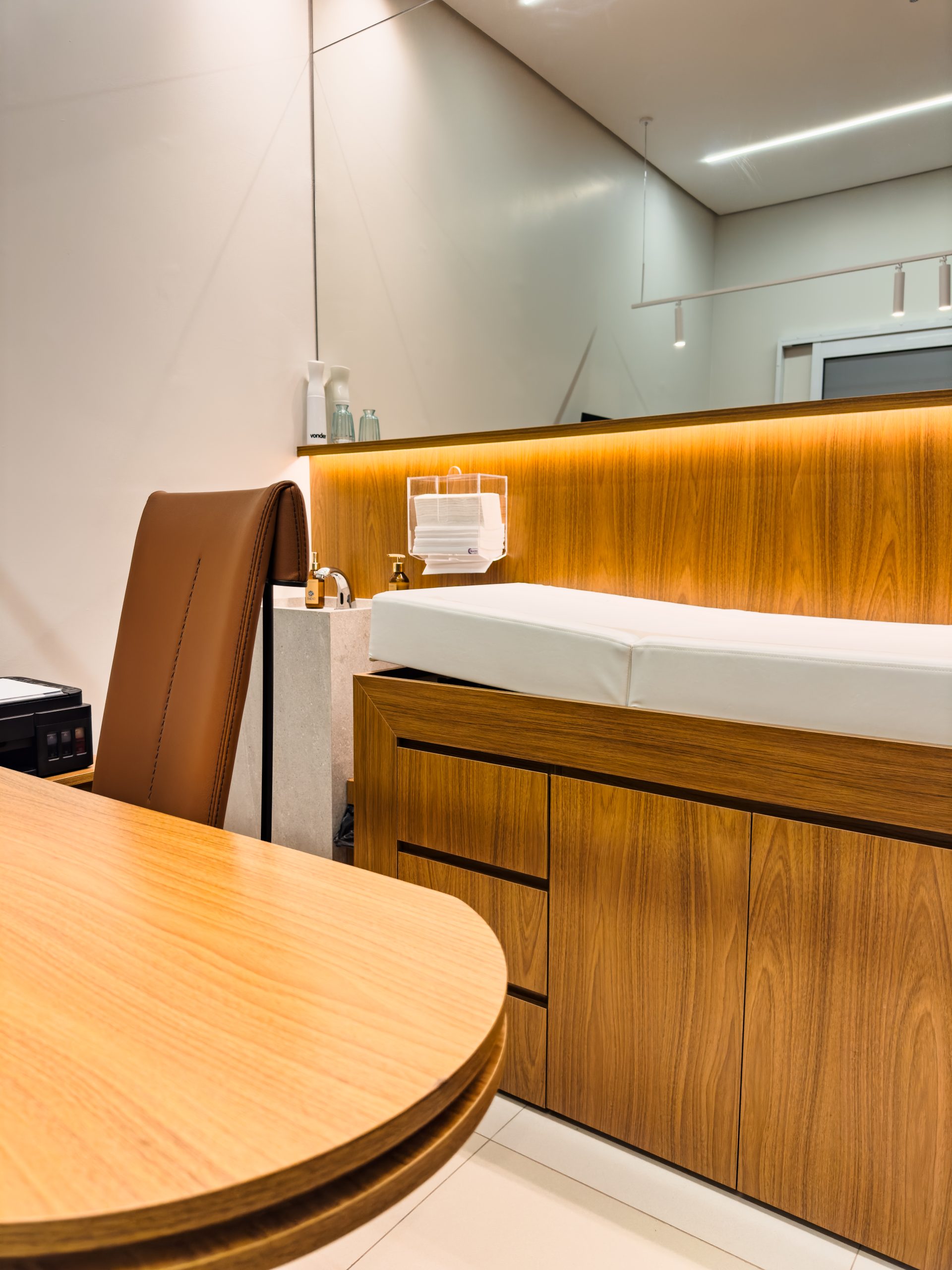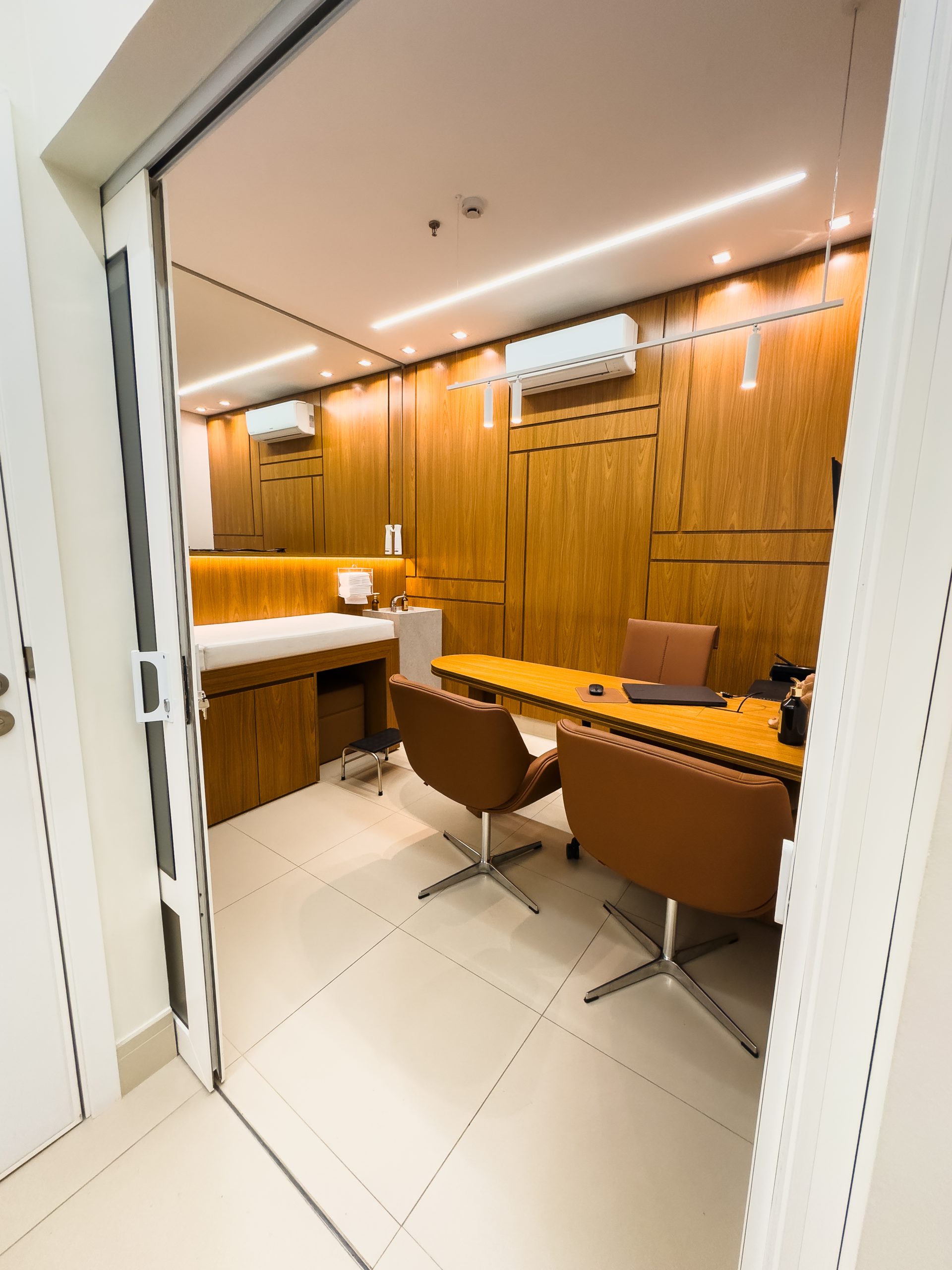 O Painel Integrado Áureo destaca como os móveis planejados transformam a recepção e o consultório em ambientes acolhedores, funcionais e sofisticados. A marcenaria em madeira envolve todo o espaço, criando continuidade visual e integrando nichos, portas camufladas e áreas de apoio com perfeição. A iluminação embutida valoriza os veios da madeira e reforça o tom elegante que acompanha o atendimento desde o primeiro contato.