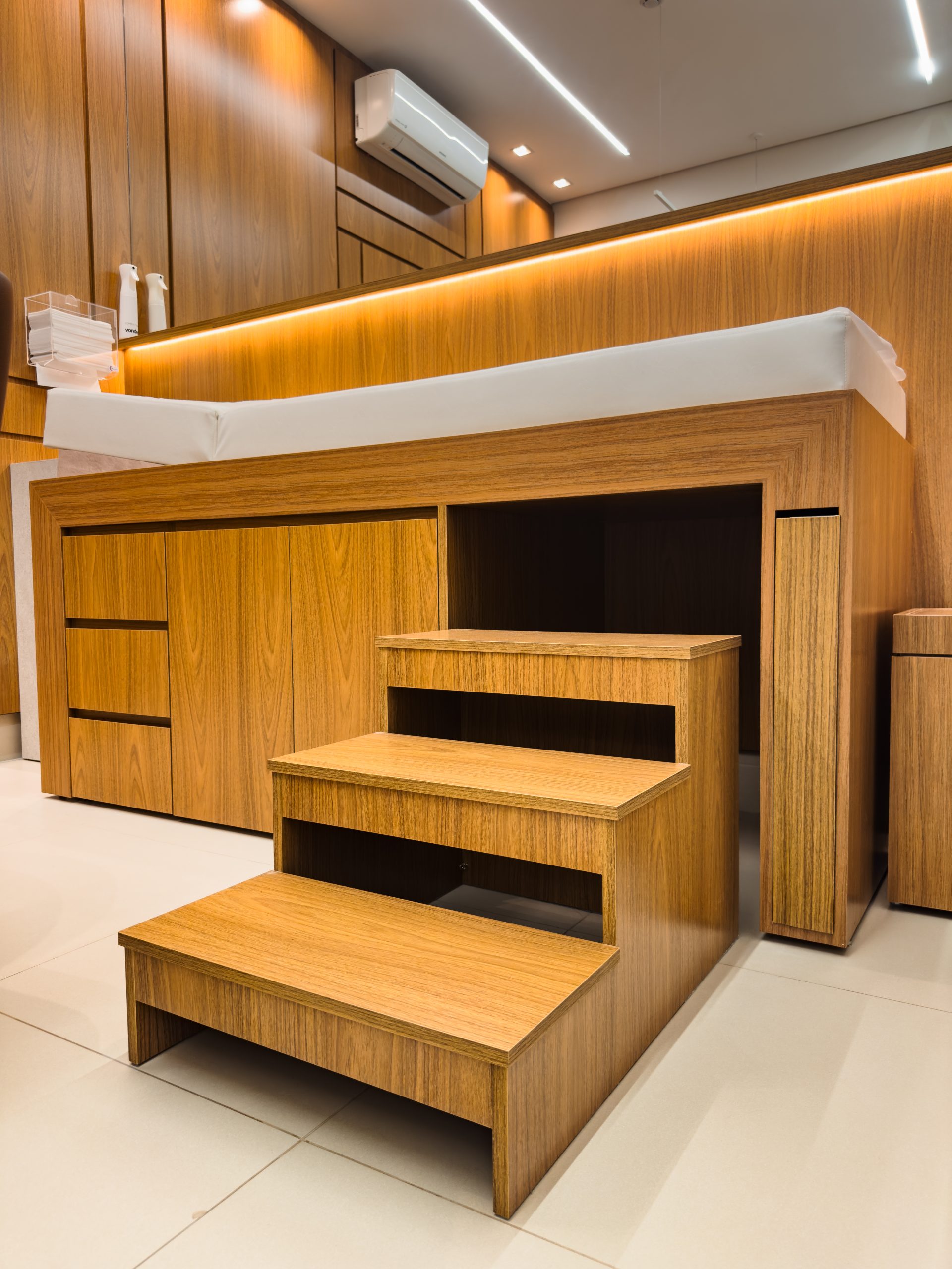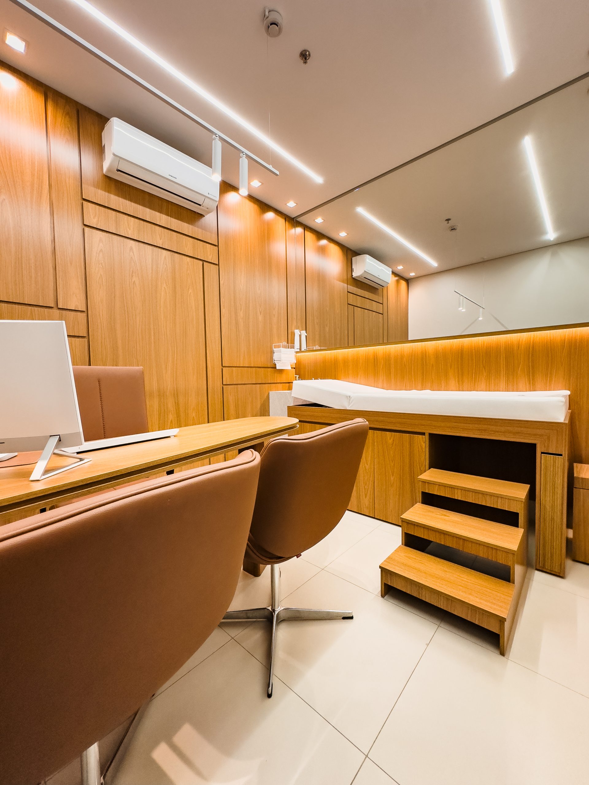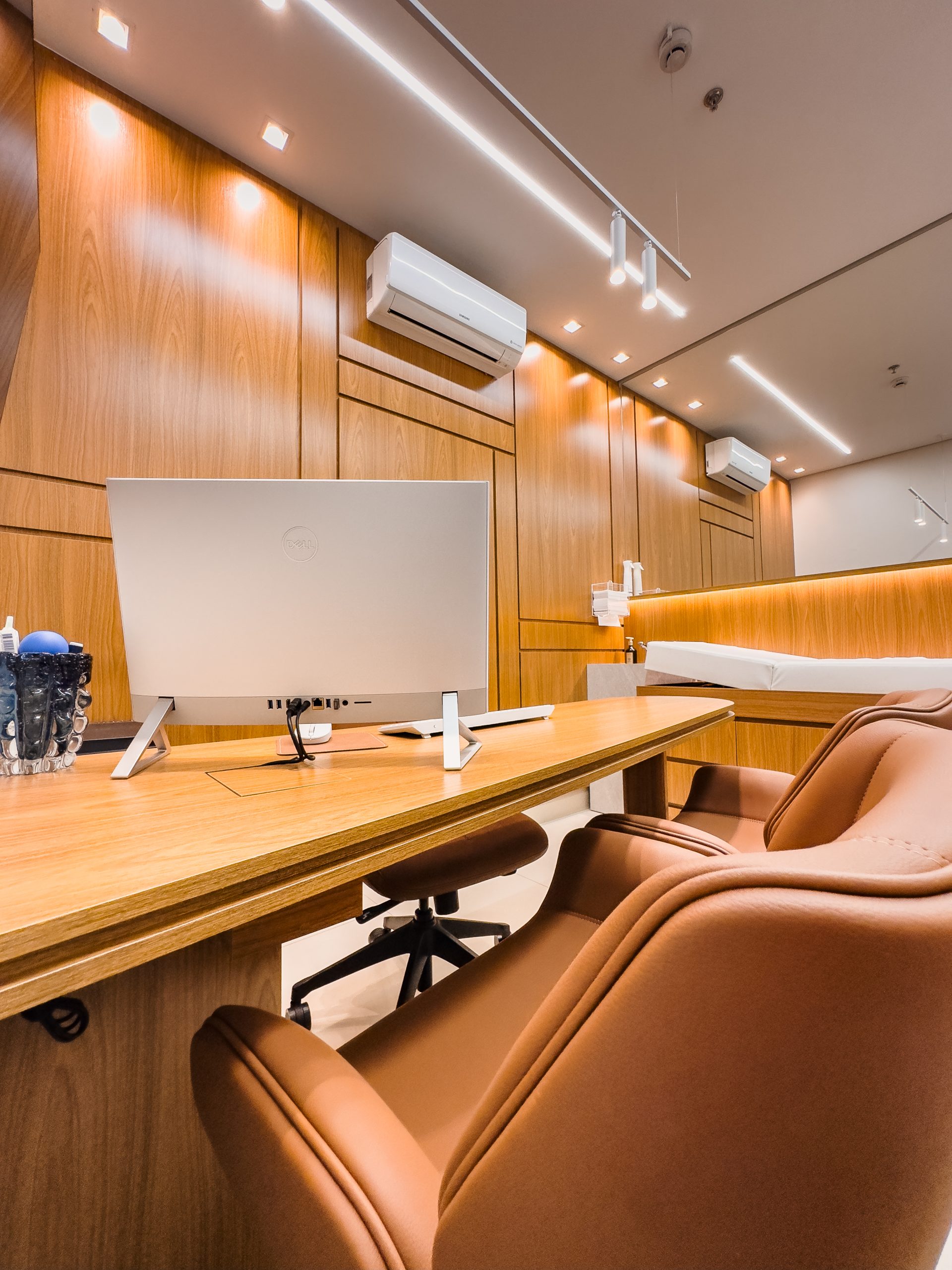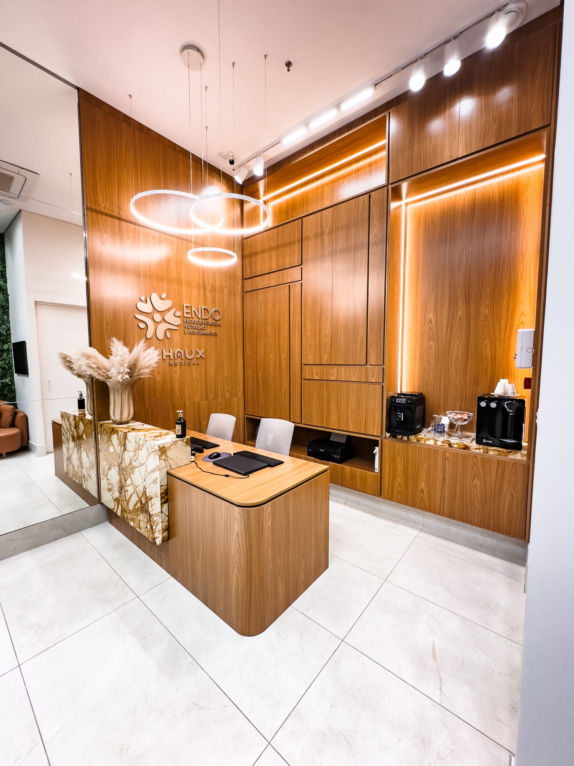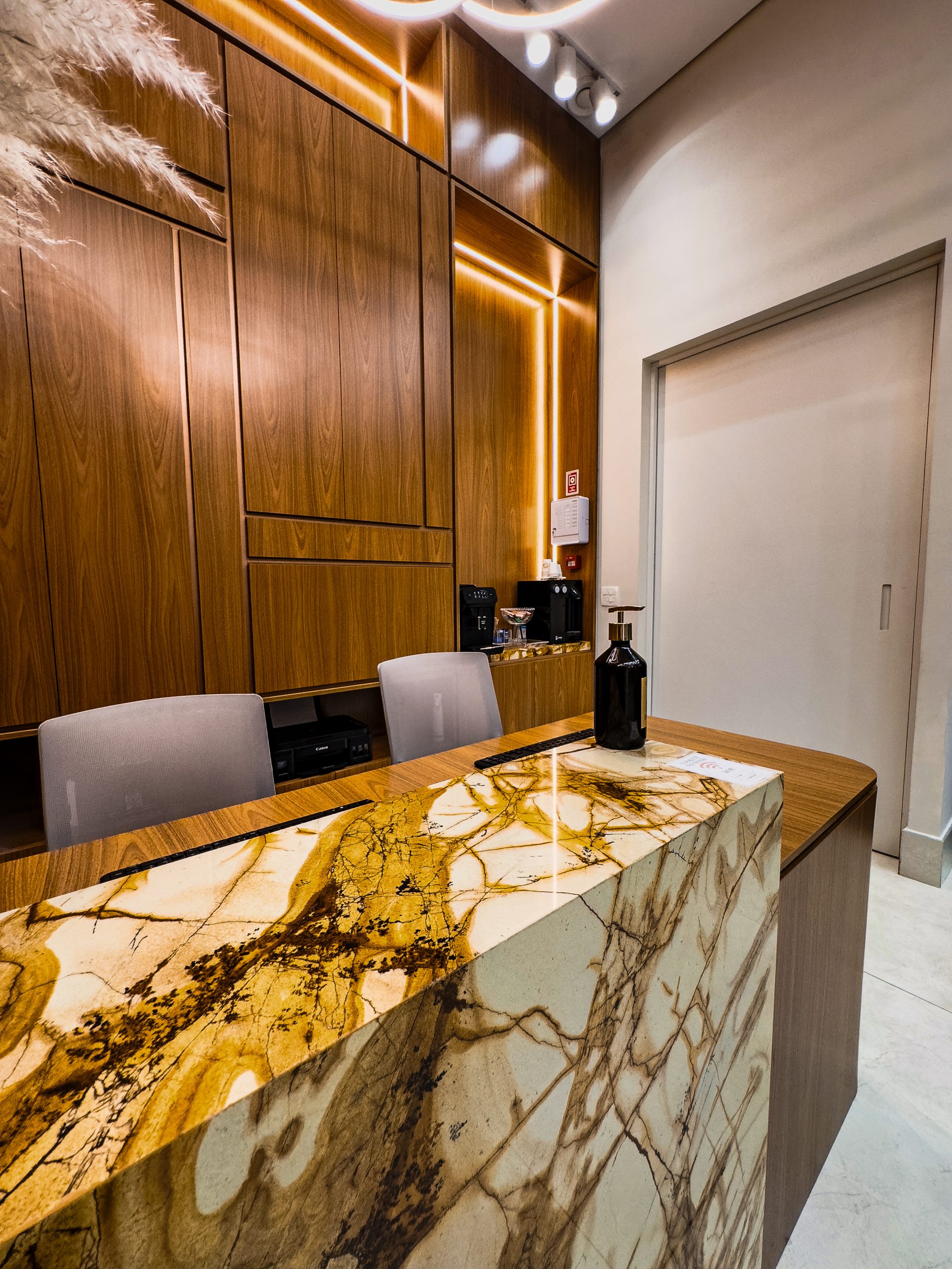 O Painel Integrado Áureo destaca como os móveis planejados transformam a recepção e o consultório em ambientes acolhedores, funcionais e sofisticados. A marcenaria em madeira envolve todo o espaço, criando continuidade visual e integrando nichos, portas camufladas e áreas de apoio com perfeição. A iluminação embutida valoriza os veios da madeira e reforça o tom elegante que acompanha o atendimento desde o primeiro contato.