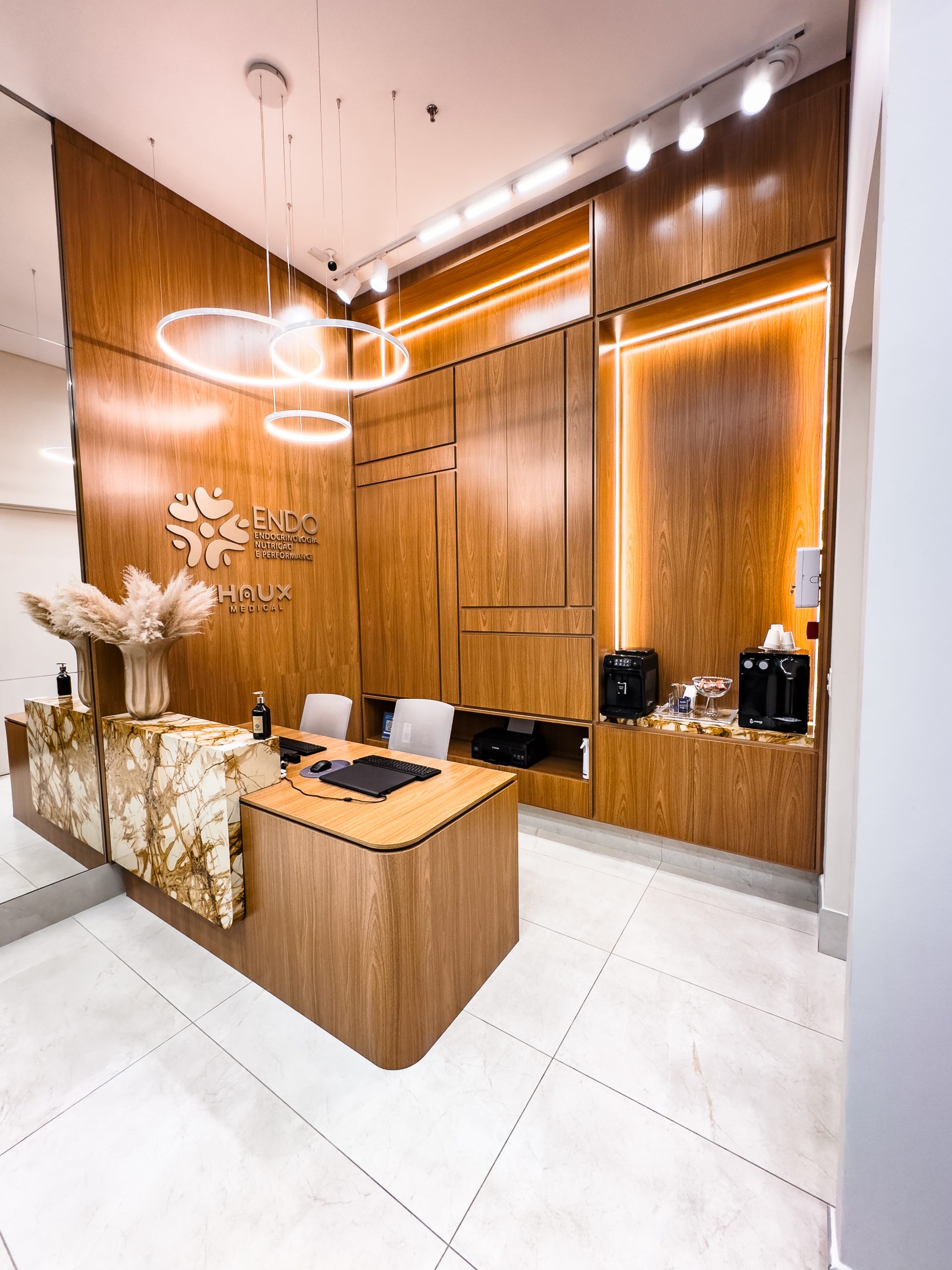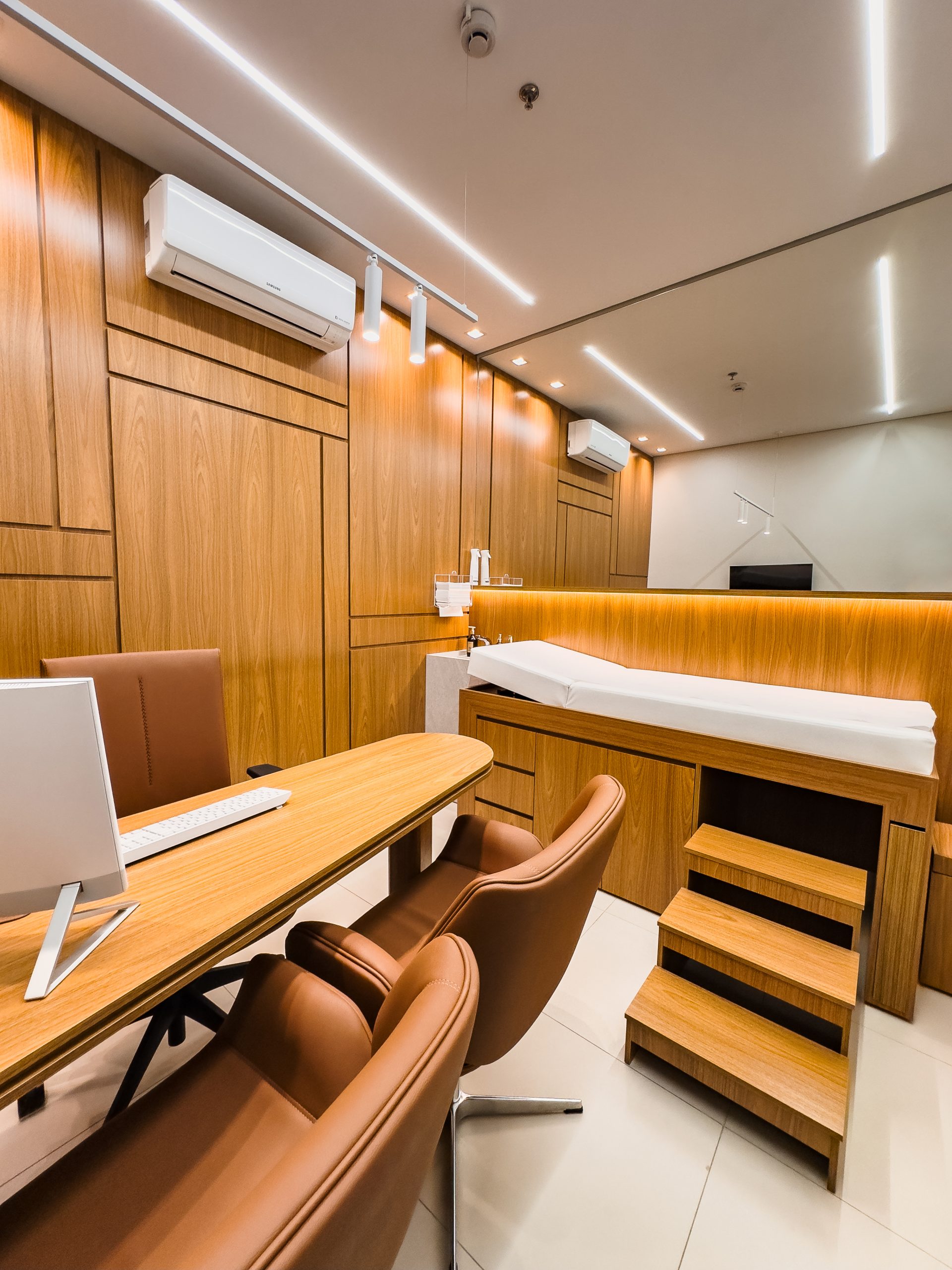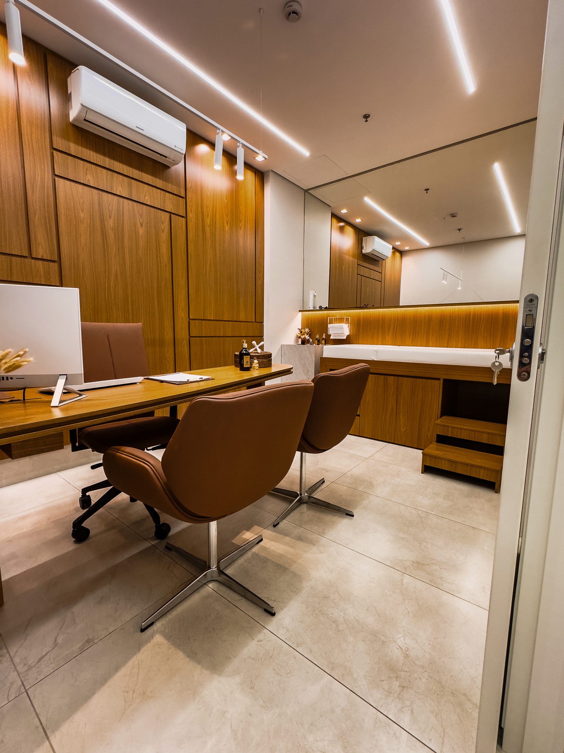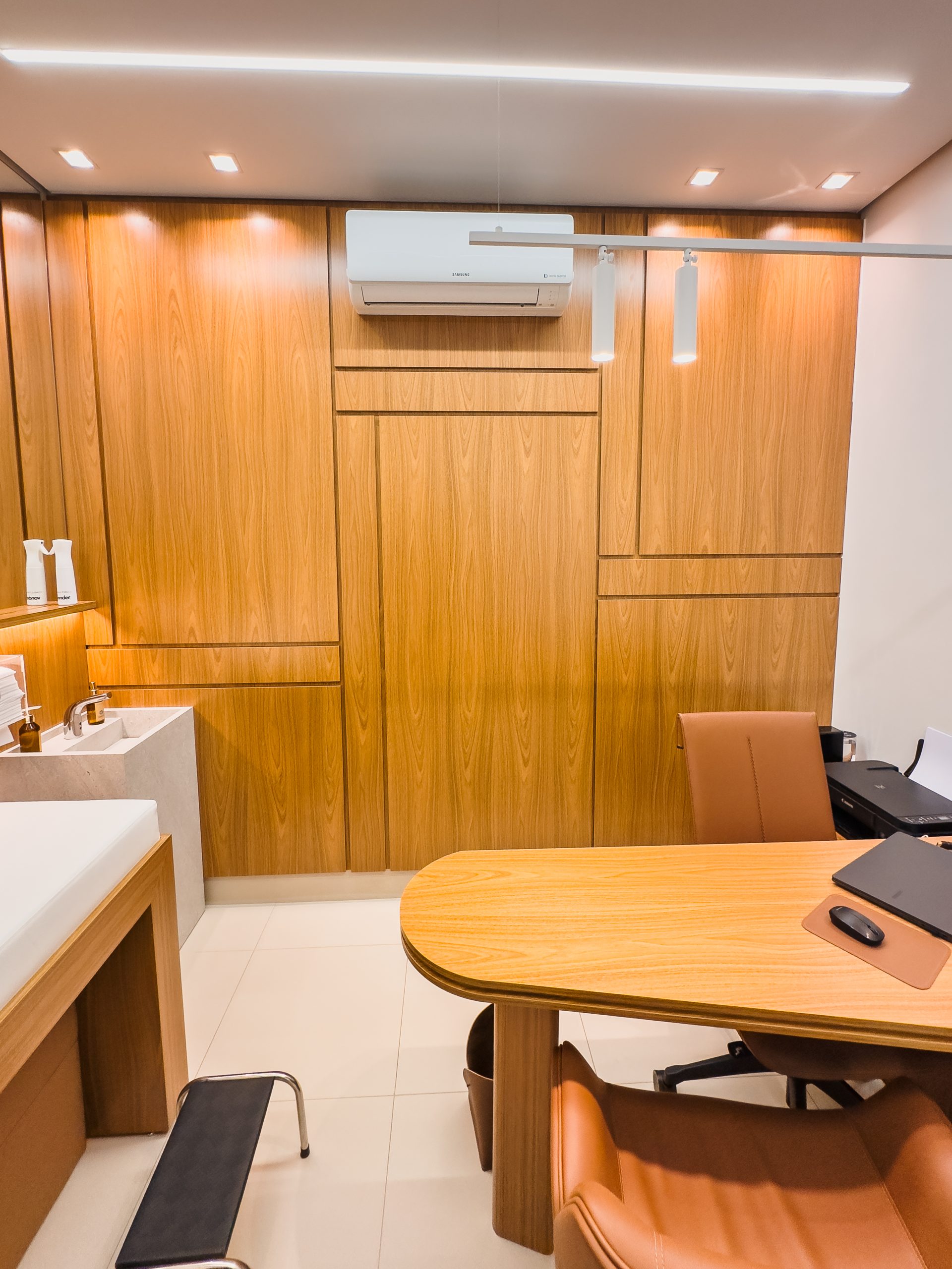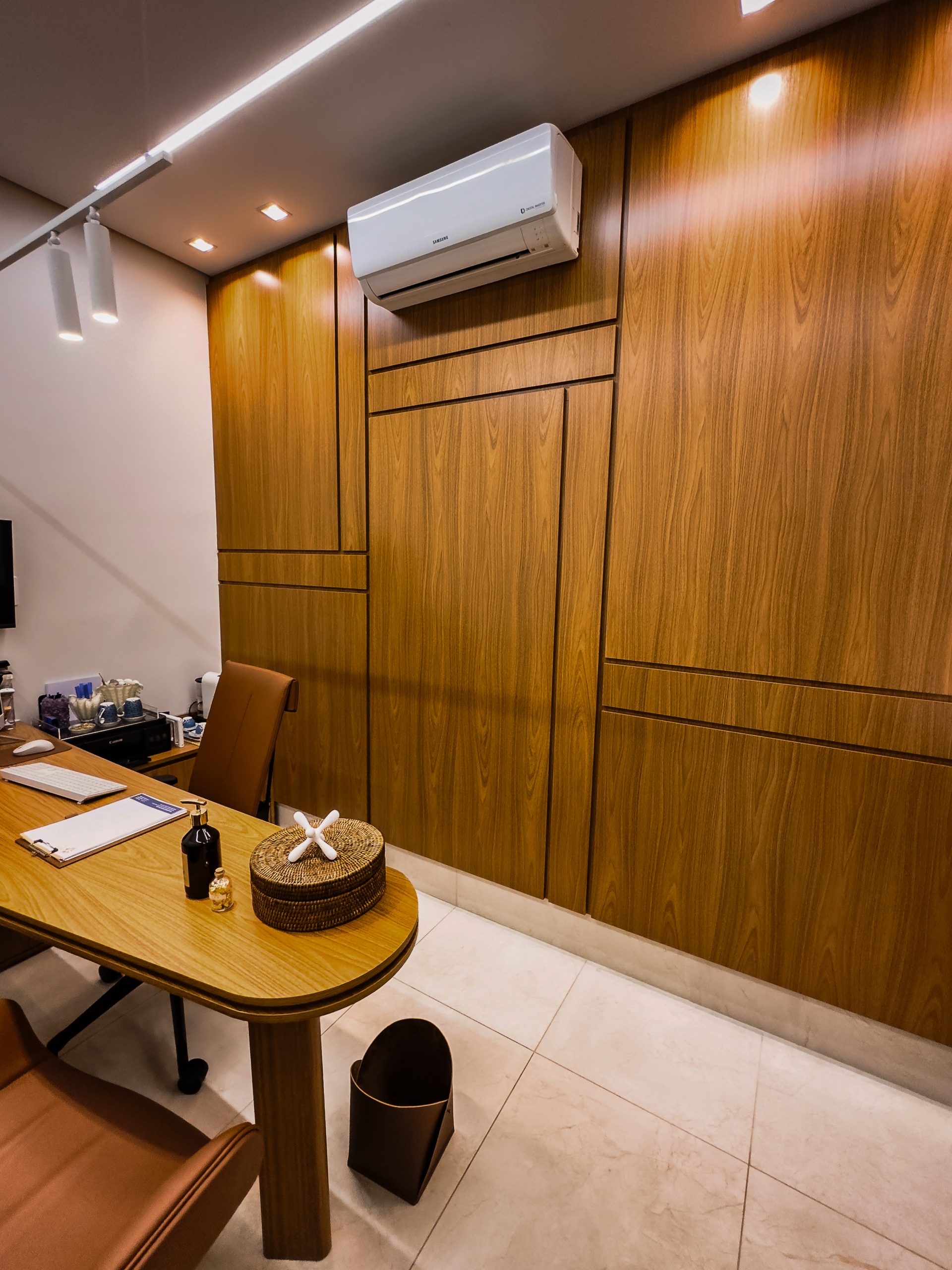 O Painel Integrado Áureo destaca como os móveis planejados transformam a recepção e o consultório em ambientes acolhedores, funcionais e sofisticados. A marcenaria em madeira envolve todo o espaço, criando continuidade visual e integrando nichos, portas camufladas e áreas de apoio com perfeição. A iluminação embutida valoriza os veios da madeira e reforça o tom elegante que acompanha o atendimento desde o primeiro contato.