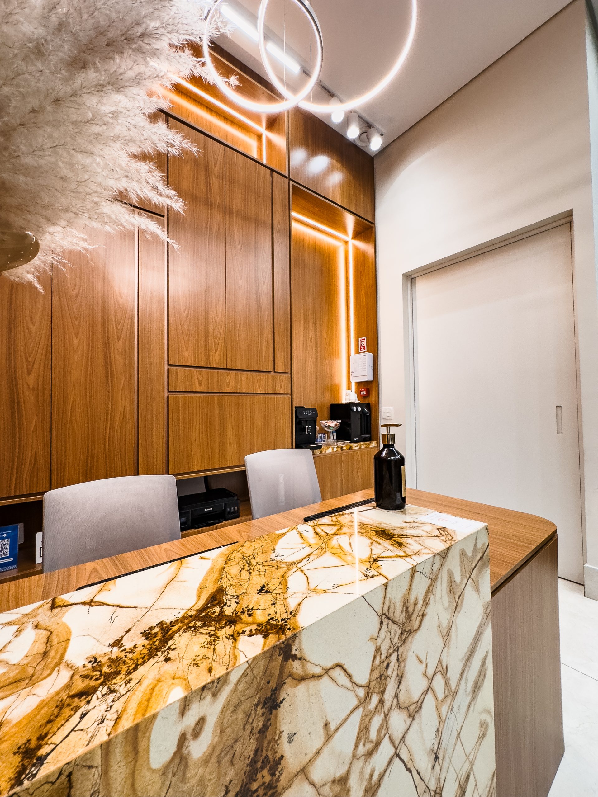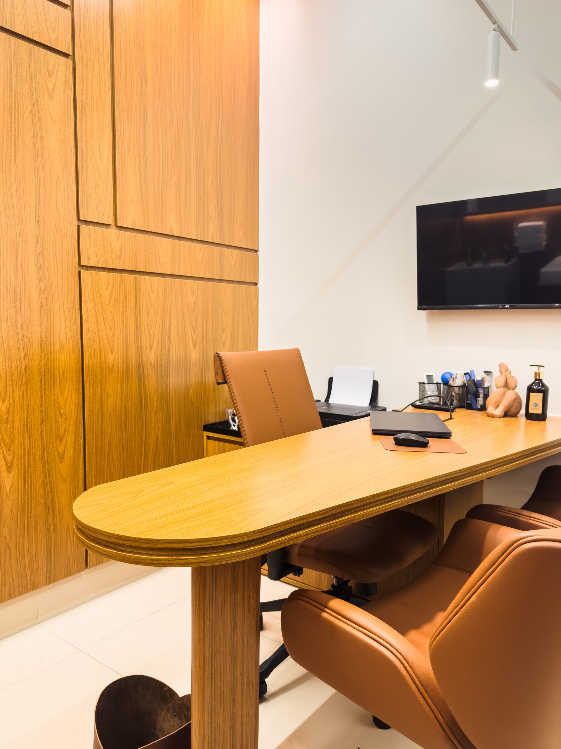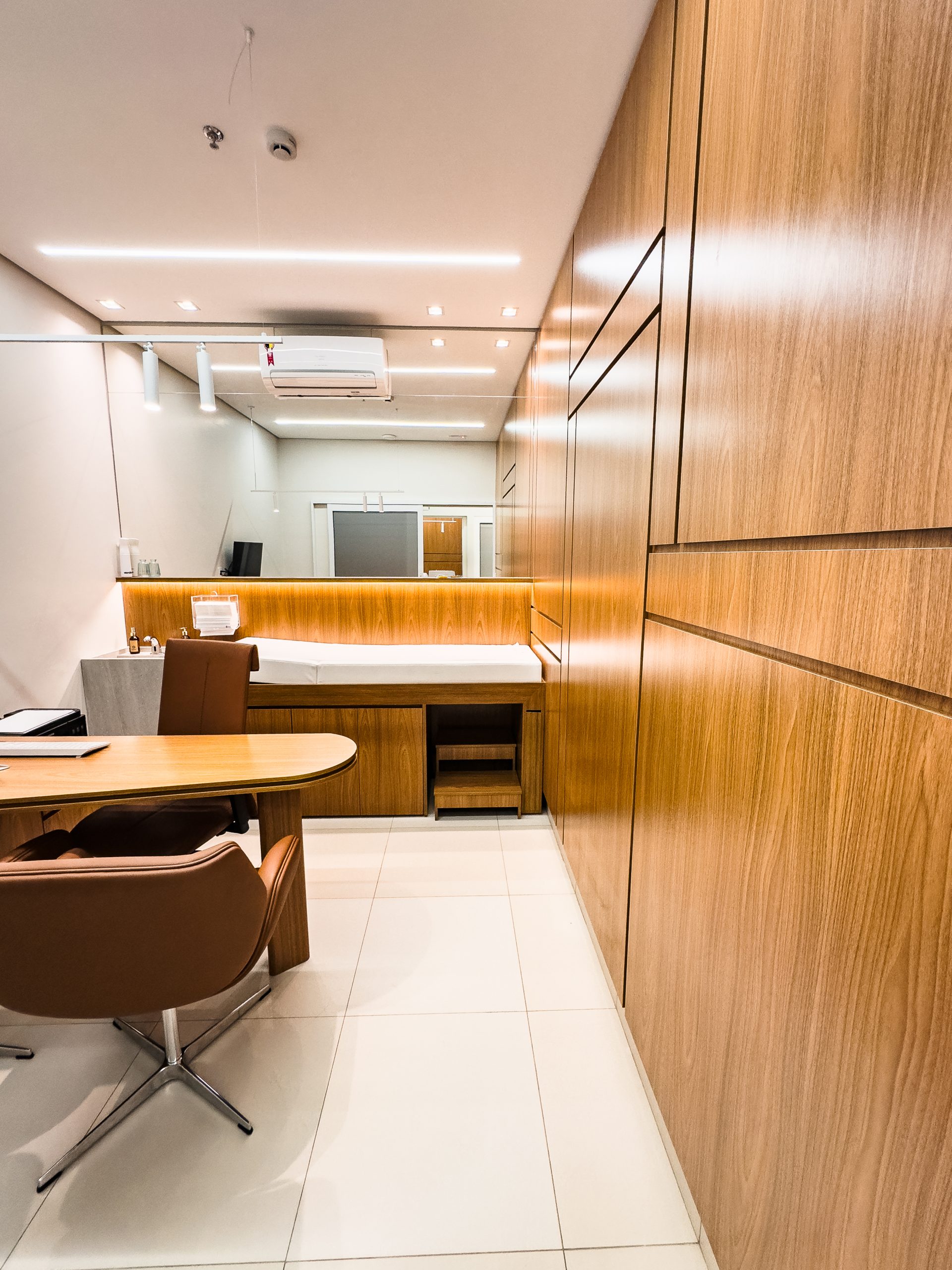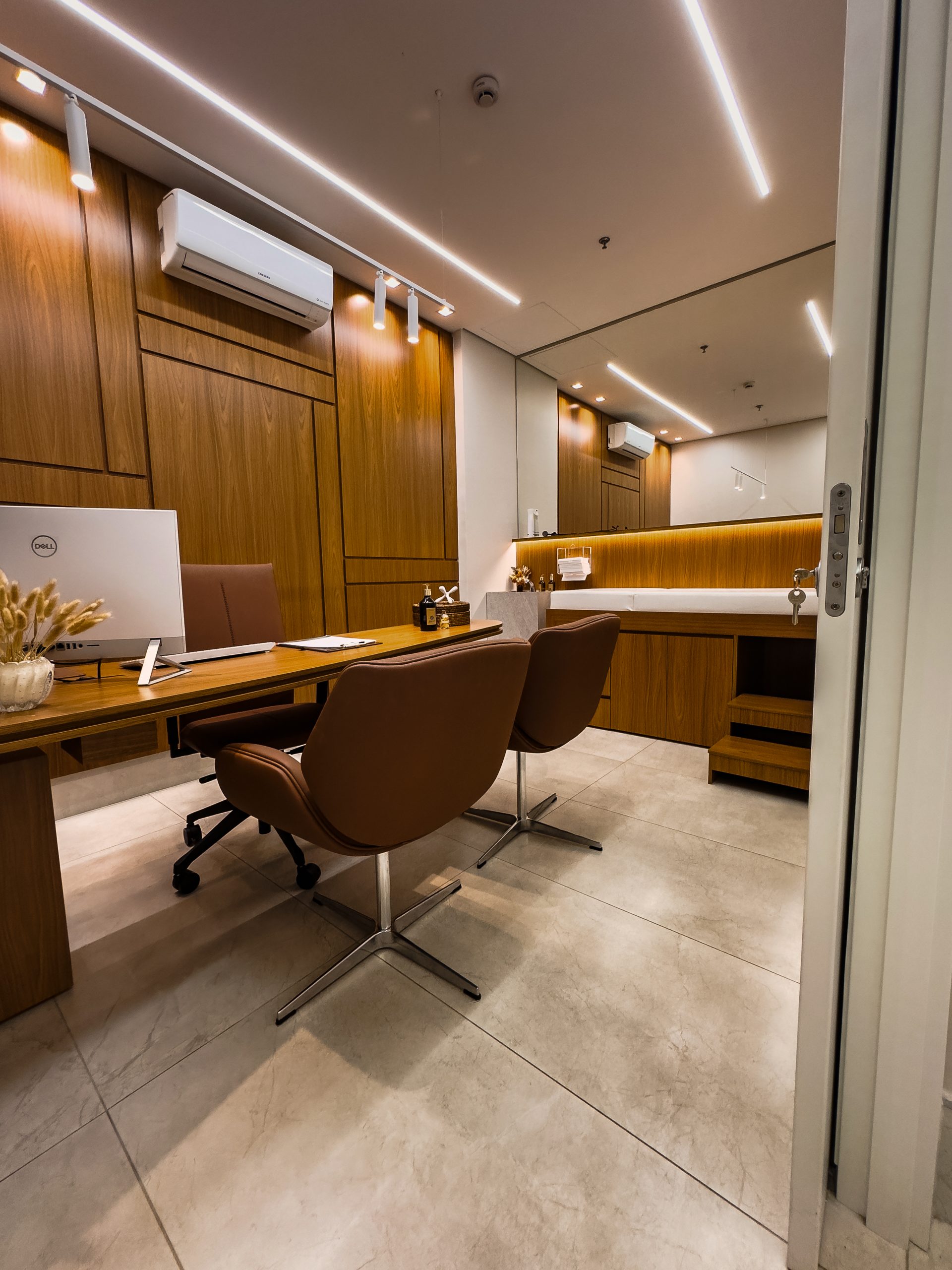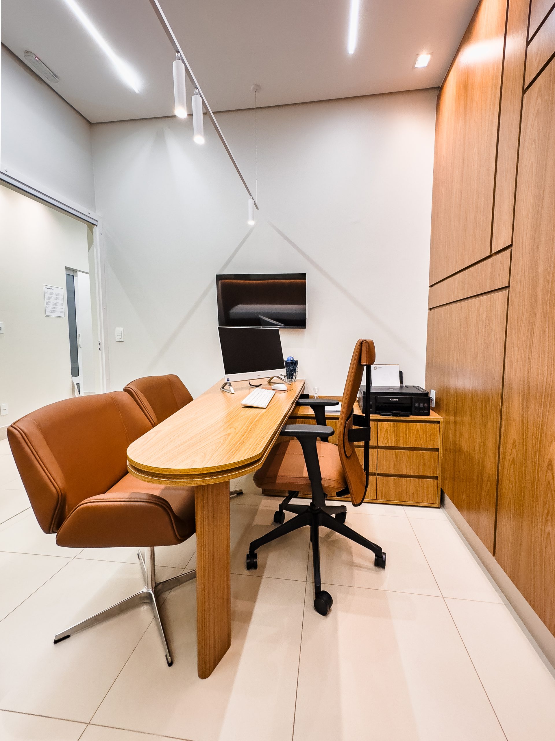 O Painel Integrado Áureo destaca como os móveis planejados transformam a recepção e o consultório em ambientes acolhedores, funcionais e sofisticados. A marcenaria em madeira envolve todo o espaço, criando continuidade visual e integrando nichos, portas camufladas e áreas de apoio com perfeição. A iluminação embutida valoriza os veios da madeira e reforça o tom elegante que acompanha o atendimento desde o primeiro contato.