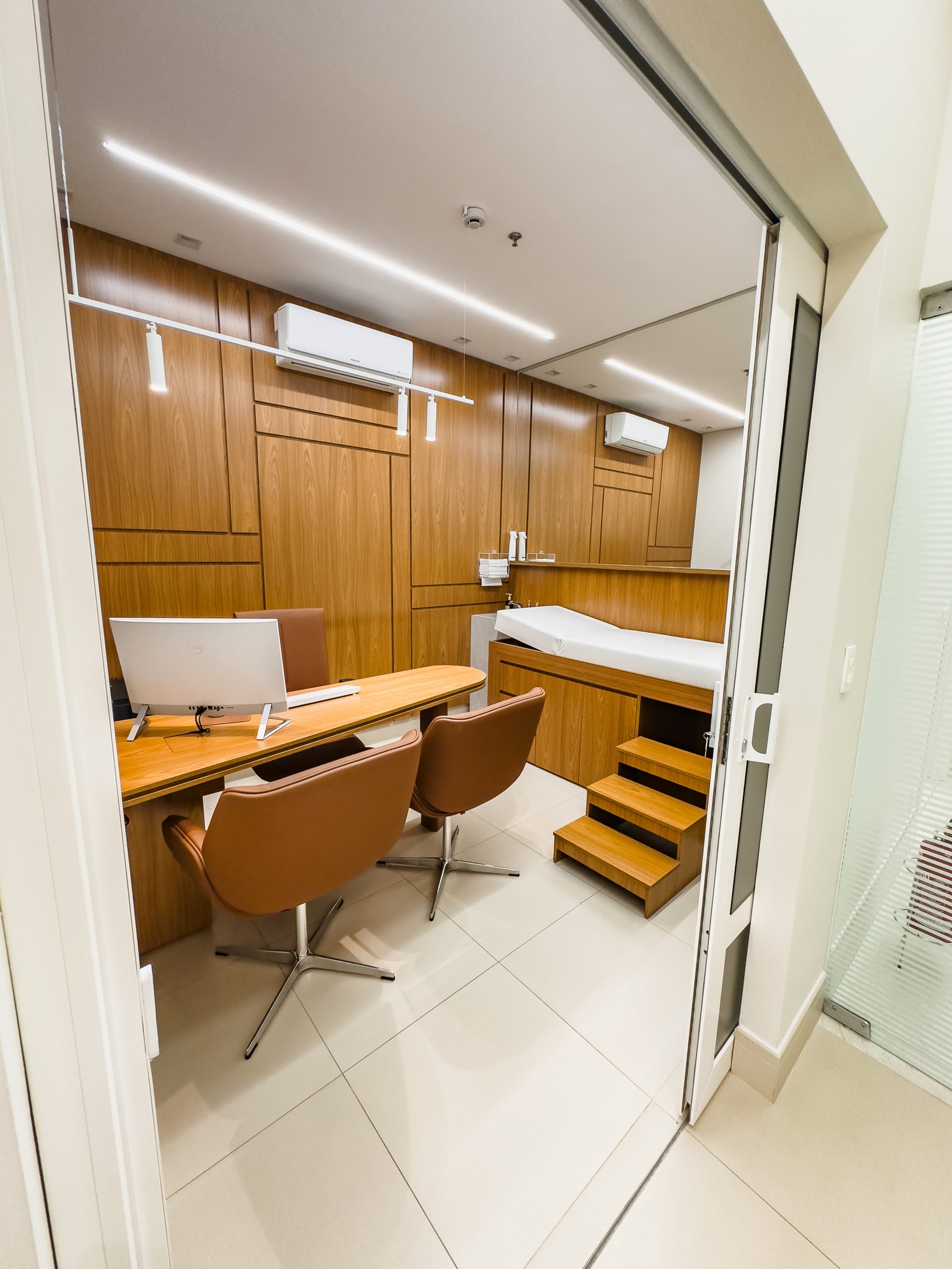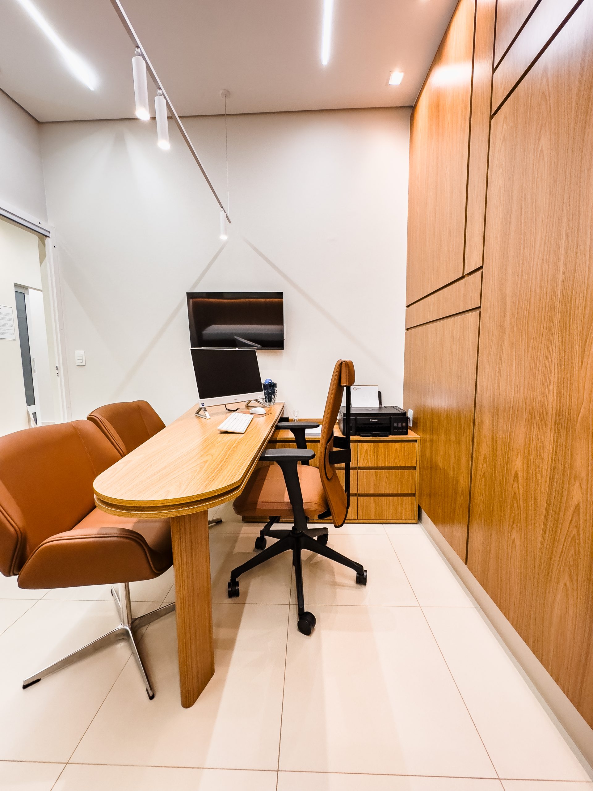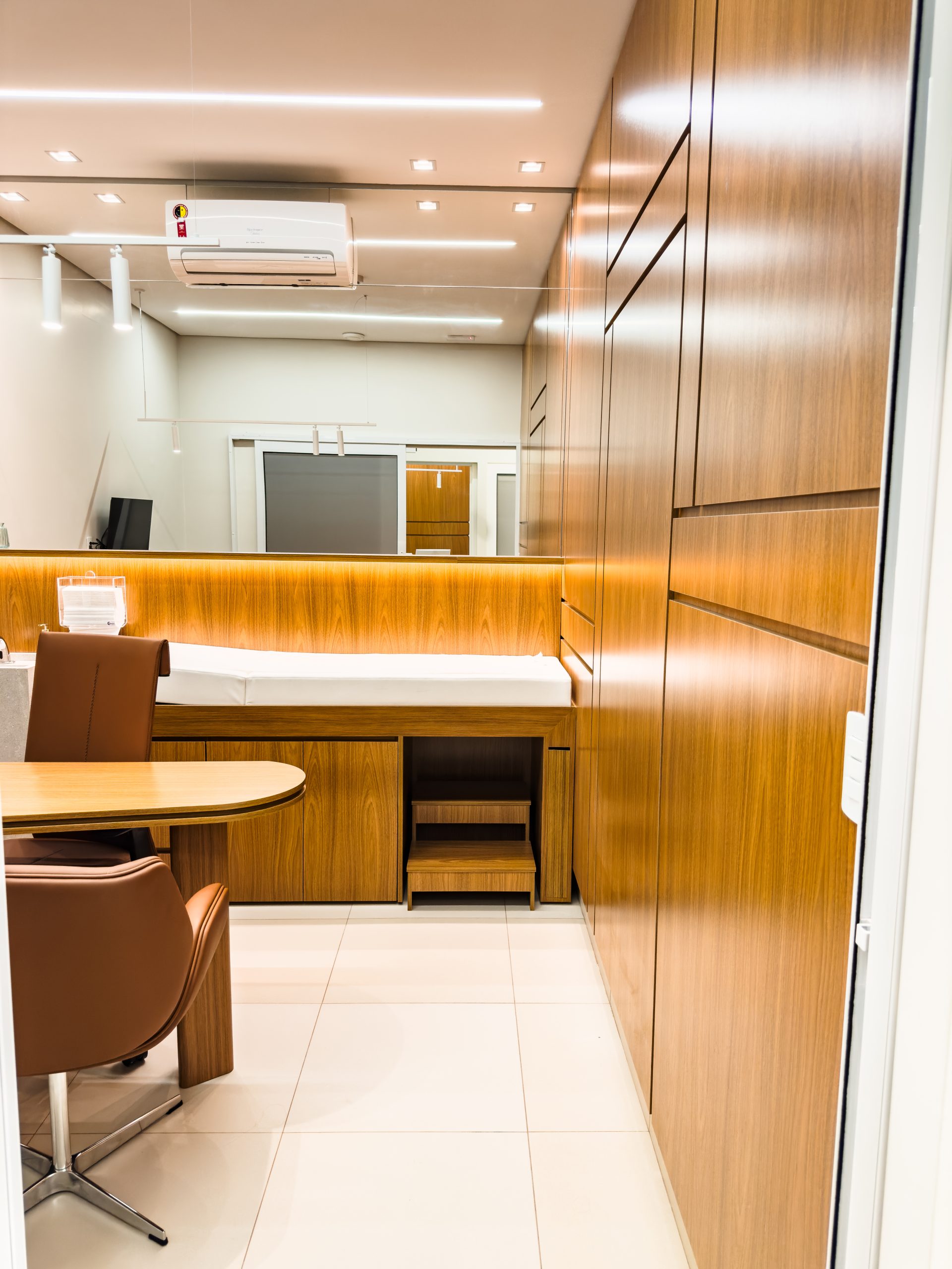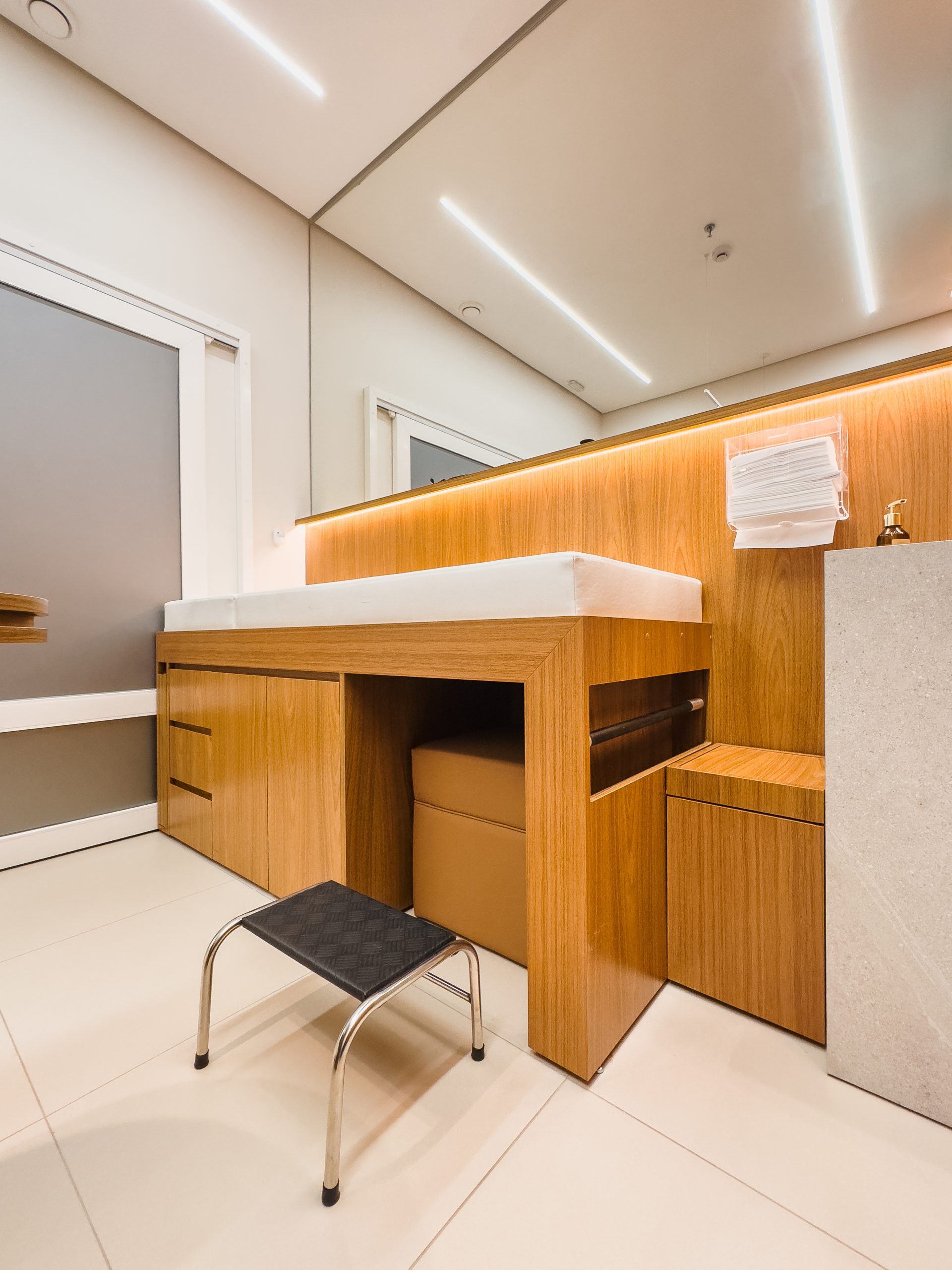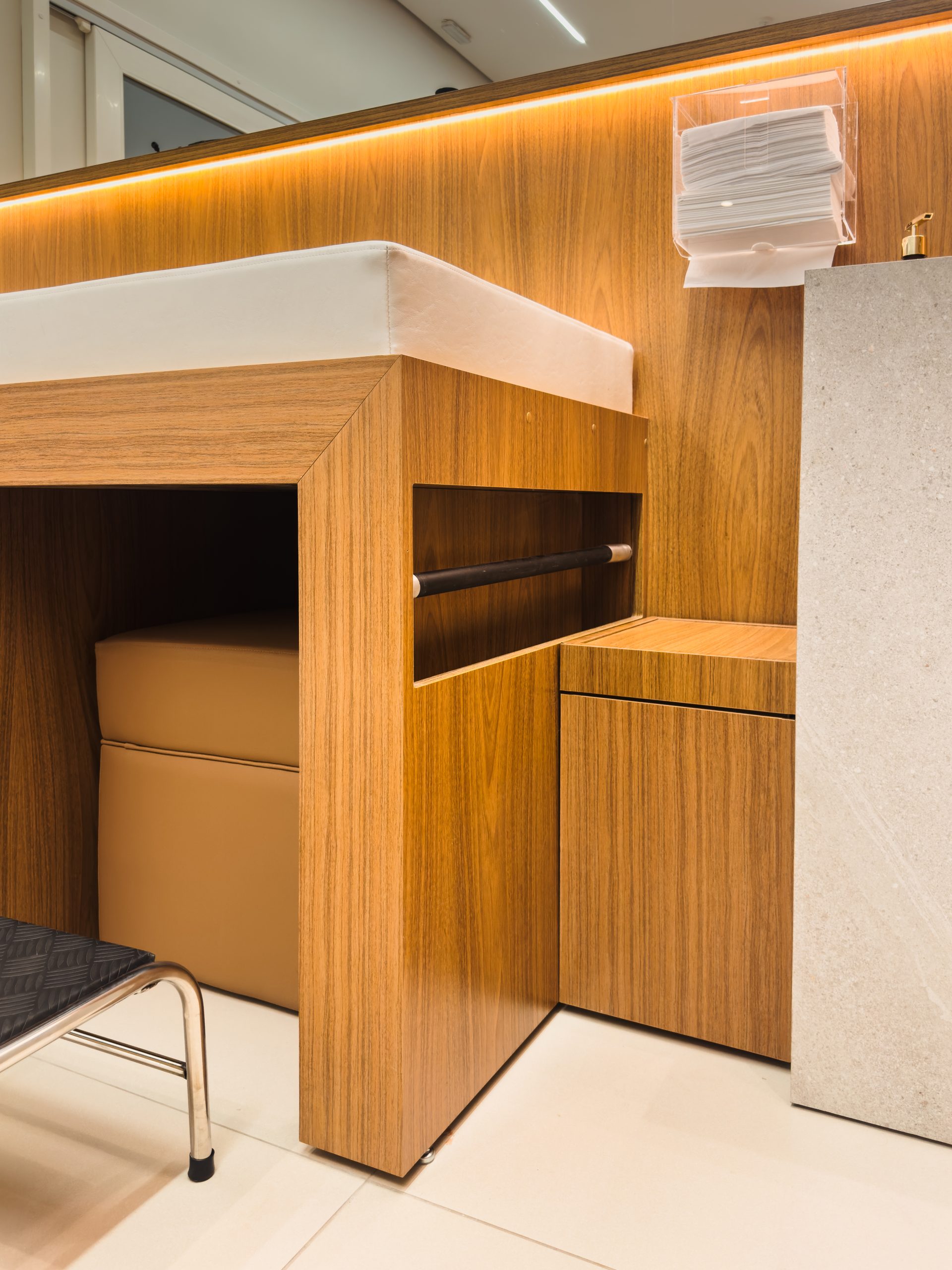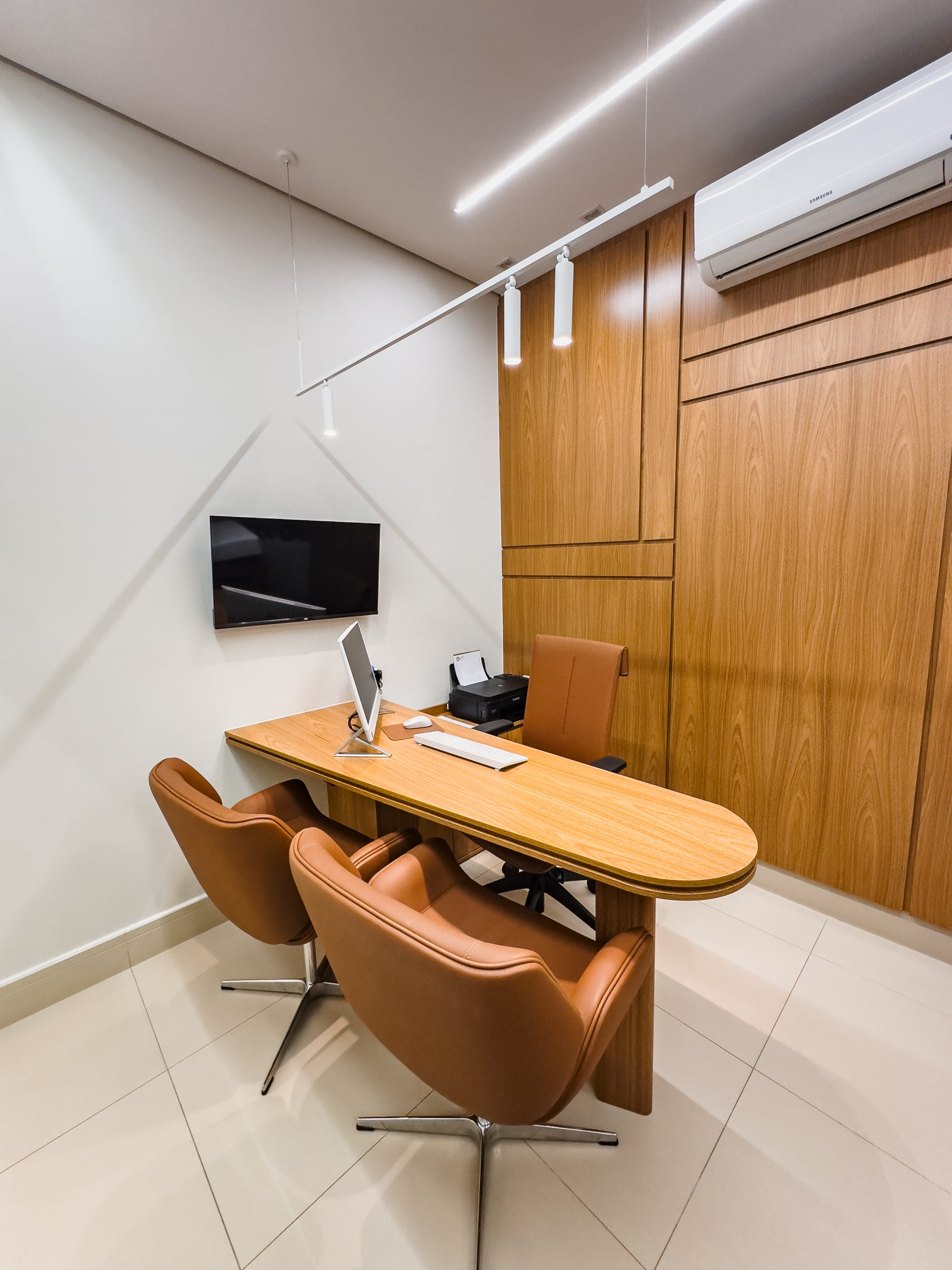 O Painel Integrado Áureo destaca como os móveis planejados transformam a recepção e o consultório em ambientes acolhedores, funcionais e sofisticados. A marcenaria em madeira envolve todo o espaço, criando continuidade visual e integrando nichos, portas camufladas e áreas de apoio com perfeição. A iluminação embutida valoriza os veios da madeira e reforça o tom elegante que acompanha o atendimento desde o primeiro contato.
