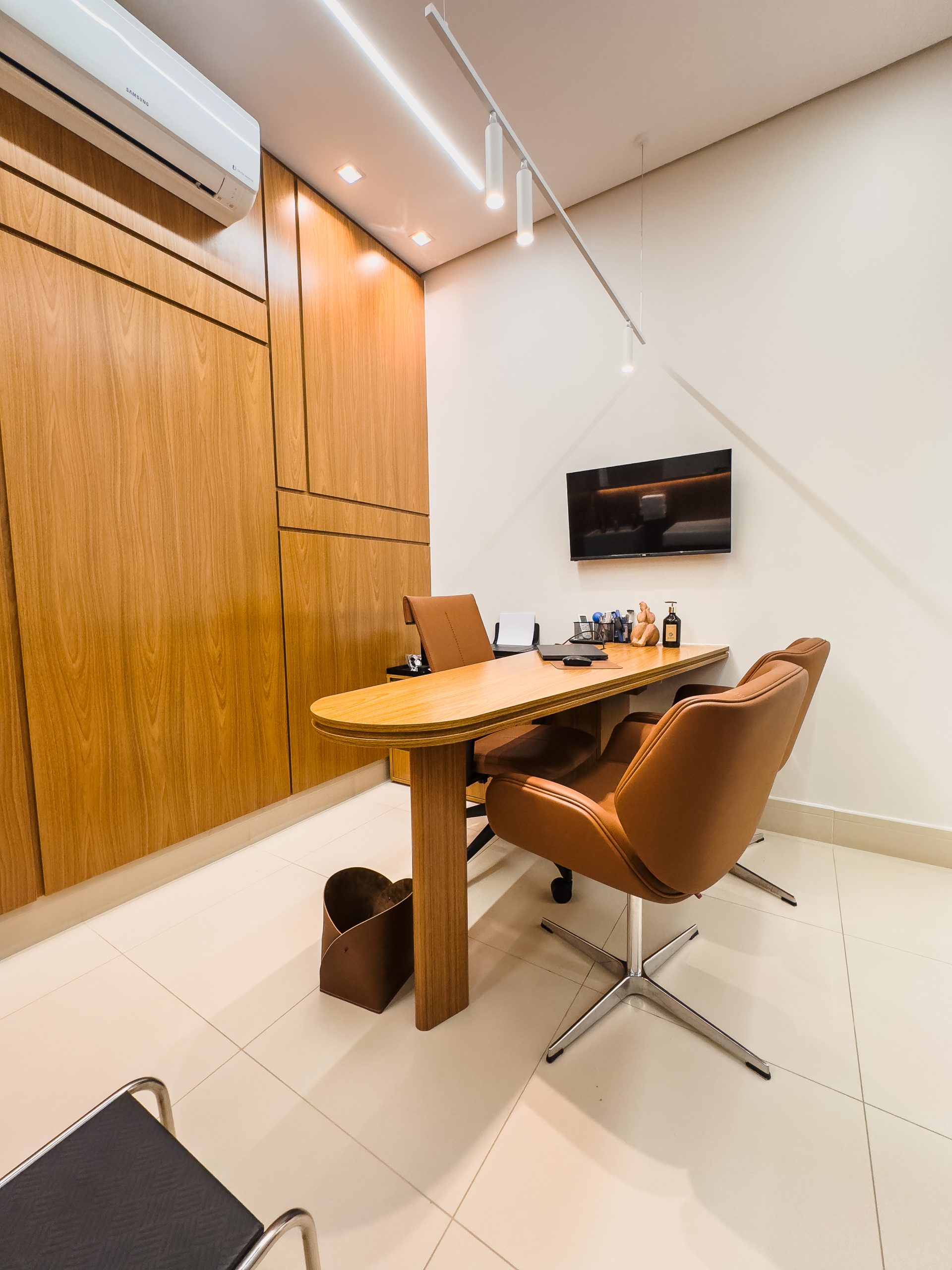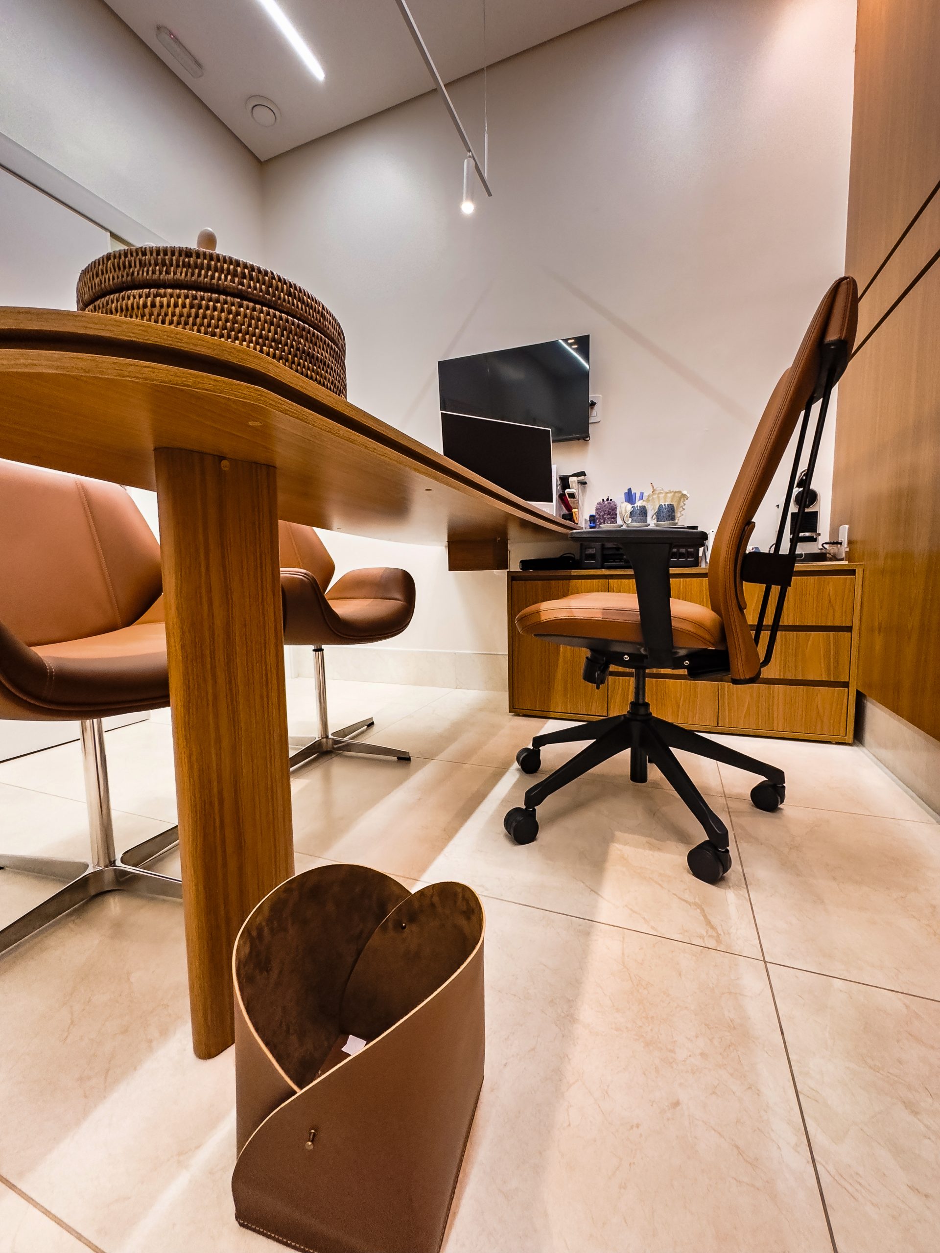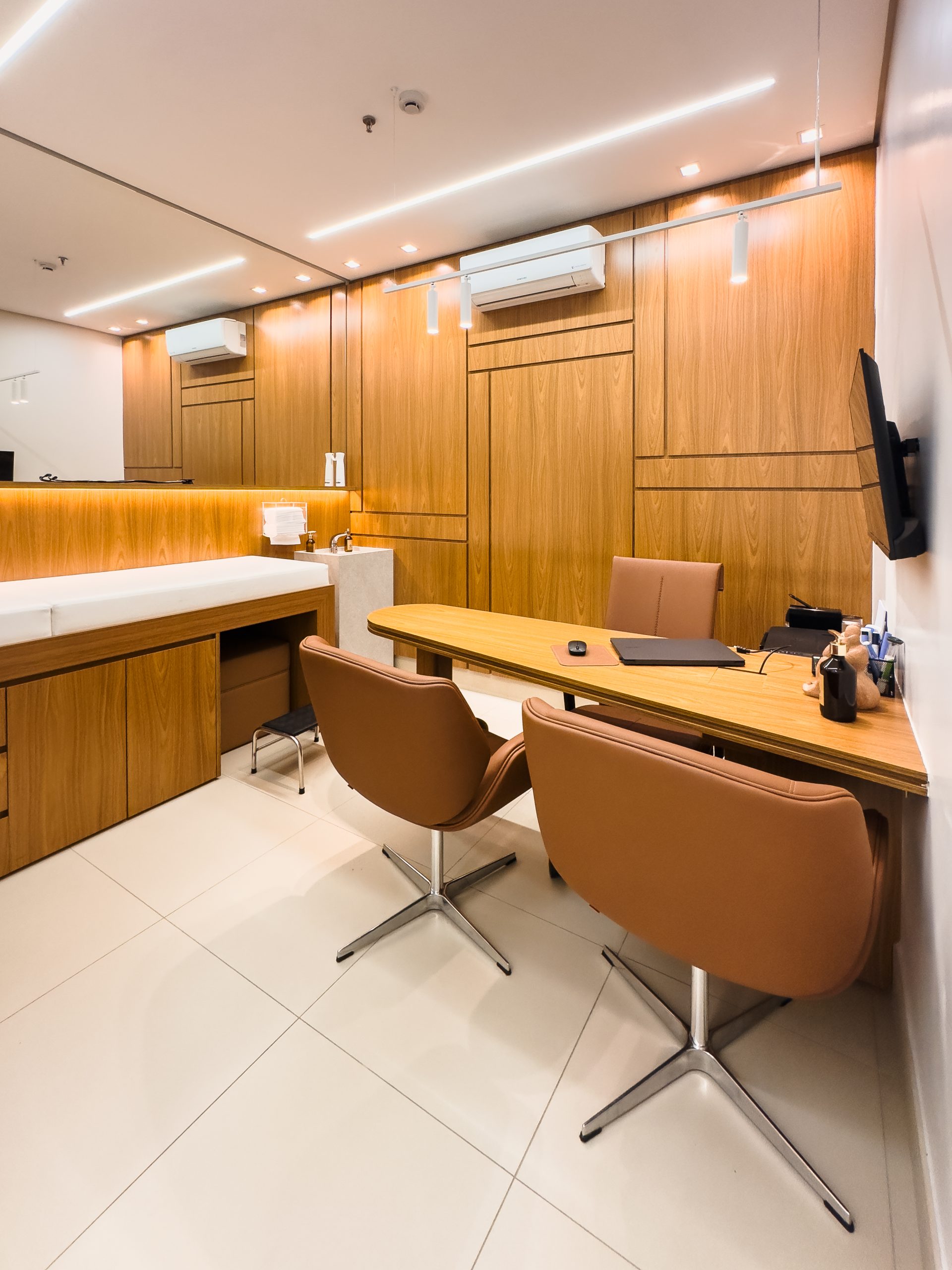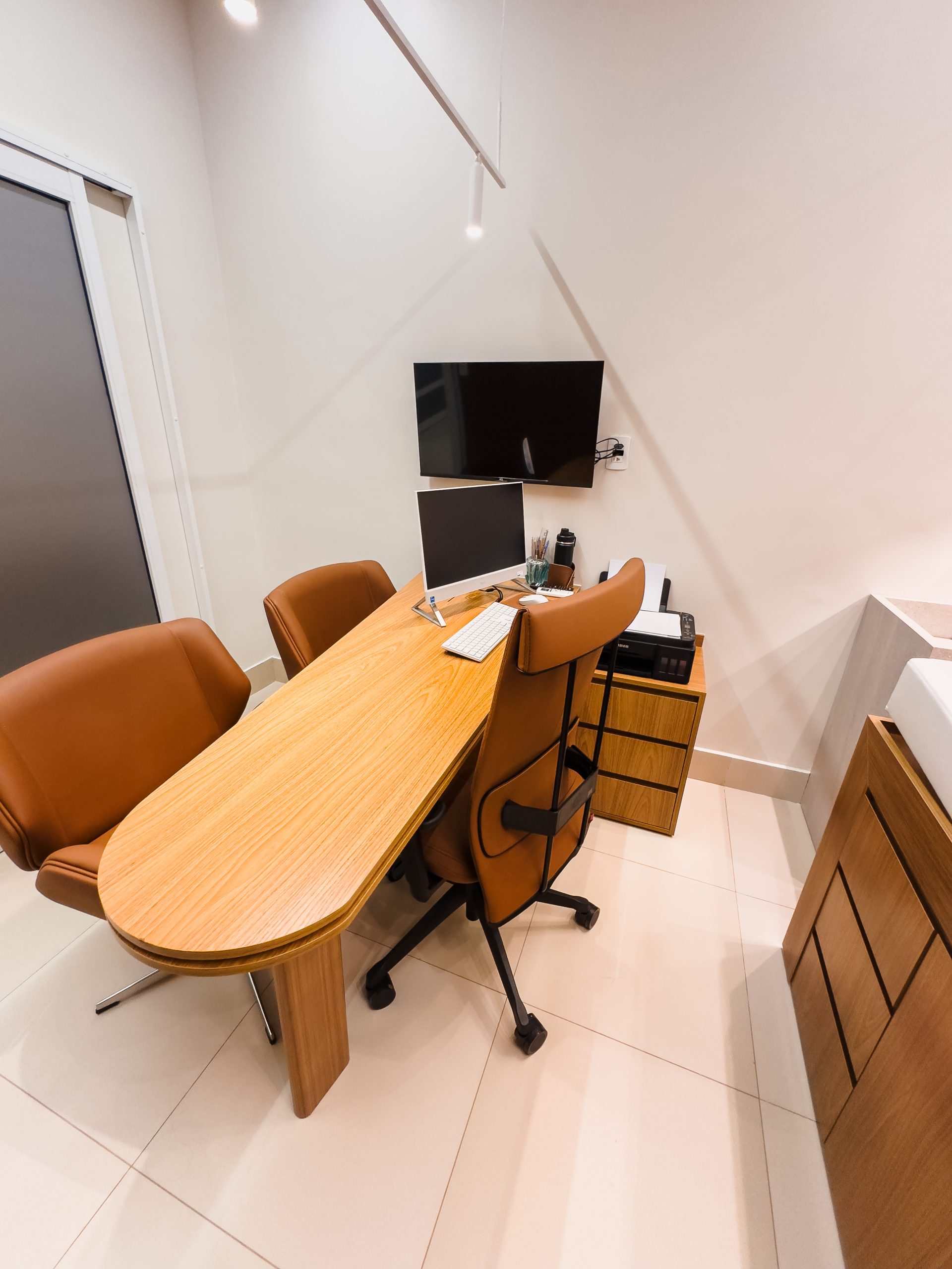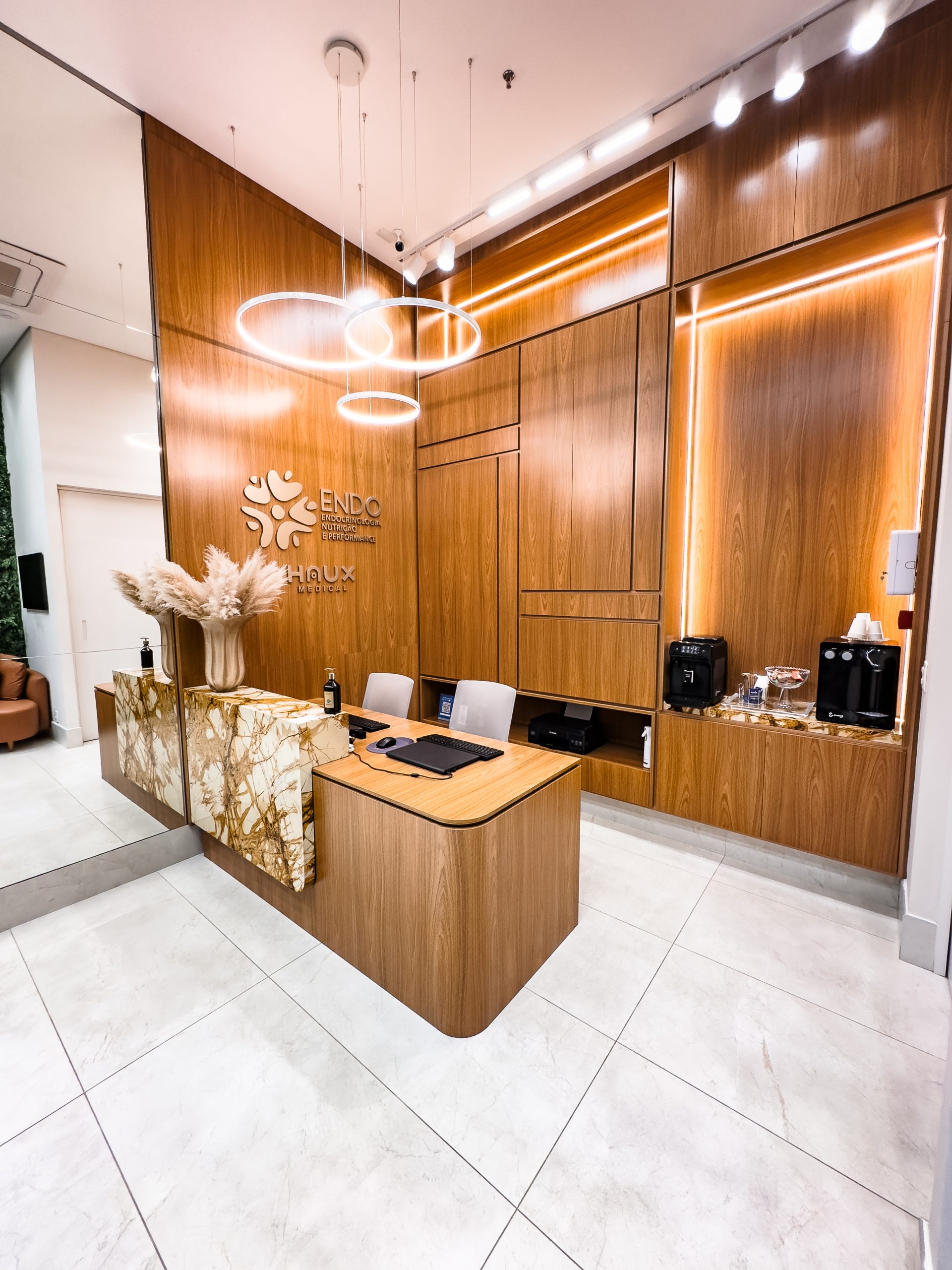 O Painel Integrado Áureo destaca como os móveis planejados transformam a recepção e o consultório em ambientes acolhedores, funcionais e sofisticados. A marcenaria em madeira envolve todo o espaço, criando continuidade visual e integrando nichos, portas camufladas e áreas de apoio com perfeição. A iluminação embutida valoriza os veios da madeira e reforça o tom elegante que acompanha o atendimento desde o primeiro contato.