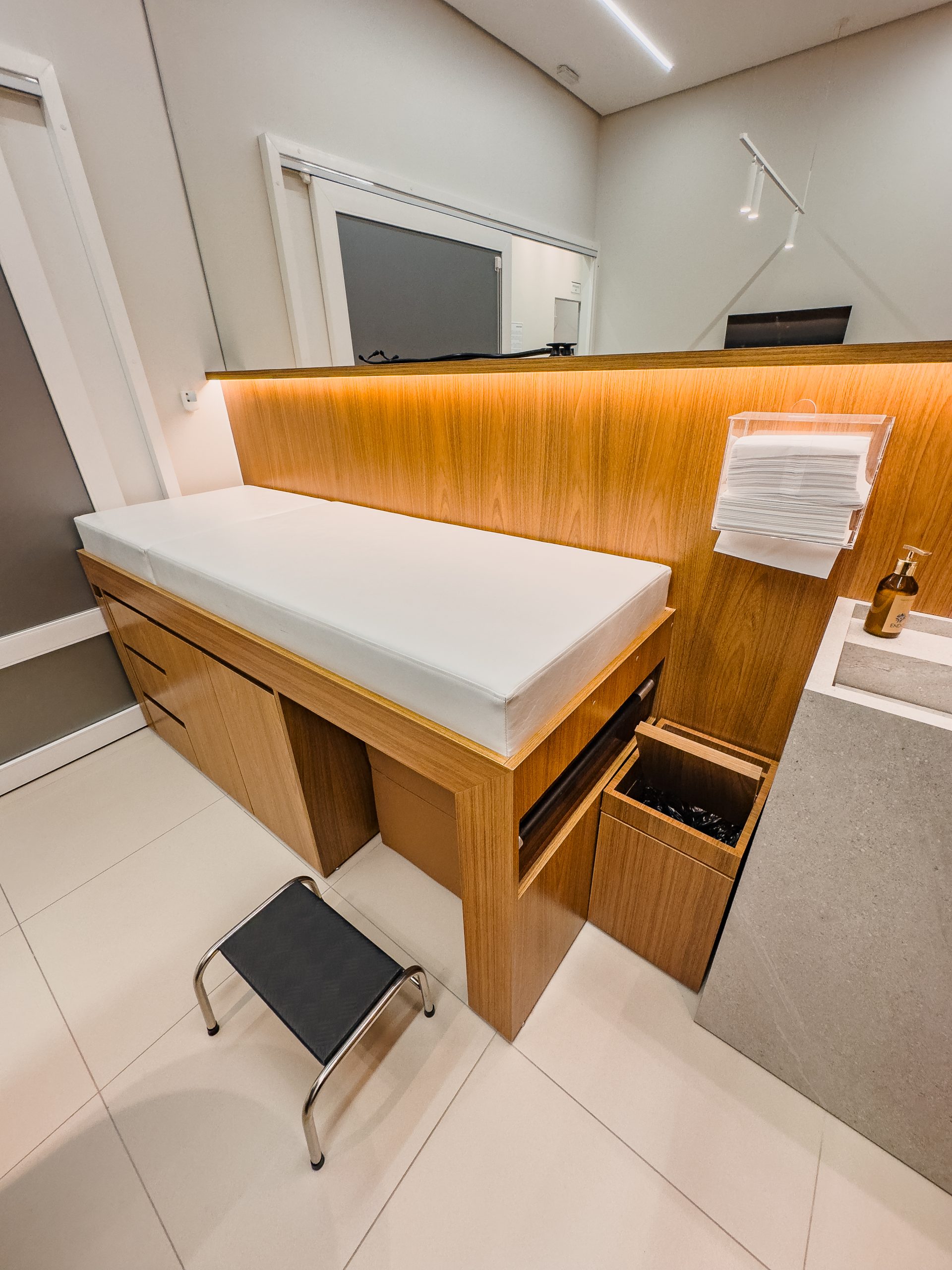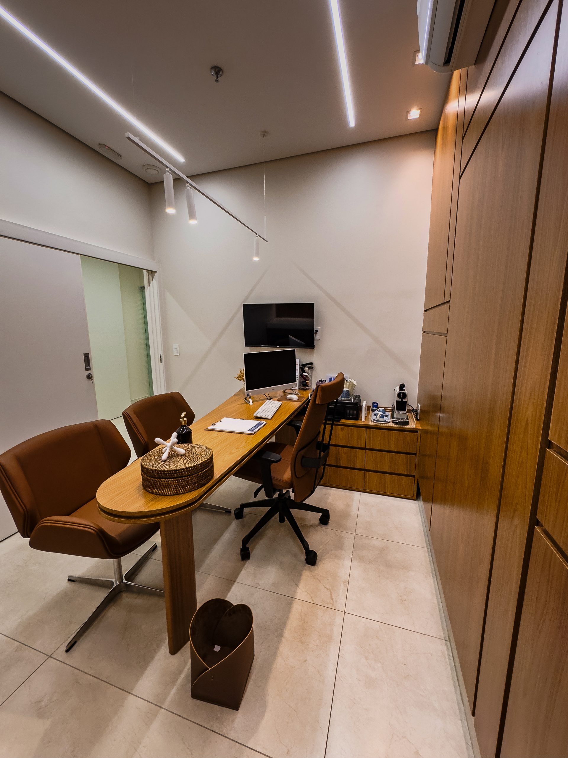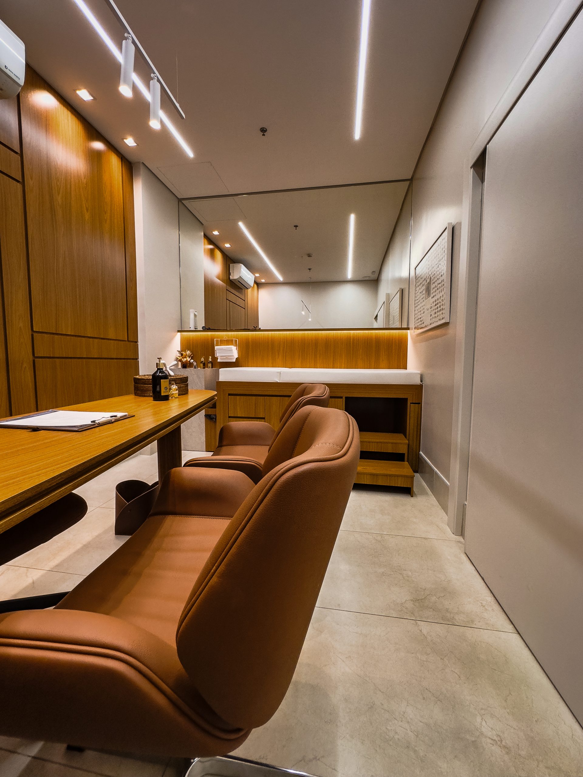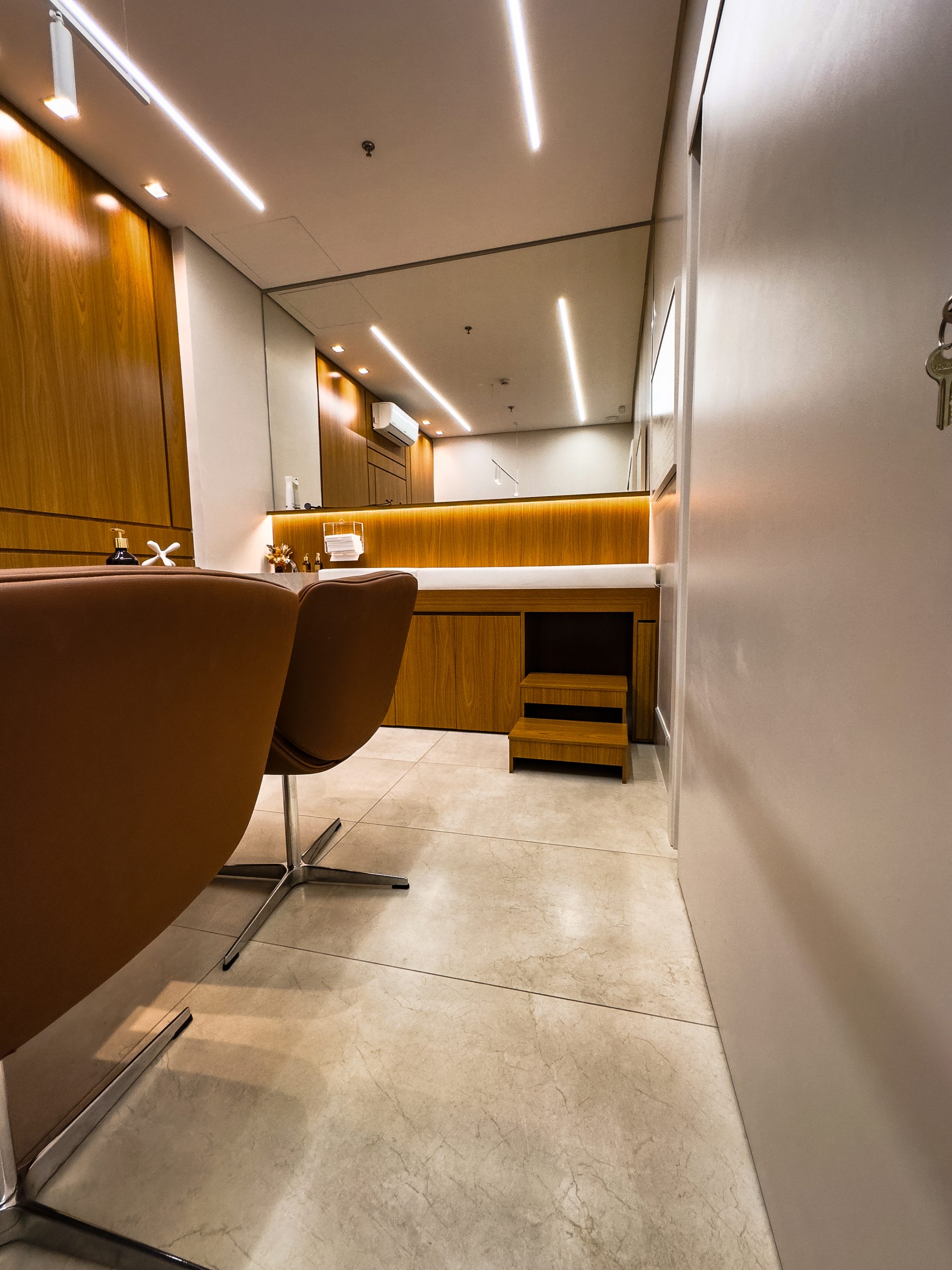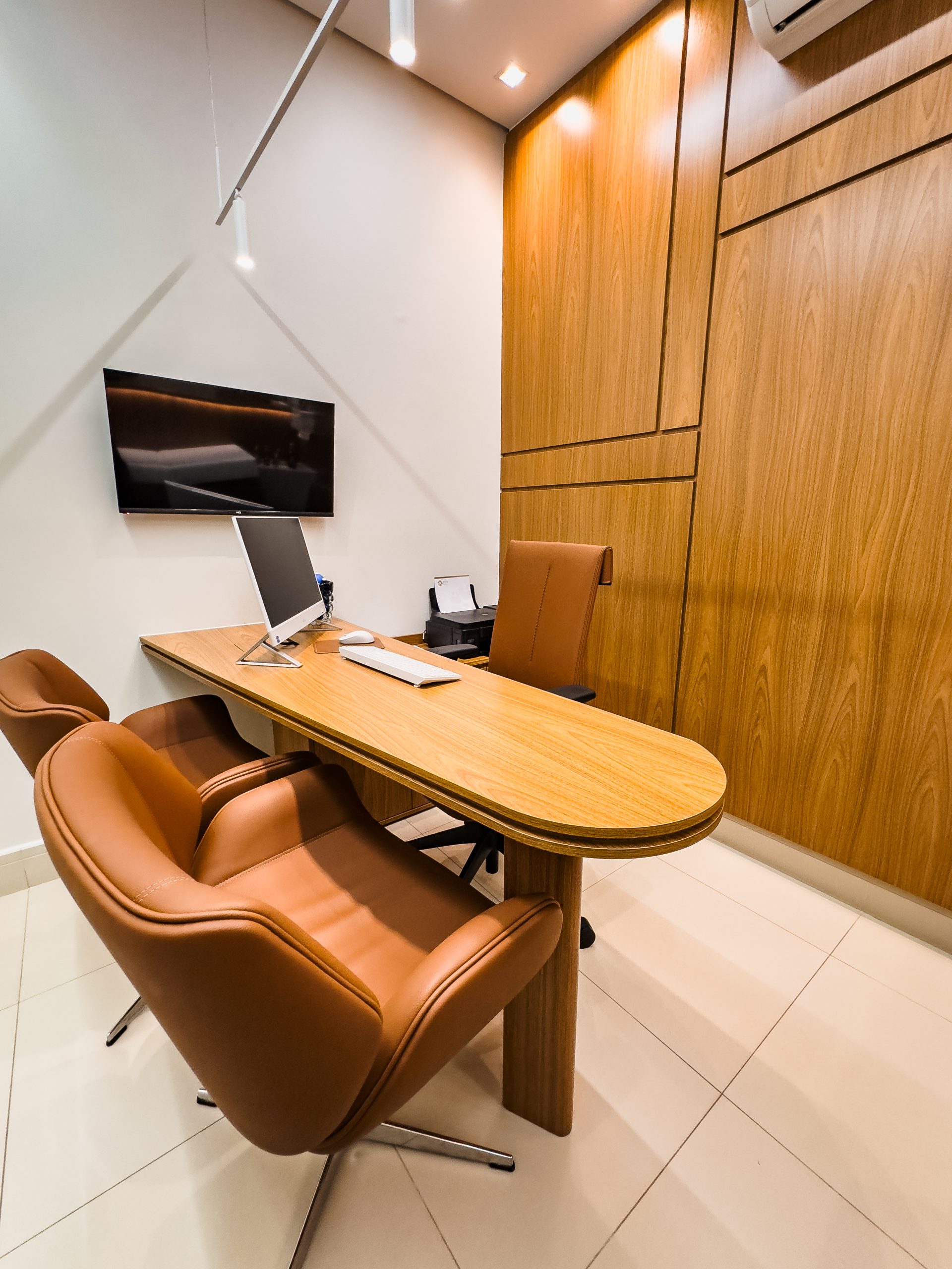 O Painel Integrado Áureo destaca como os móveis planejados transformam a recepção e o consultório em ambientes acolhedores, funcionais e sofisticados. A marcenaria em madeira envolve todo o espaço, criando continuidade visual e integrando nichos, portas camufladas e áreas de apoio com perfeição. A iluminação embutida valoriza os veios da madeira e reforça o tom elegante que acompanha o atendimento desde o primeiro contato.