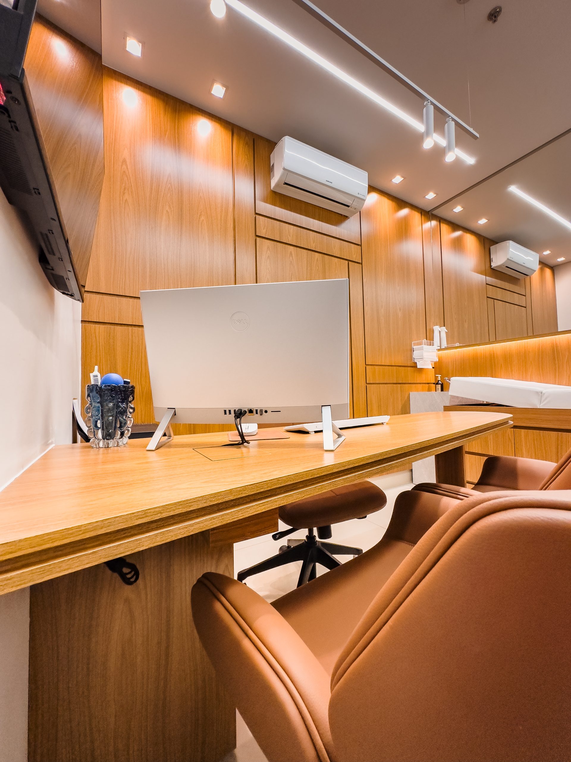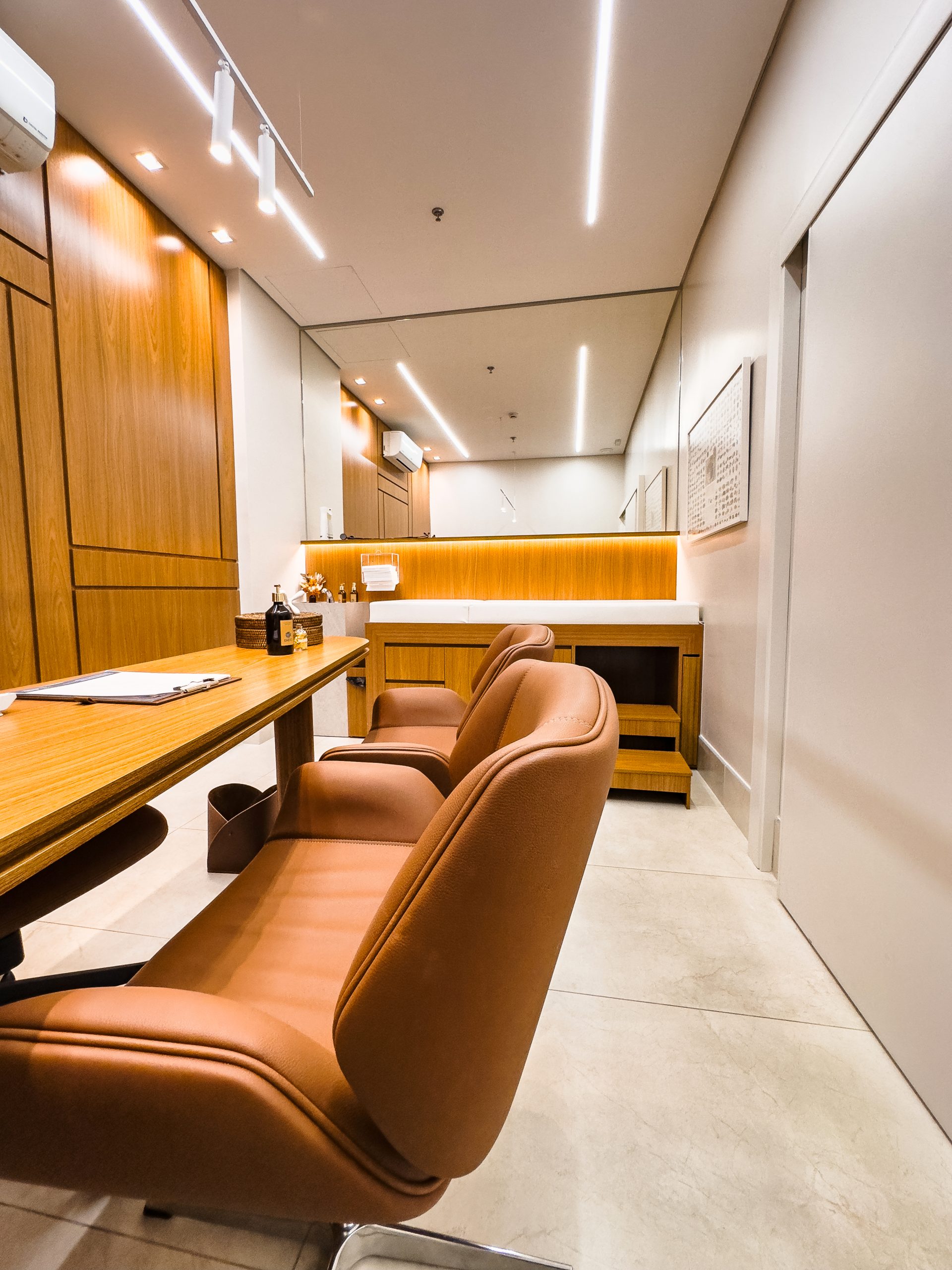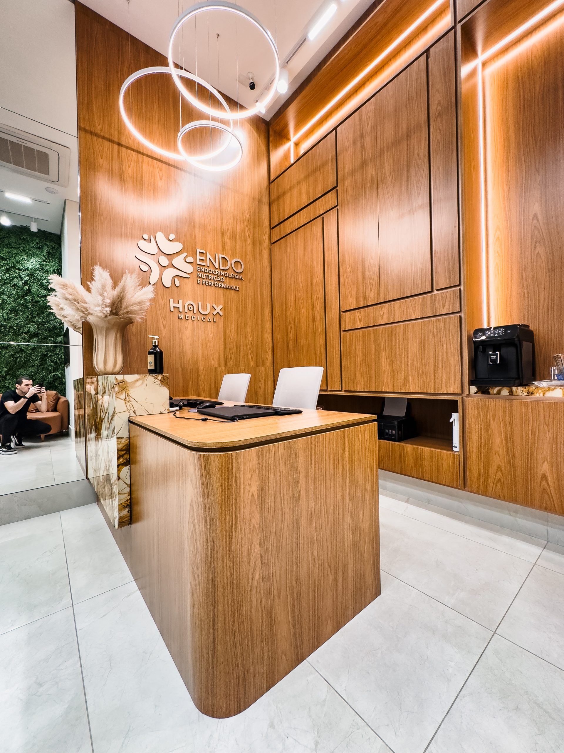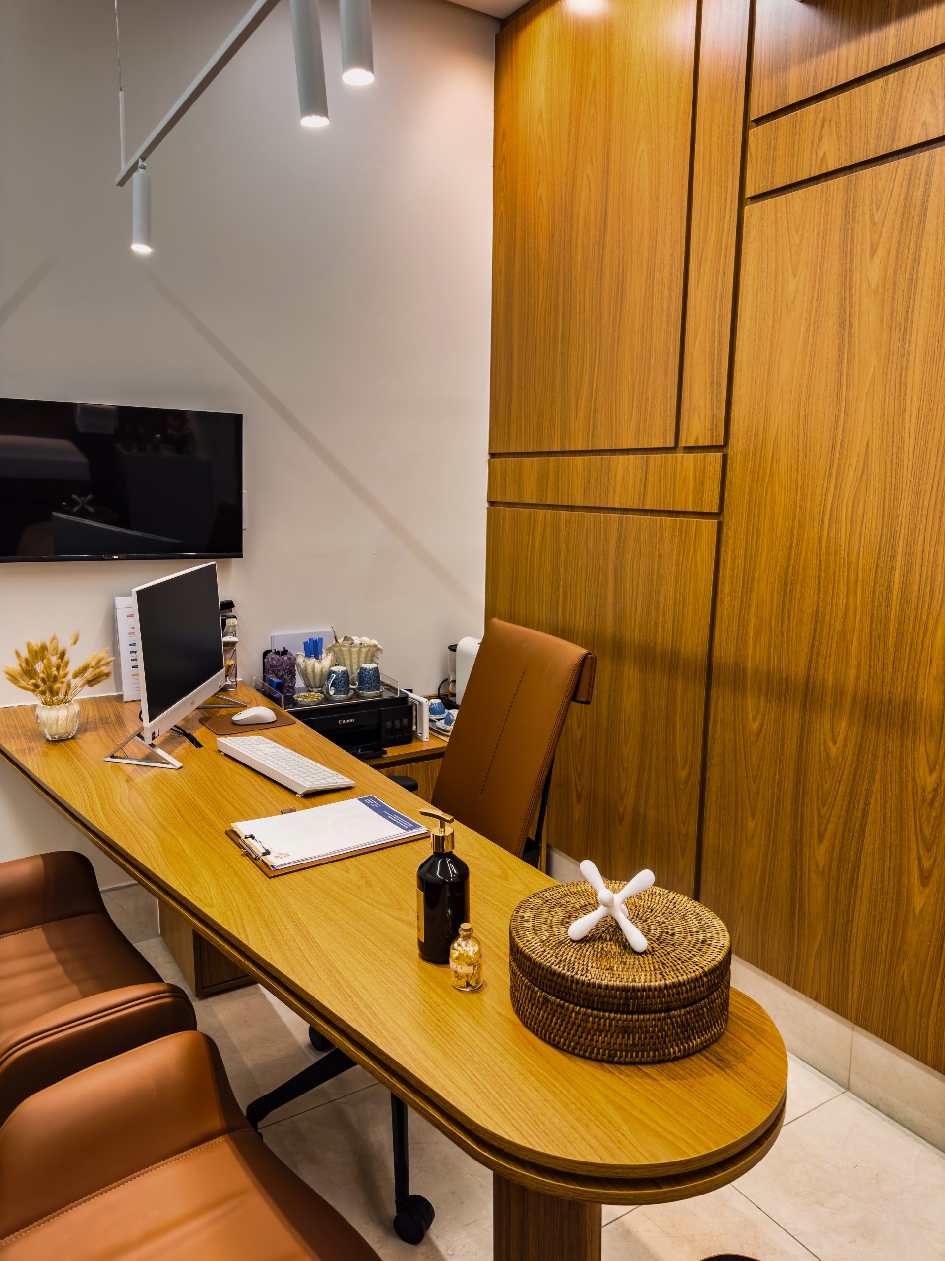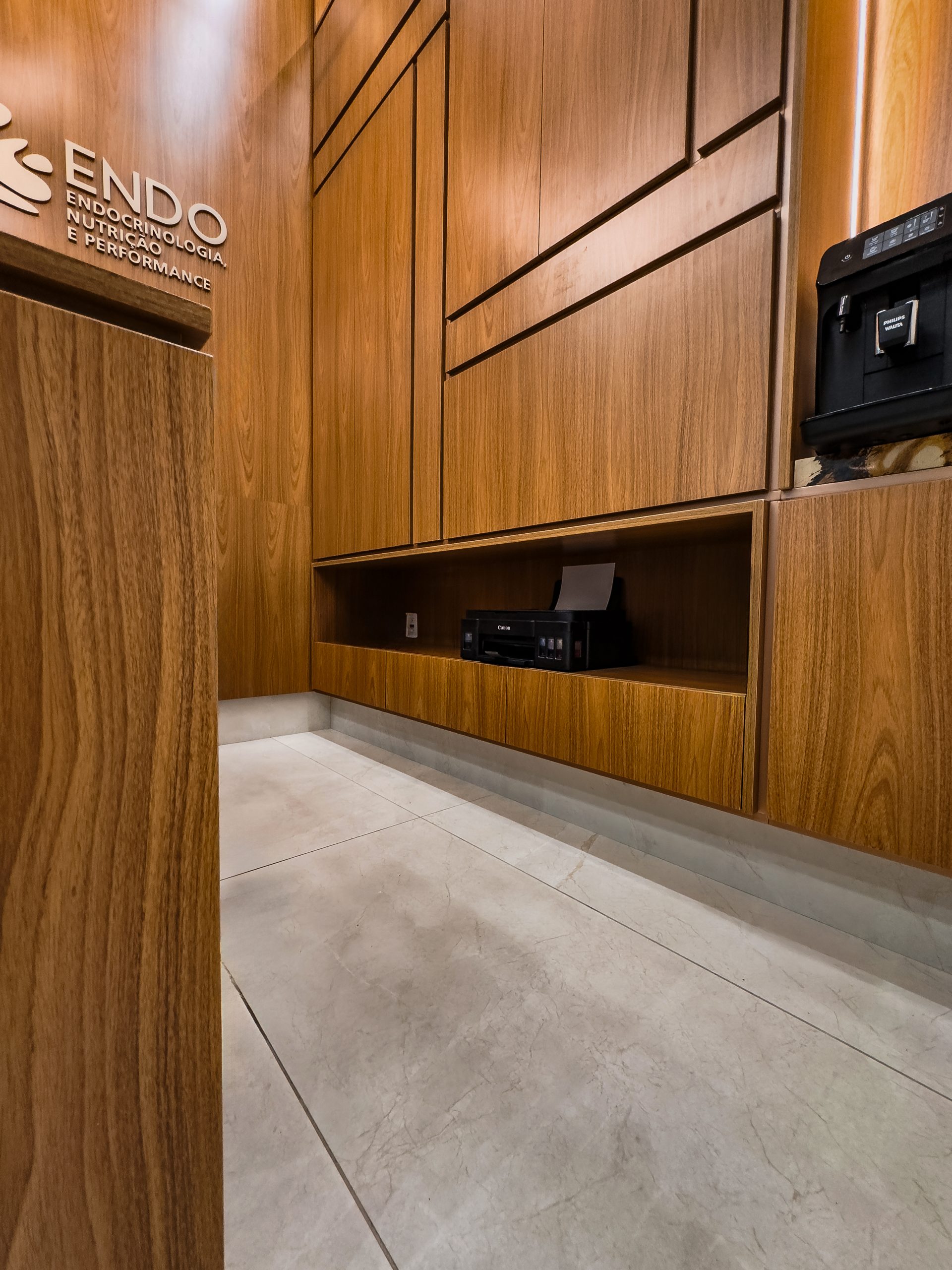 O Painel Integrado Áureo destaca como os móveis planejados transformam a recepção e o consultório em ambientes acolhedores, funcionais e sofisticados. A marcenaria em madeira envolve todo o espaço, criando continuidade visual e integrando nichos, portas camufladas e áreas de apoio com perfeição. A iluminação embutida valoriza os veios da madeira e reforça o tom elegante que acompanha o atendimento desde o primeiro contato.