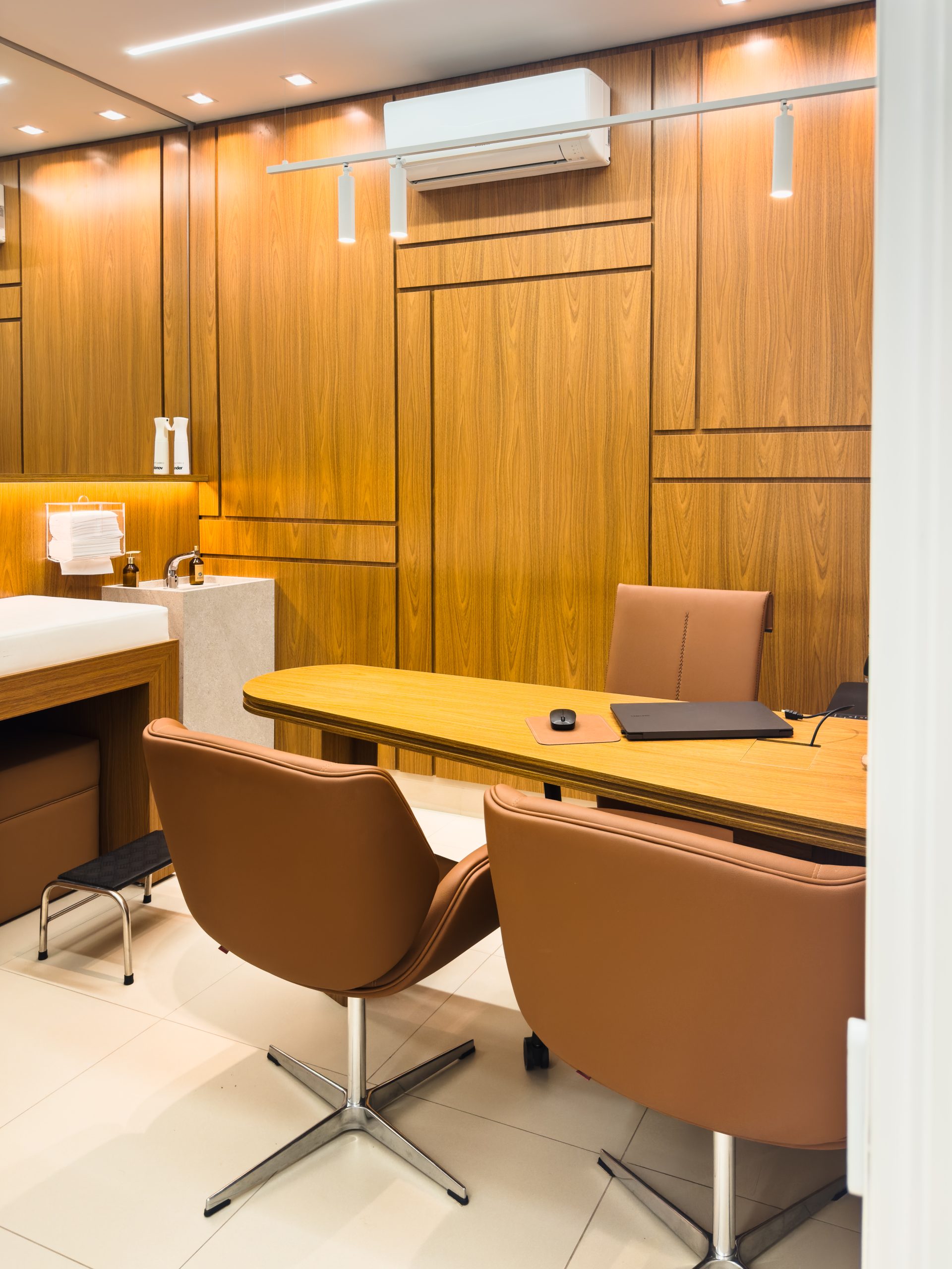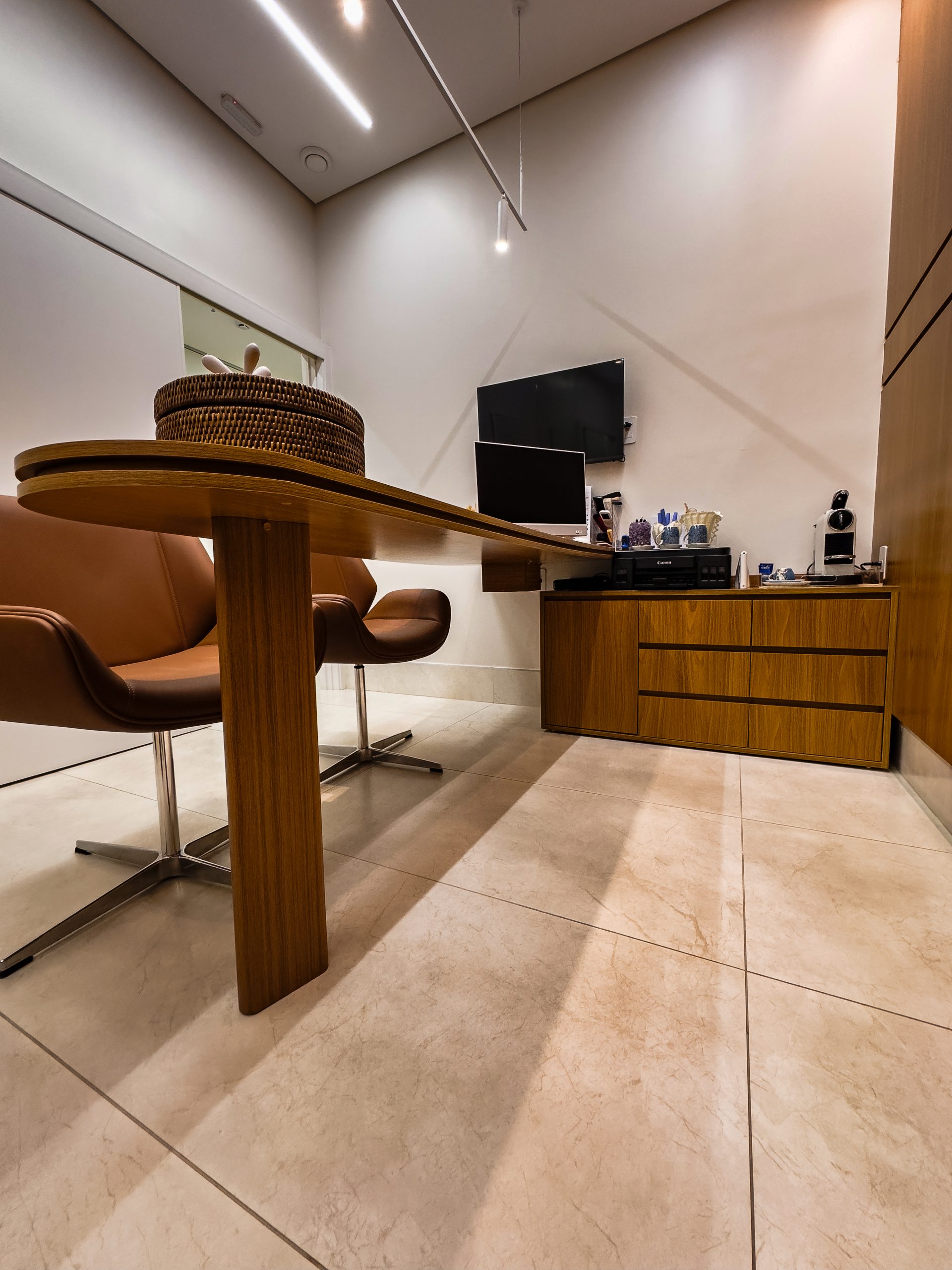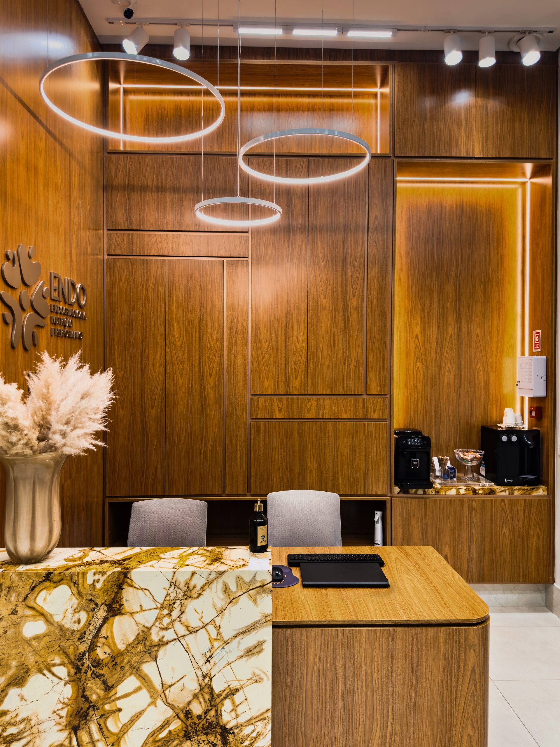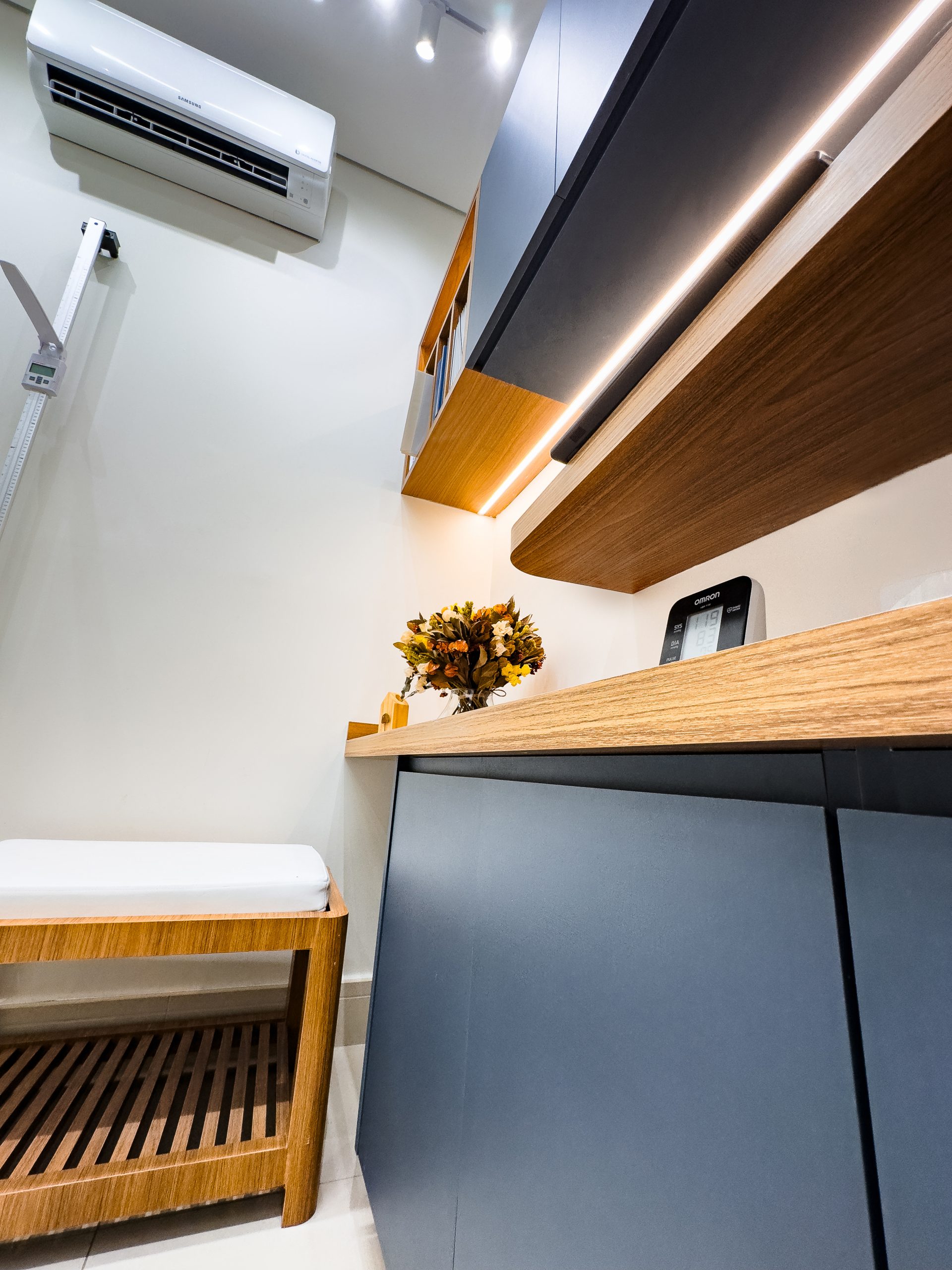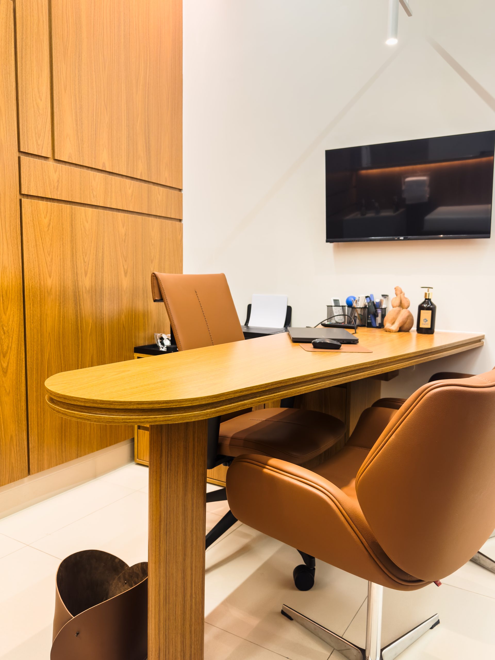 O Painel Integrado Áureo destaca como os móveis planejados transformam a recepção e o consultório em ambientes acolhedores, funcionais e sofisticados. A marcenaria em madeira envolve todo o espaço, criando continuidade visual e integrando nichos, portas camufladas e áreas de apoio com perfeição. A iluminação embutida valoriza os veios da madeira e reforça o tom elegante que acompanha o atendimento desde o primeiro contato.