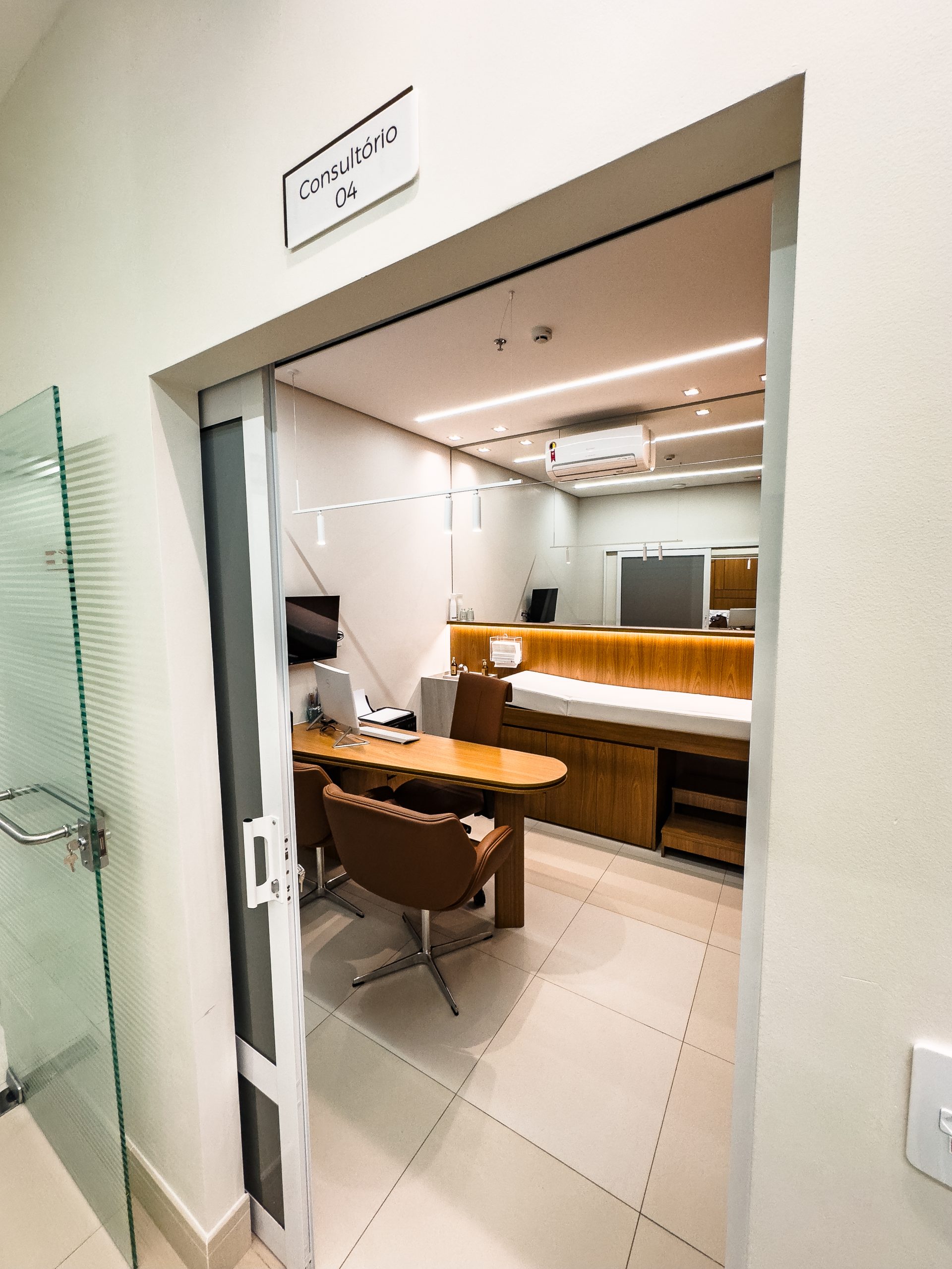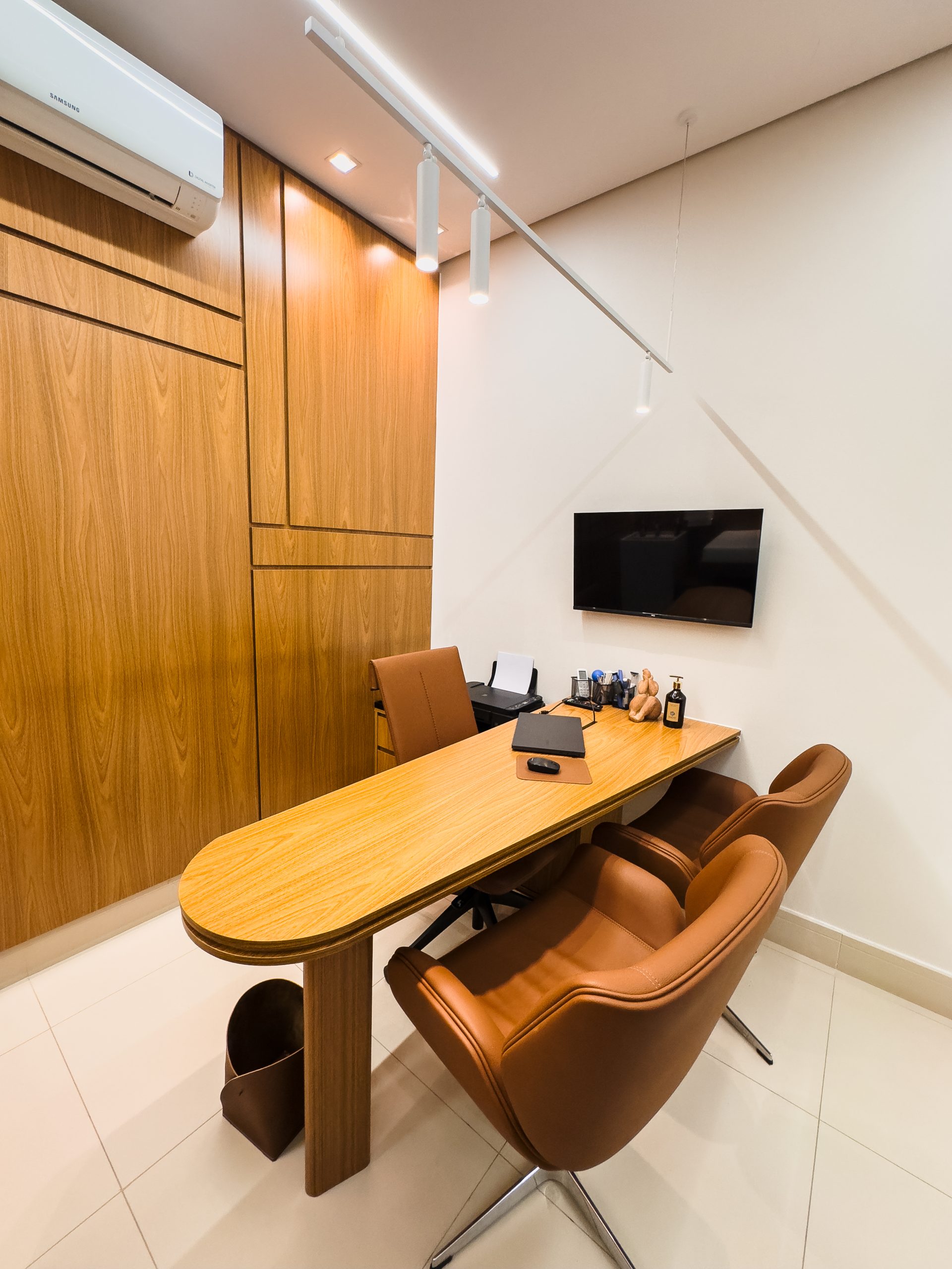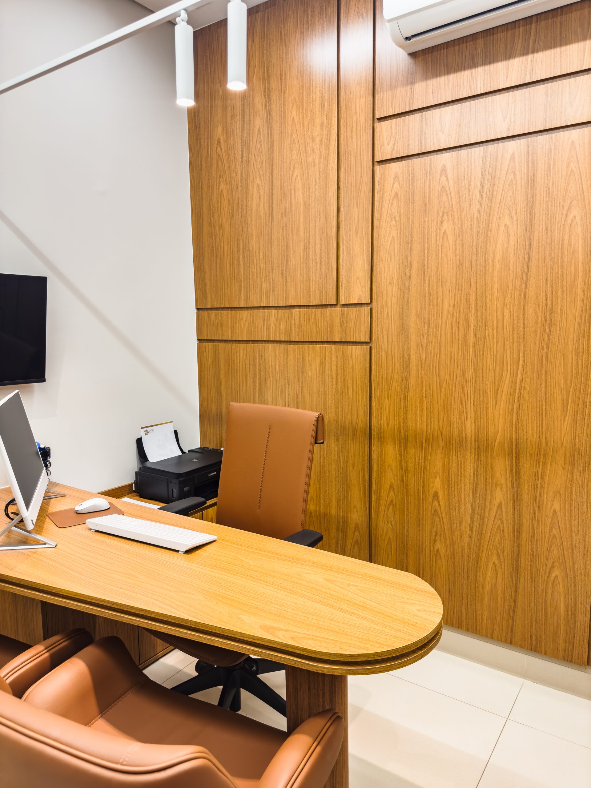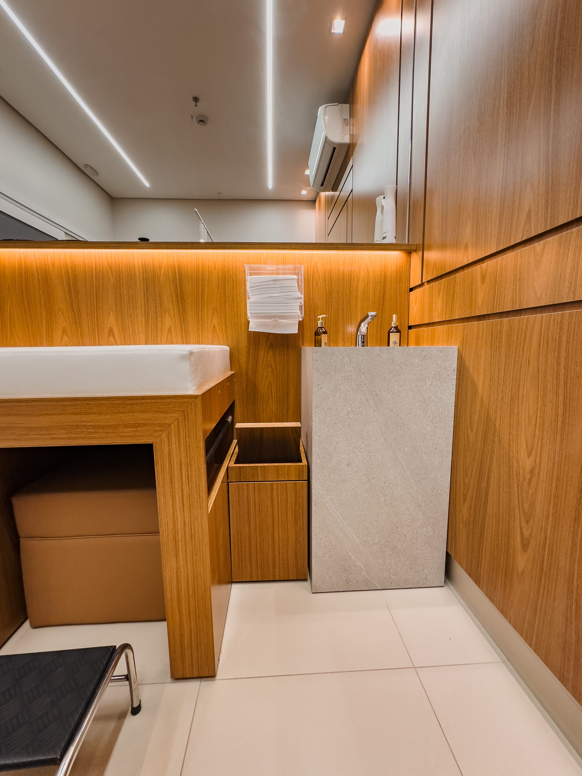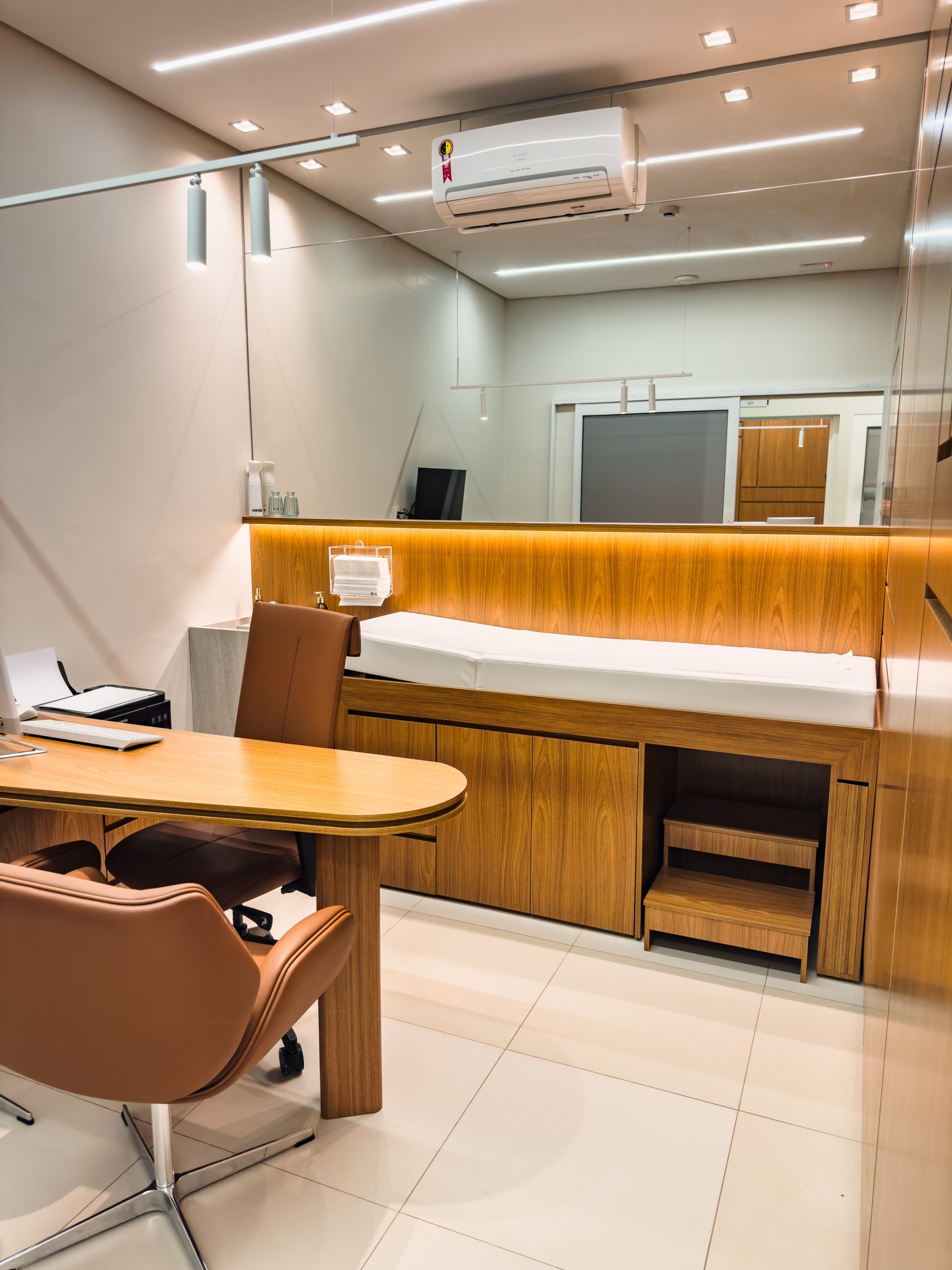 O Painel Integrado Áureo destaca como os móveis planejados transformam a recepção e o consultório em ambientes acolhedores, funcionais e sofisticados. A marcenaria em madeira envolve todo o espaço, criando continuidade visual e integrando nichos, portas camufladas e áreas de apoio com perfeição. A iluminação embutida valoriza os veios da madeira e reforça o tom elegante que acompanha o atendimento desde o primeiro contato.