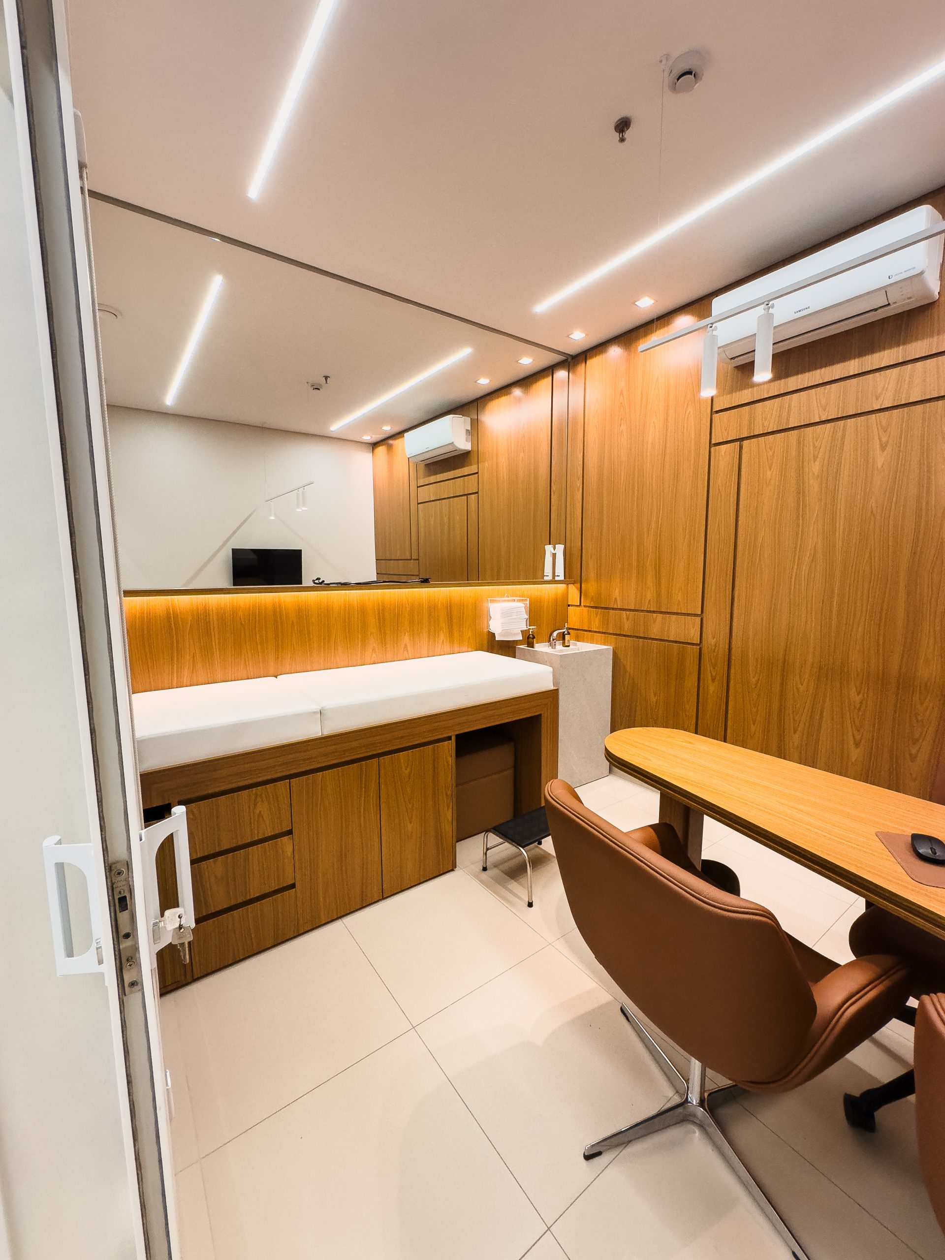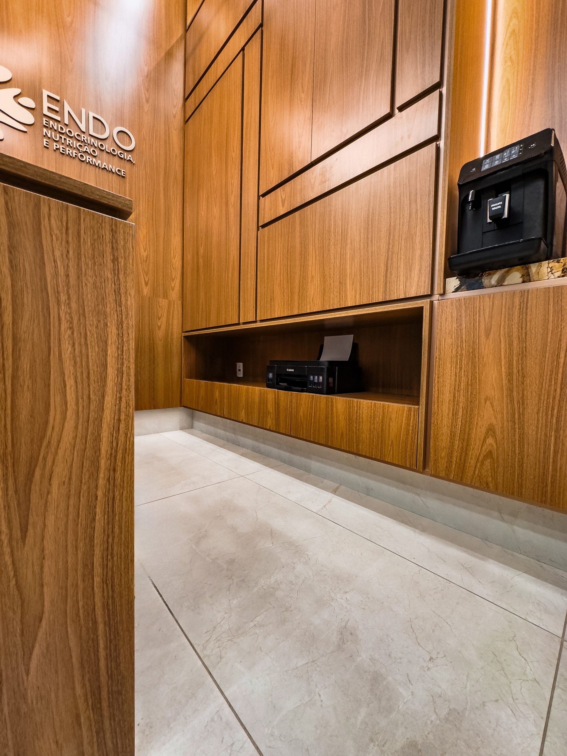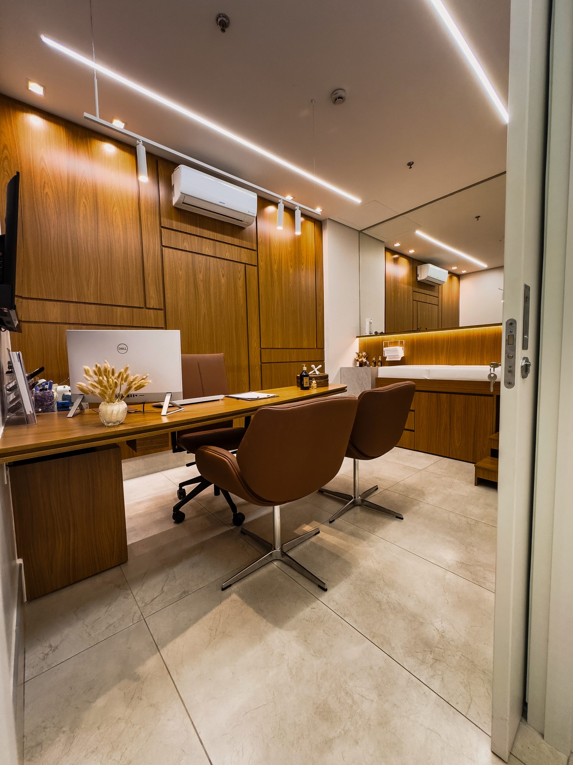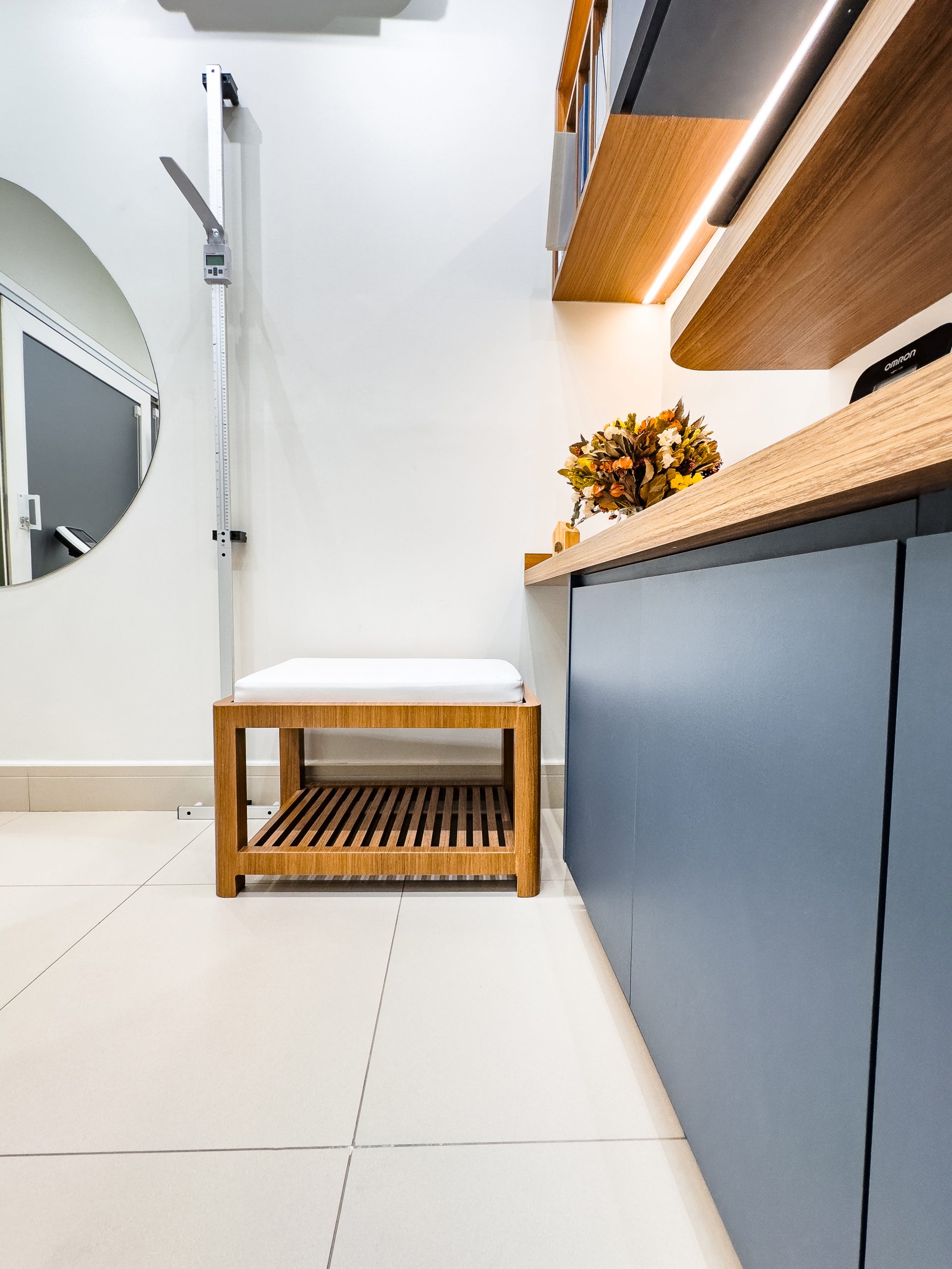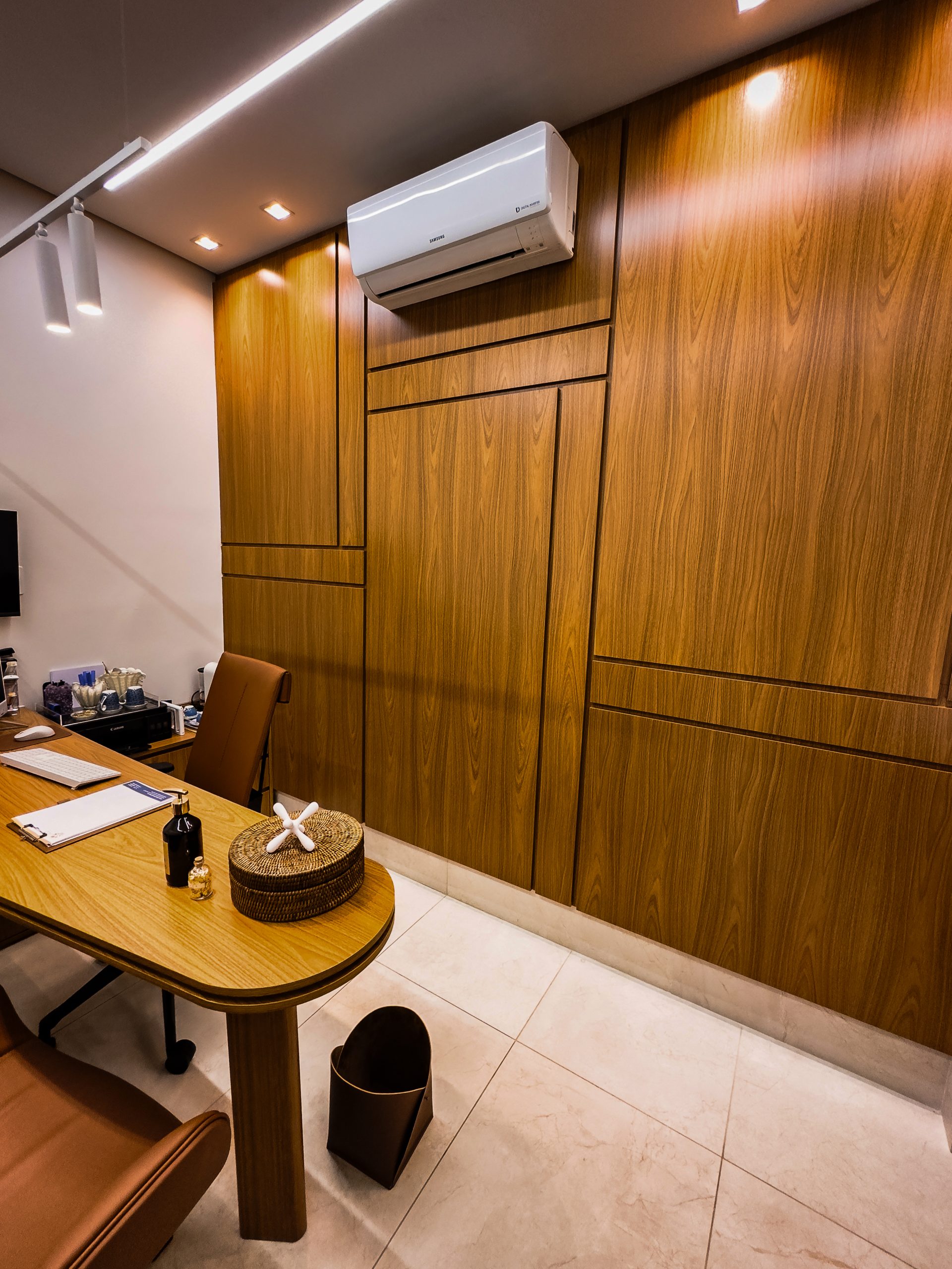 O Painel Integrado Áureo destaca como os móveis planejados transformam a recepção e o consultório em ambientes acolhedores, funcionais e sofisticados. A marcenaria em madeira envolve todo o espaço, criando continuidade visual e integrando nichos, portas camufladas e áreas de apoio com perfeição. A iluminação embutida valoriza os veios da madeira e reforça o tom elegante que acompanha o atendimento desde o primeiro contato.