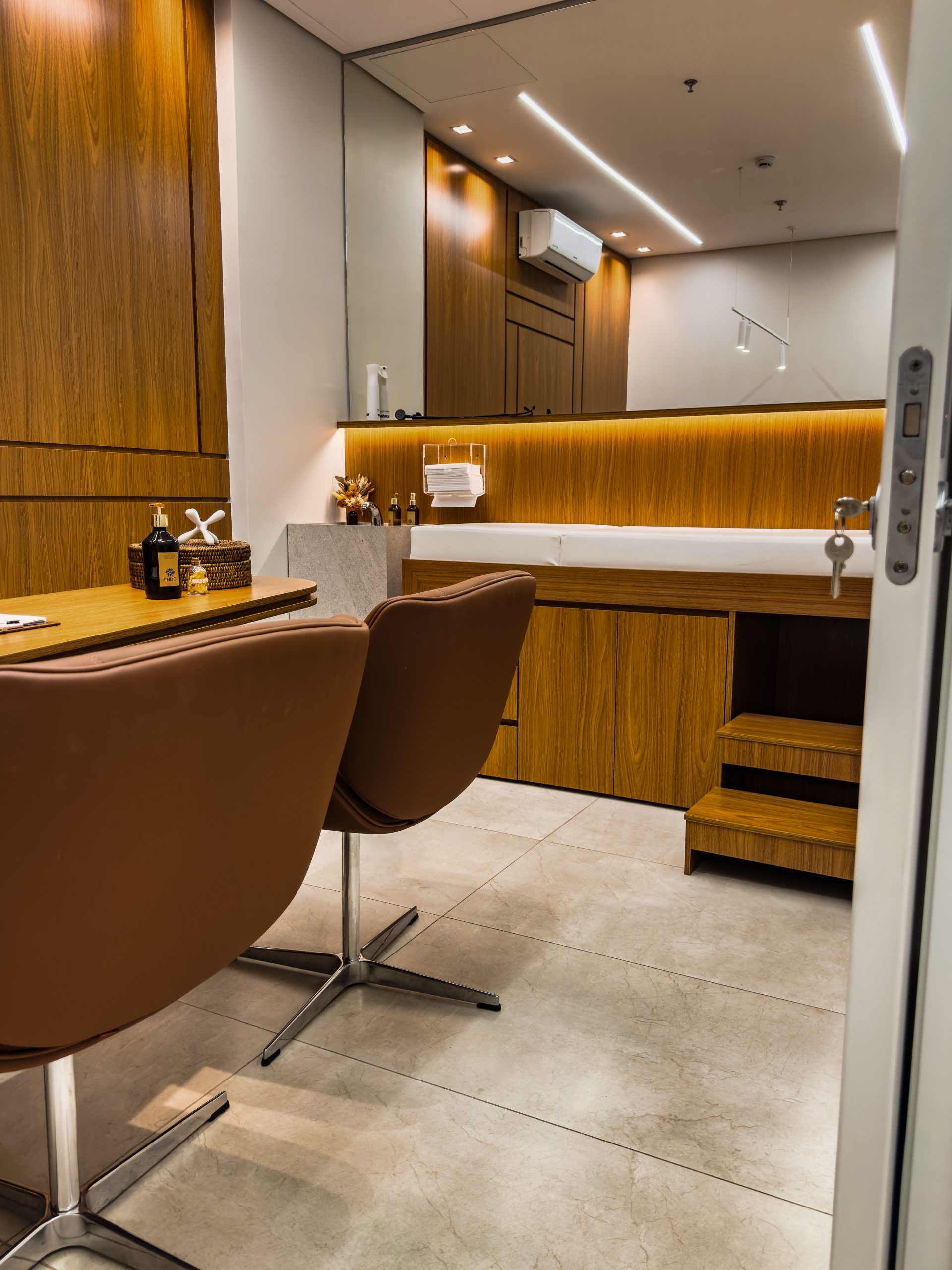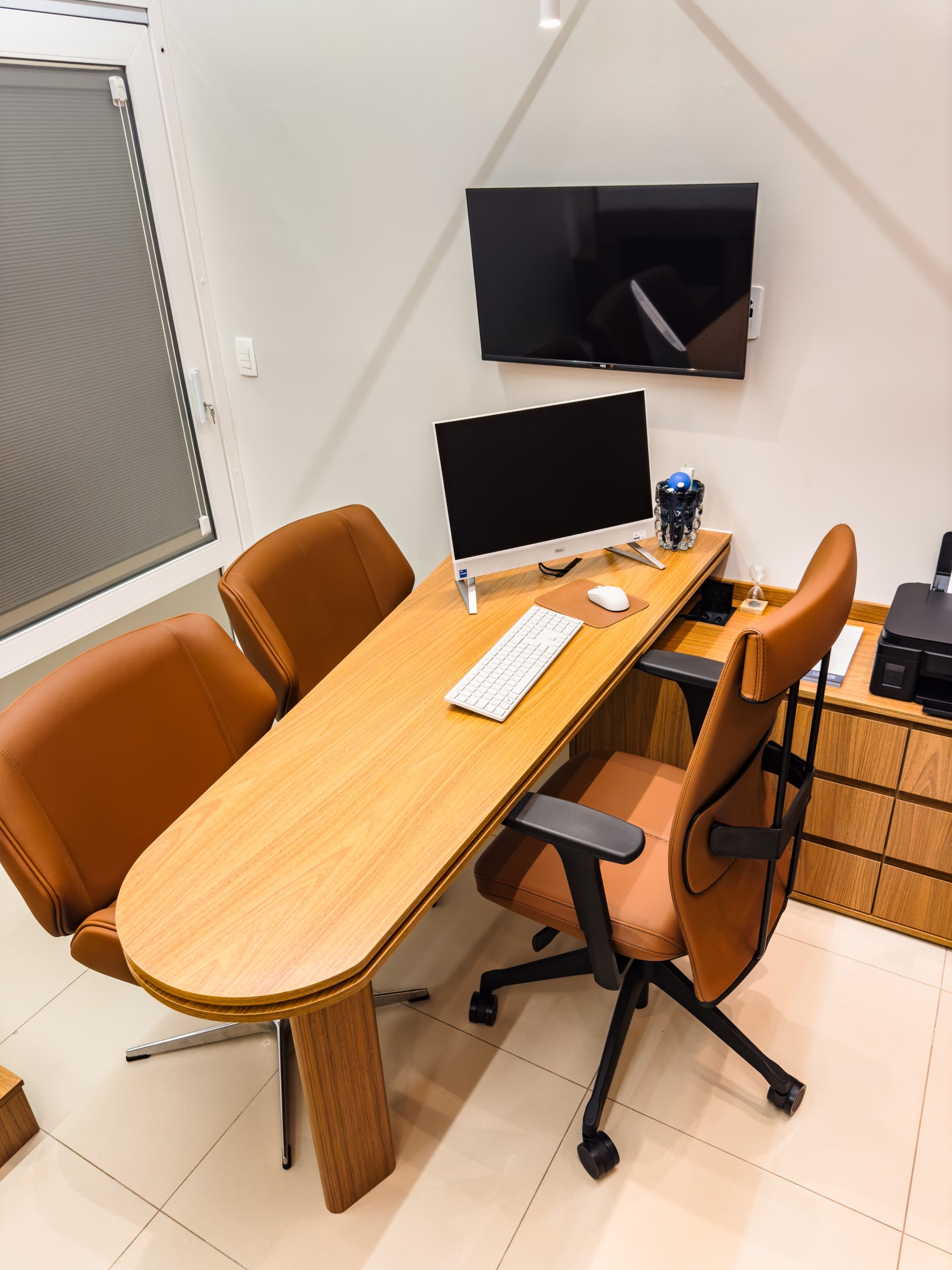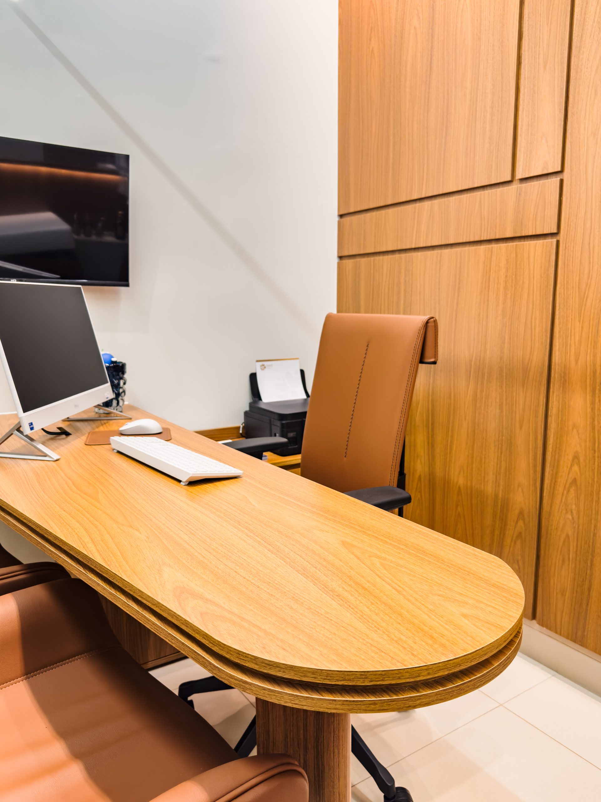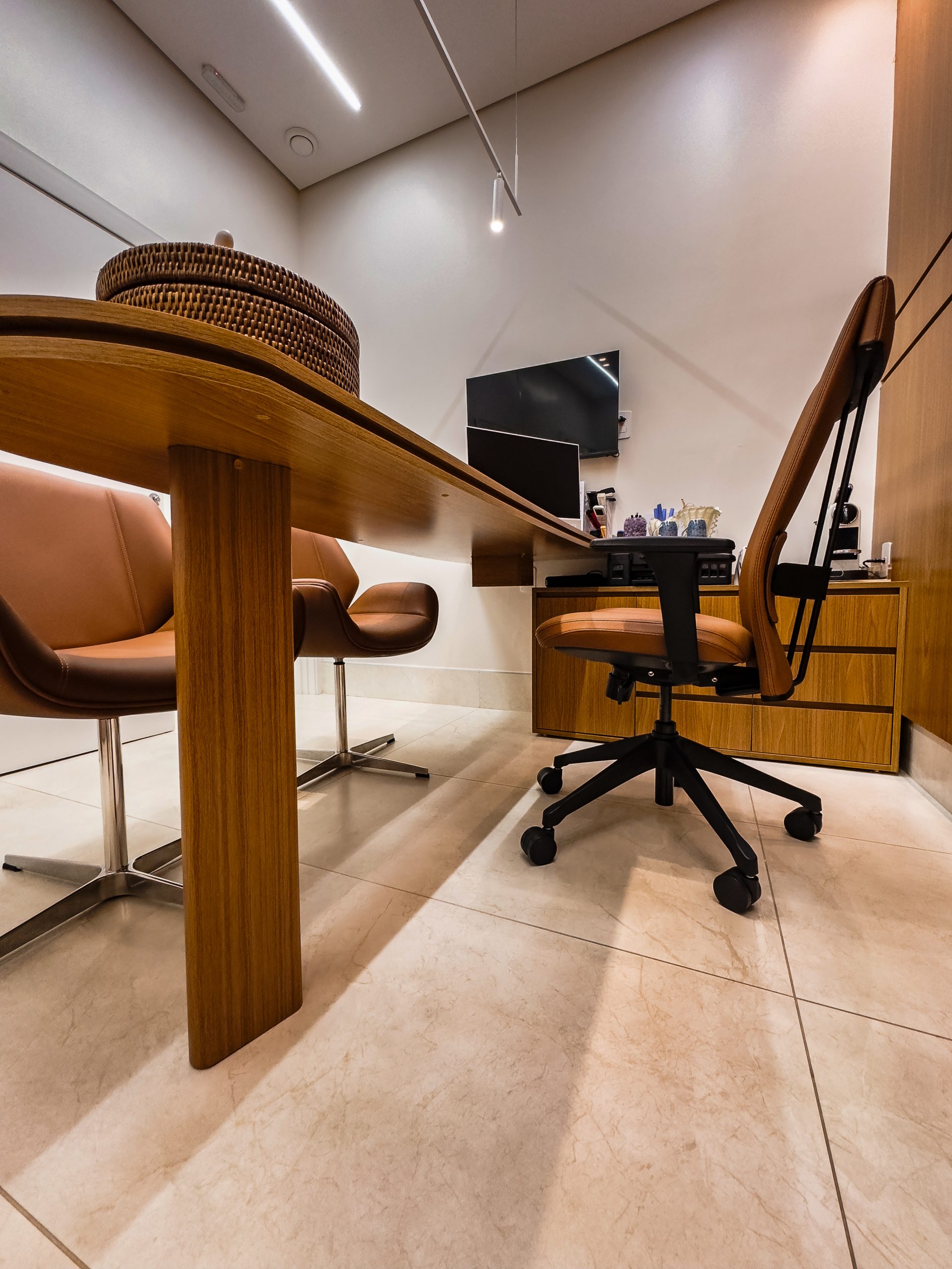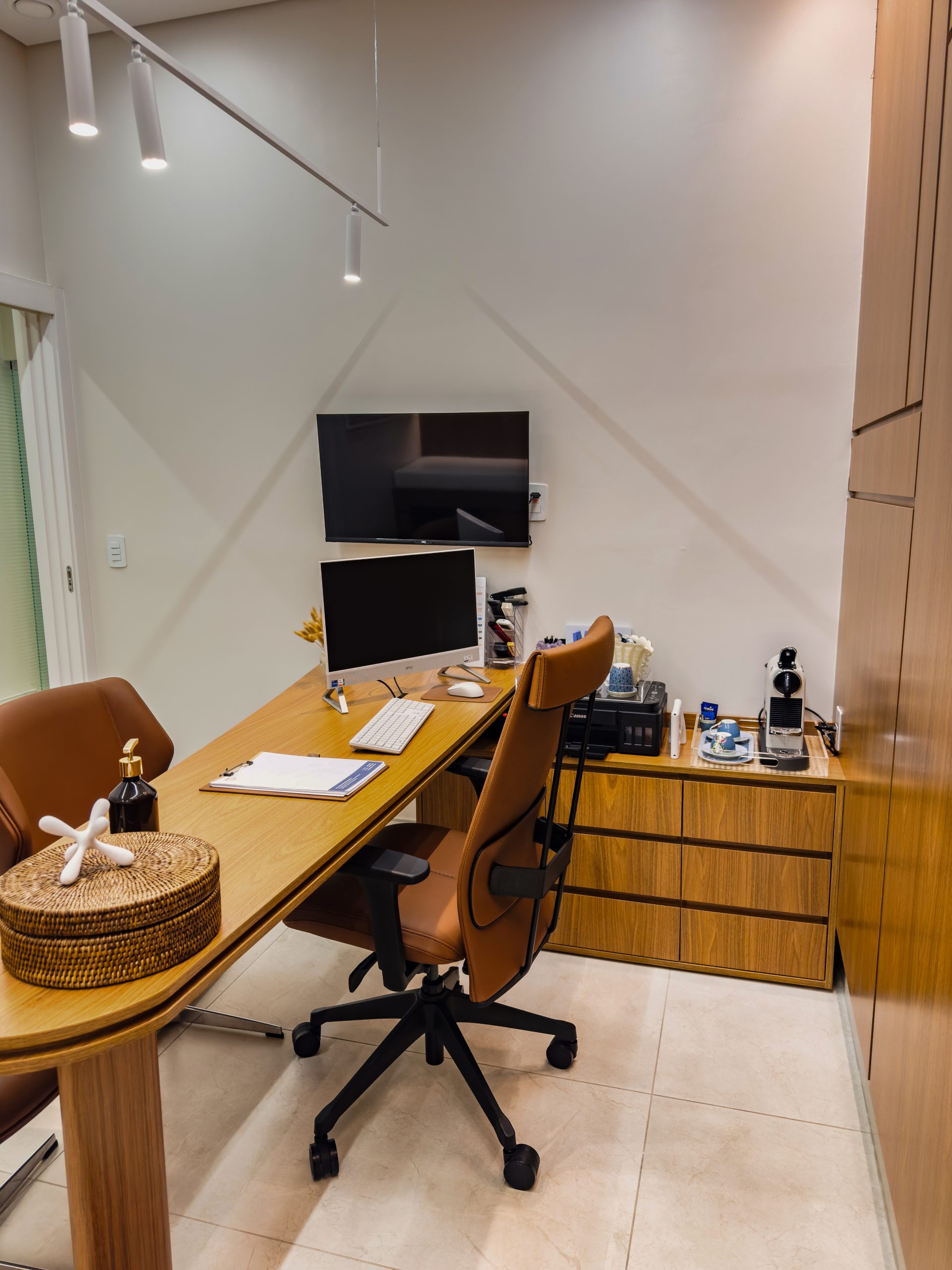 O Painel Integrado Áureo destaca como os móveis planejados transformam a recepção e o consultório em ambientes acolhedores, funcionais e sofisticados. A marcenaria em madeira envolve todo o espaço, criando continuidade visual e integrando nichos, portas camufladas e áreas de apoio com perfeição. A iluminação embutida valoriza os veios da madeira e reforça o tom elegante que acompanha o atendimento desde o primeiro contato.