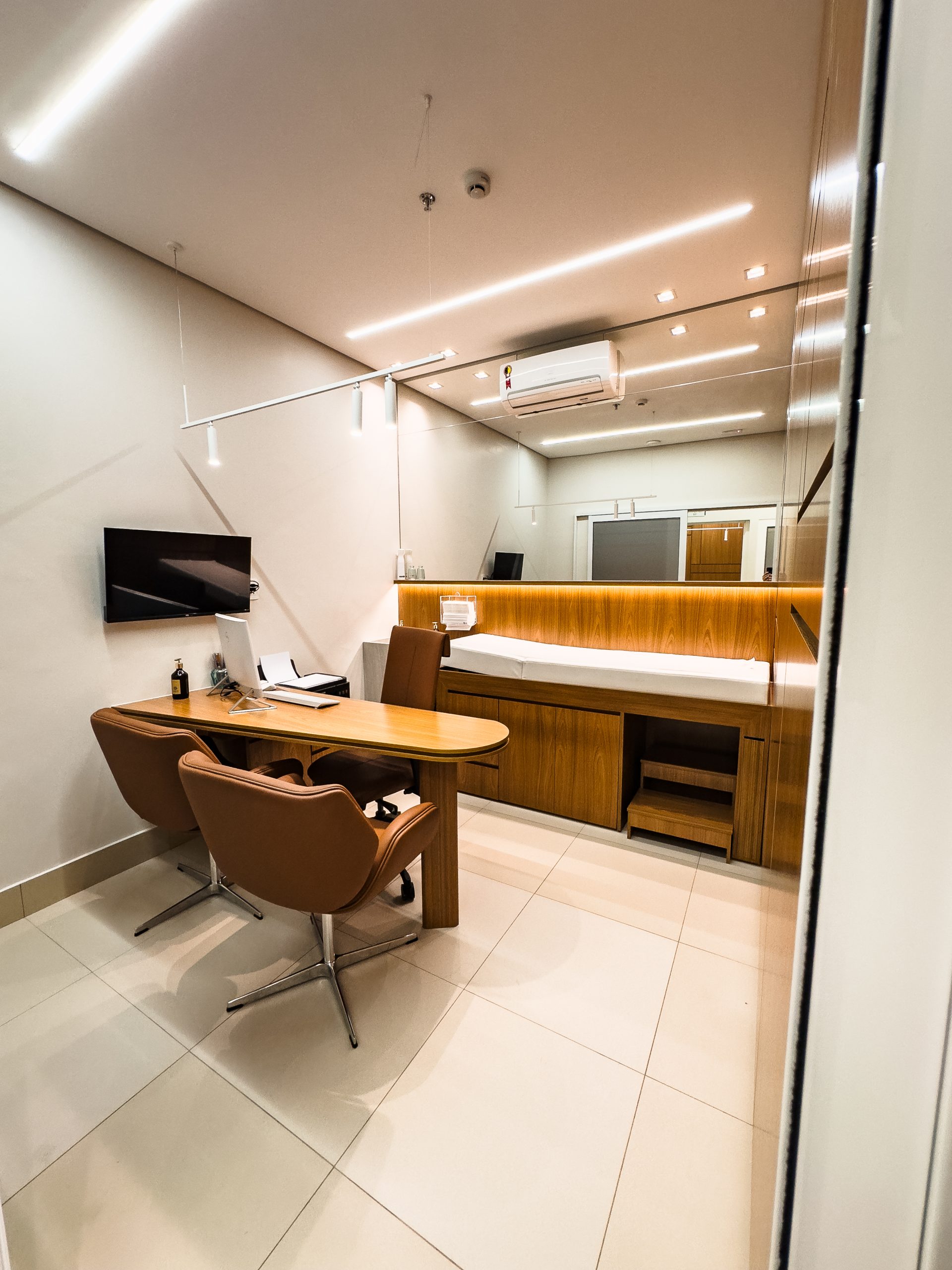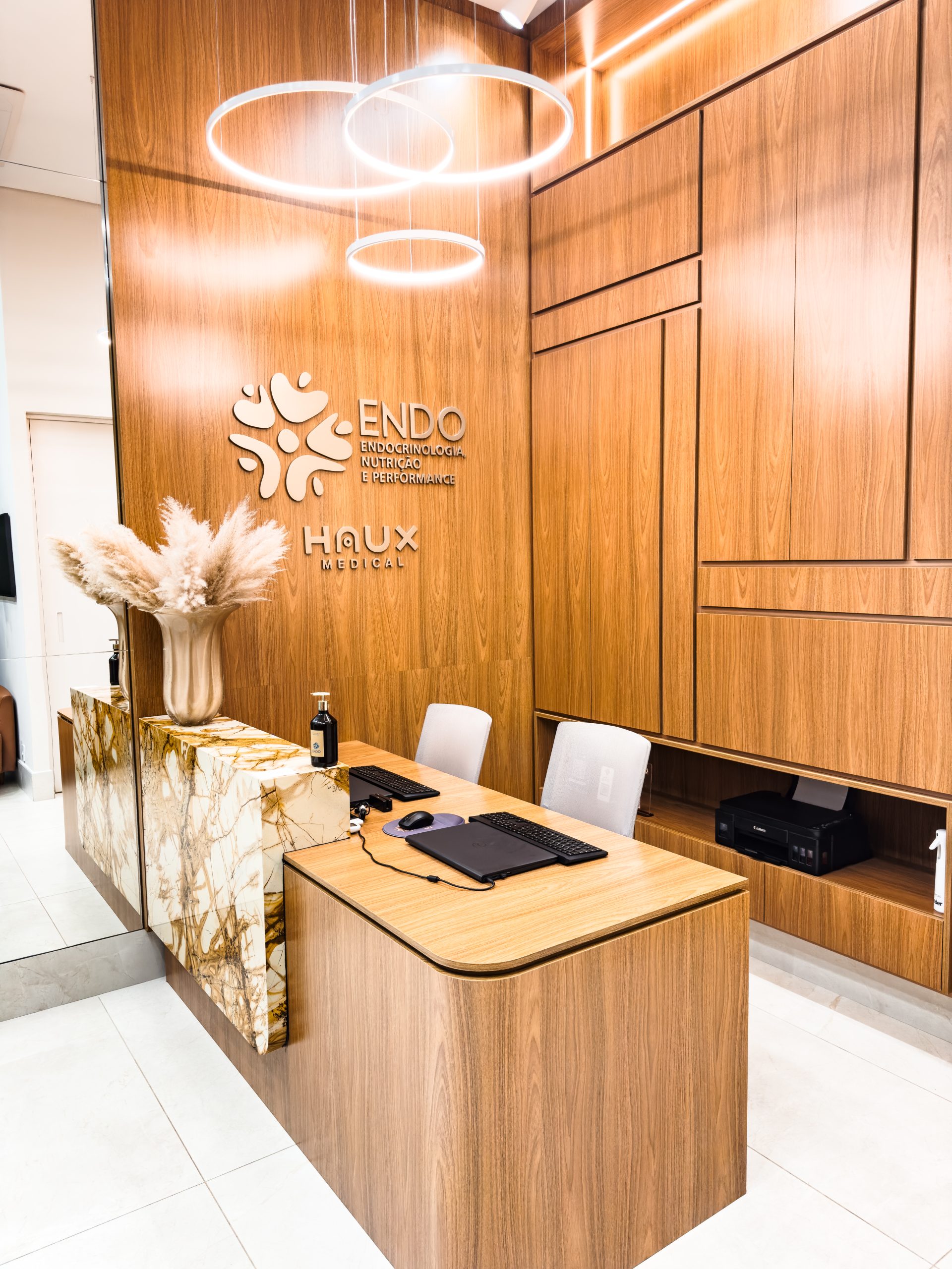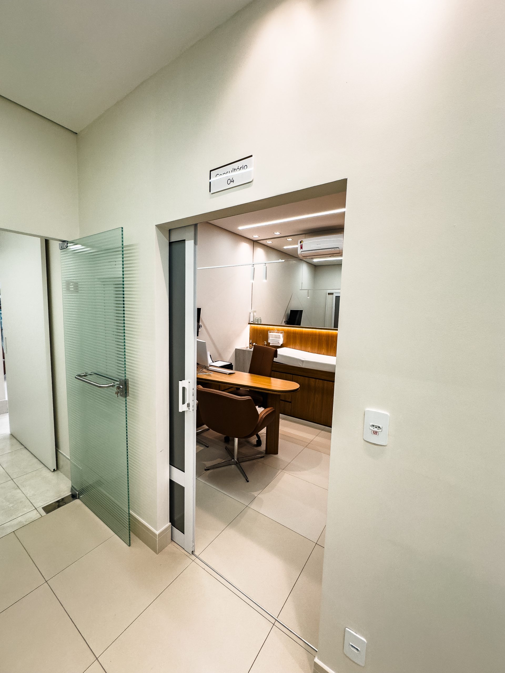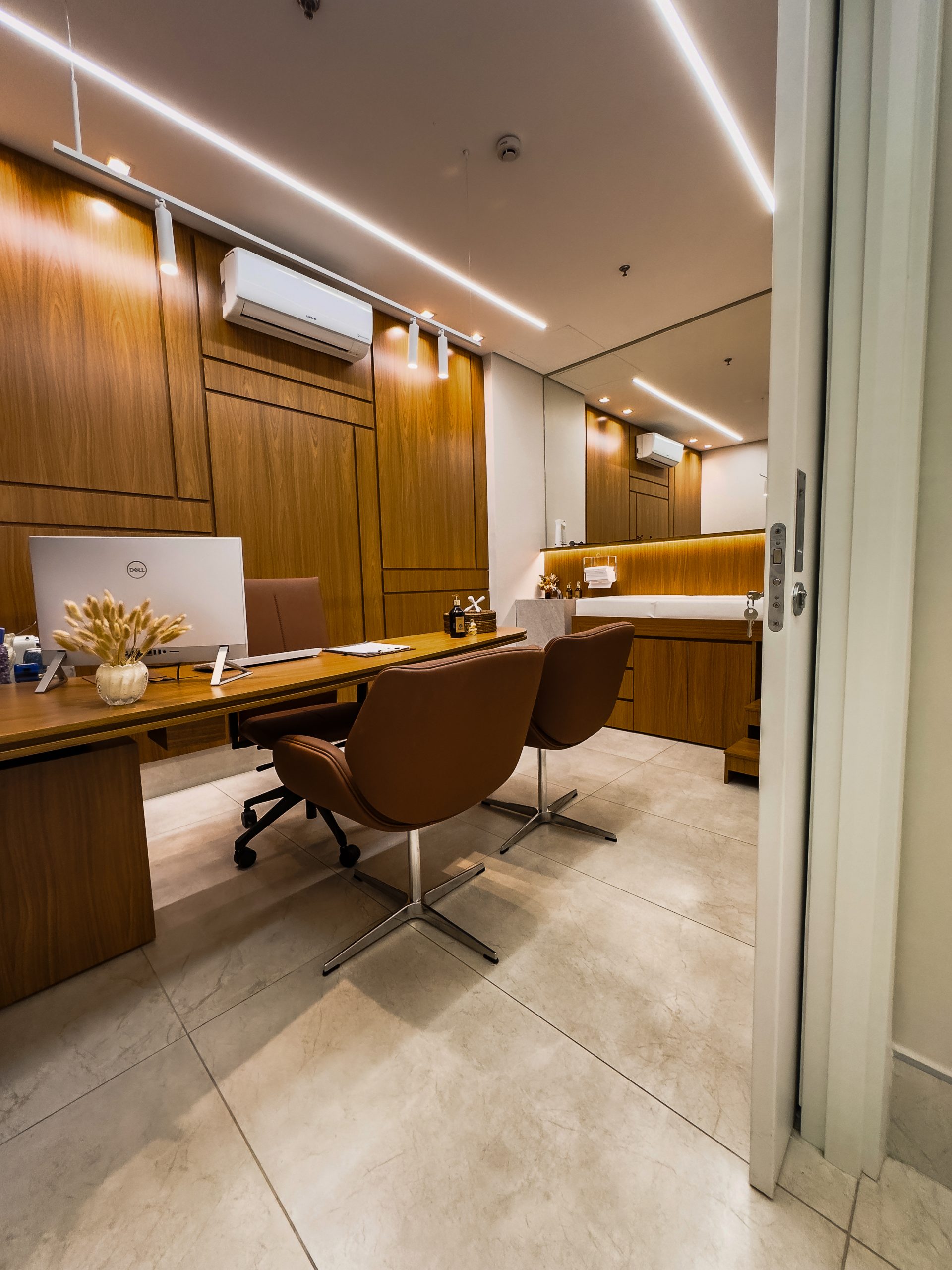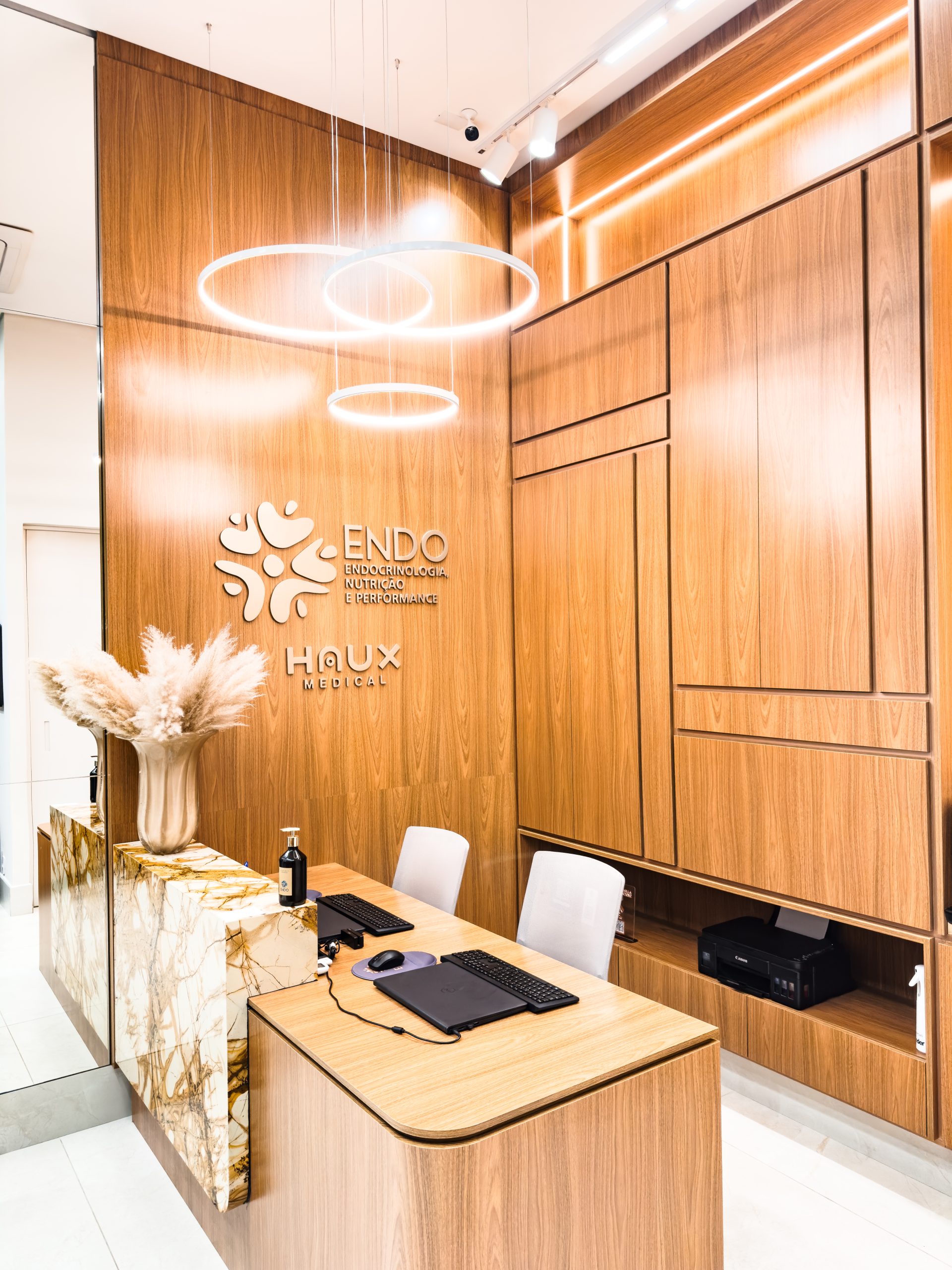 O Painel Integrado Áureo destaca como os móveis planejados transformam a recepção e o consultório em ambientes acolhedores, funcionais e sofisticados. A marcenaria em madeira envolve todo o espaço, criando continuidade visual e integrando nichos, portas camufladas e áreas de apoio com perfeição. A iluminação embutida valoriza os veios da madeira e reforça o tom elegante que acompanha o atendimento desde o primeiro contato.