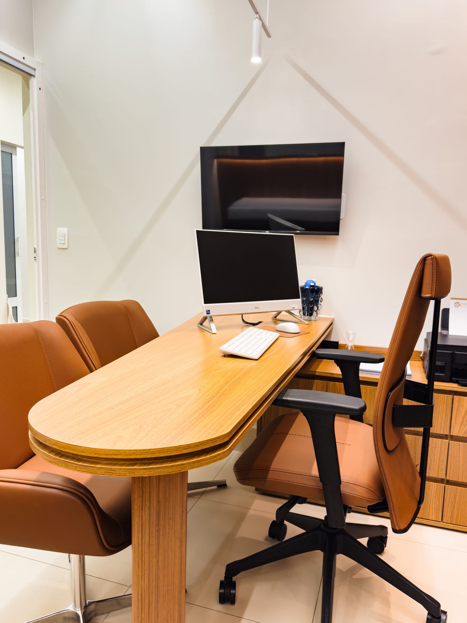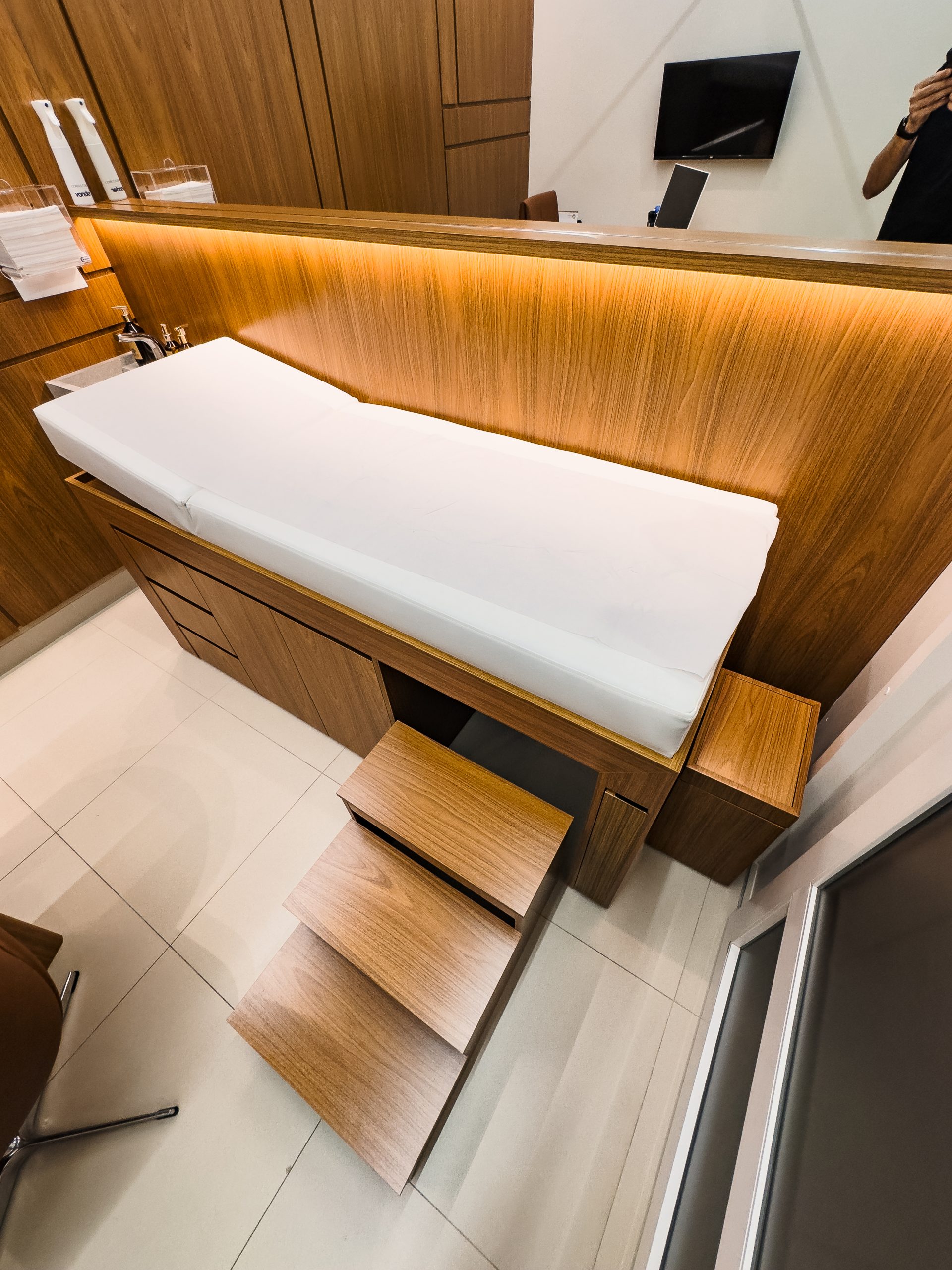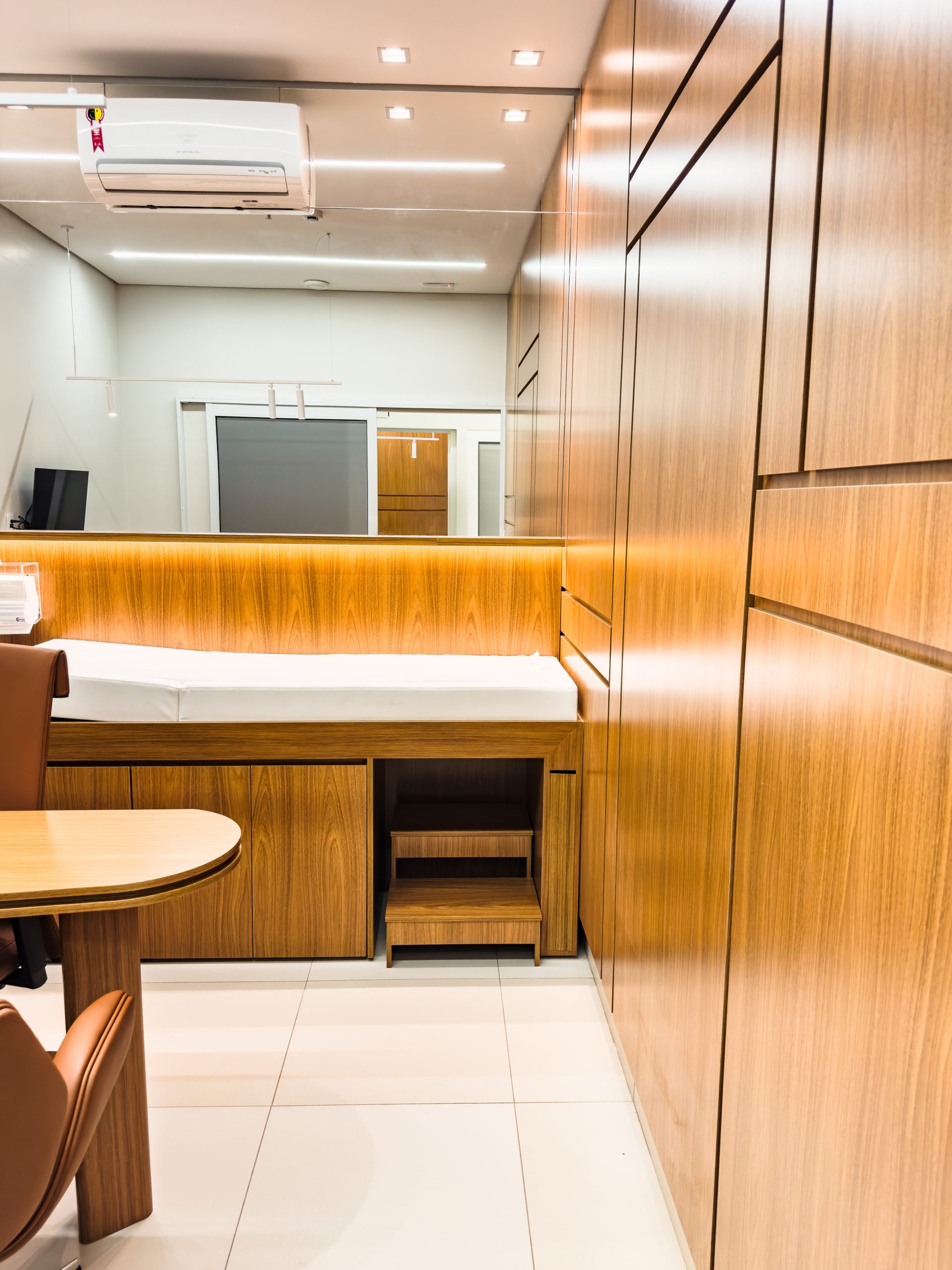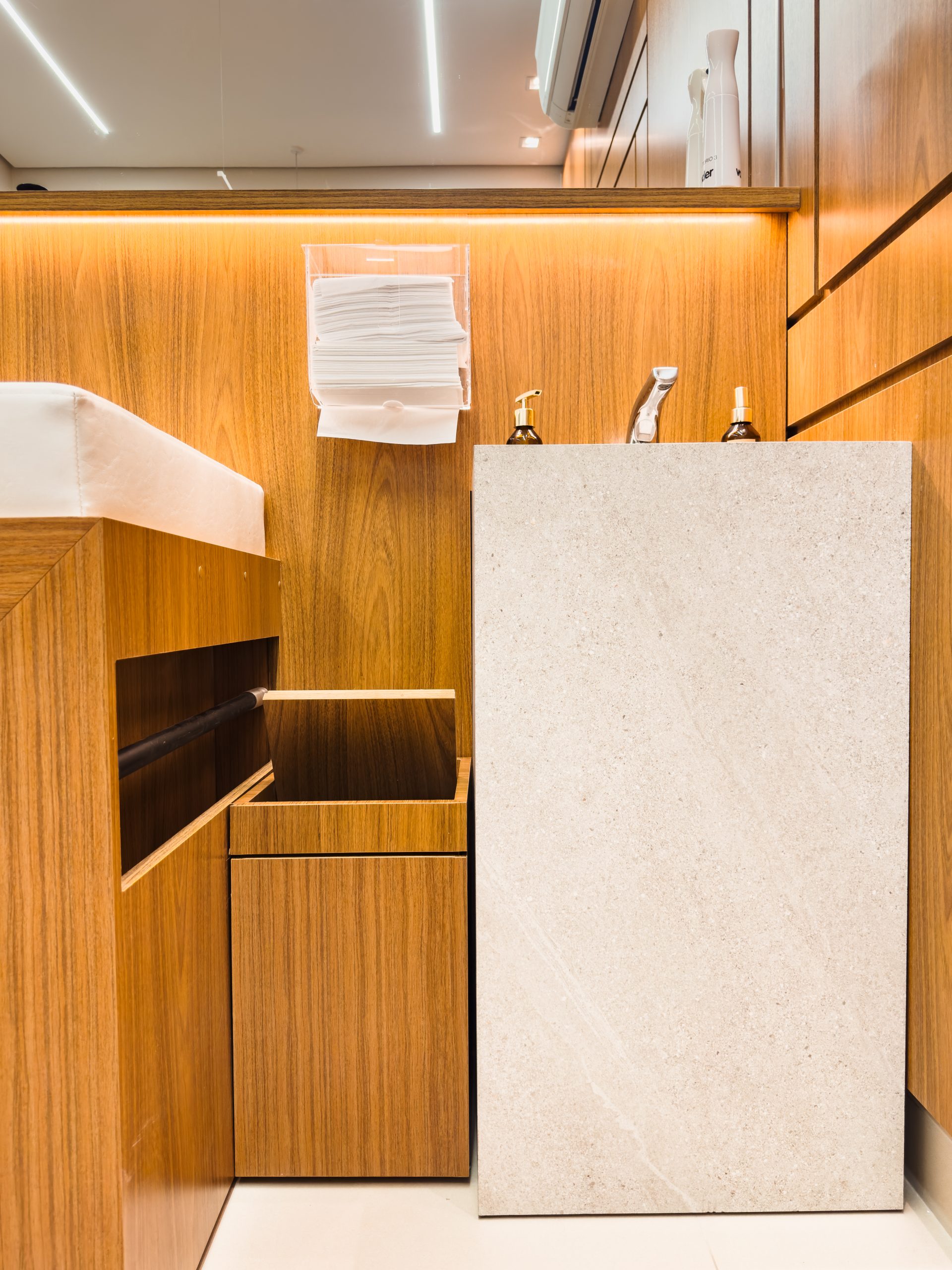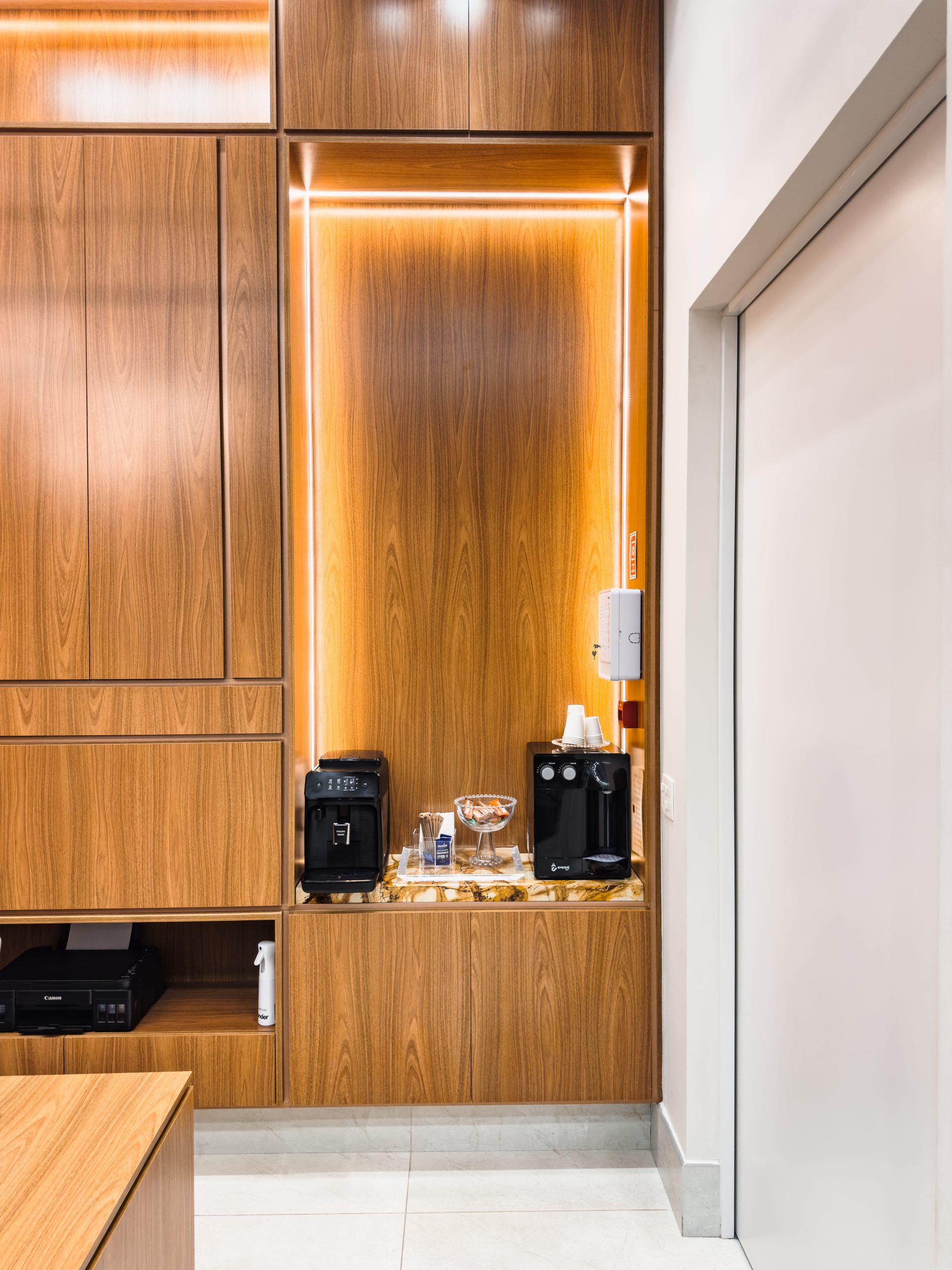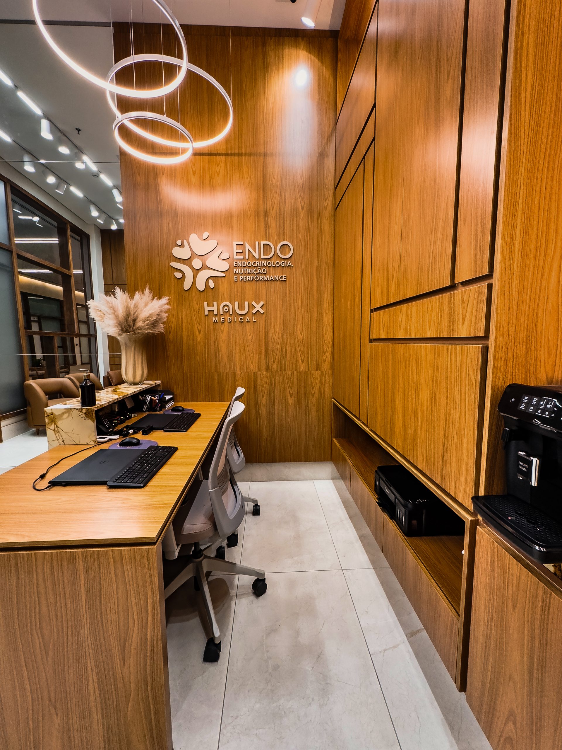 O Painel Integrado Áureo destaca como os móveis planejados transformam a recepção e o consultório em ambientes acolhedores, funcionais e sofisticados. A marcenaria em madeira envolve todo o espaço, criando continuidade visual e integrando nichos, portas camufladas e áreas de apoio com perfeição. A iluminação embutida valoriza os veios da madeira e reforça o tom elegante que acompanha o atendimento desde o primeiro contato.