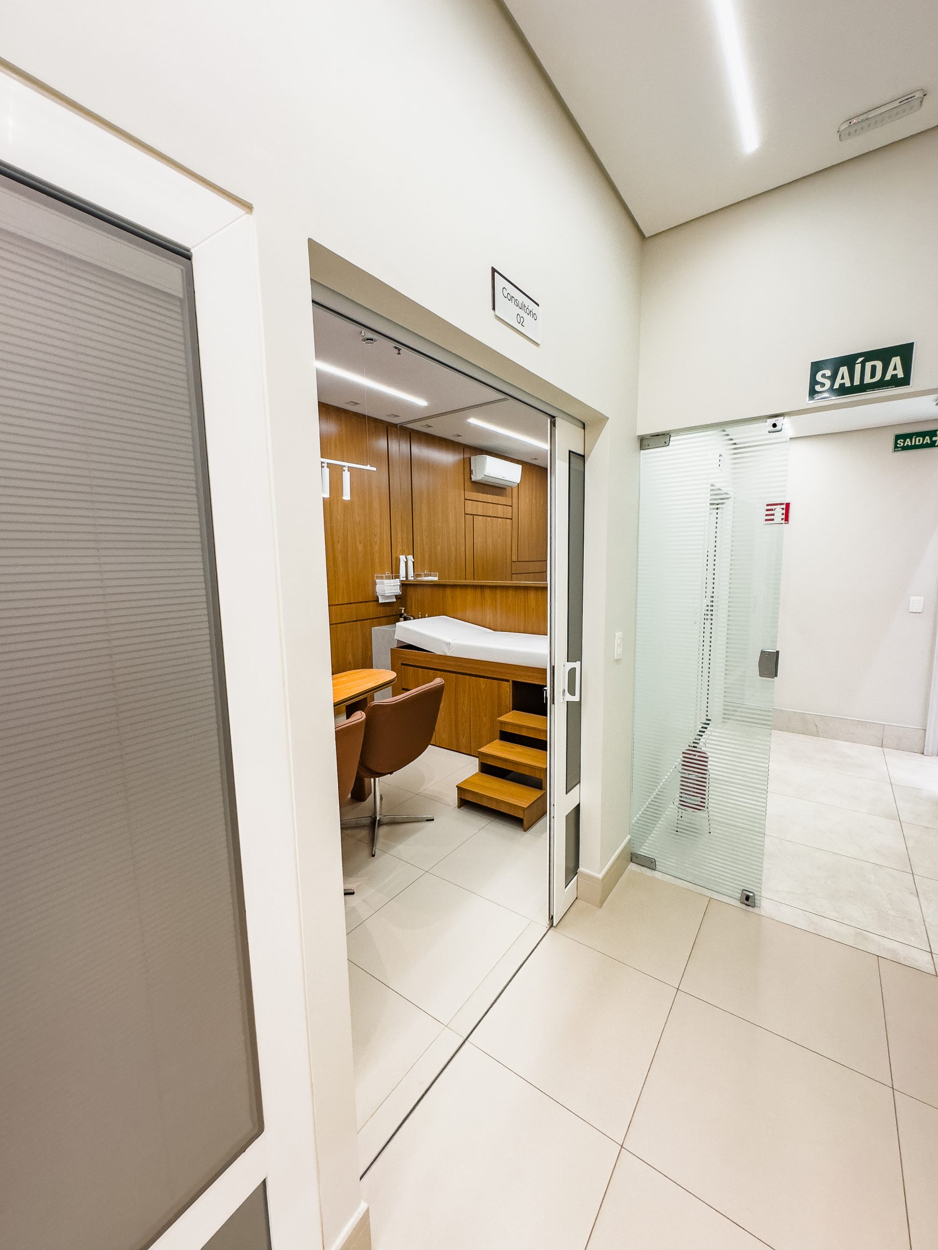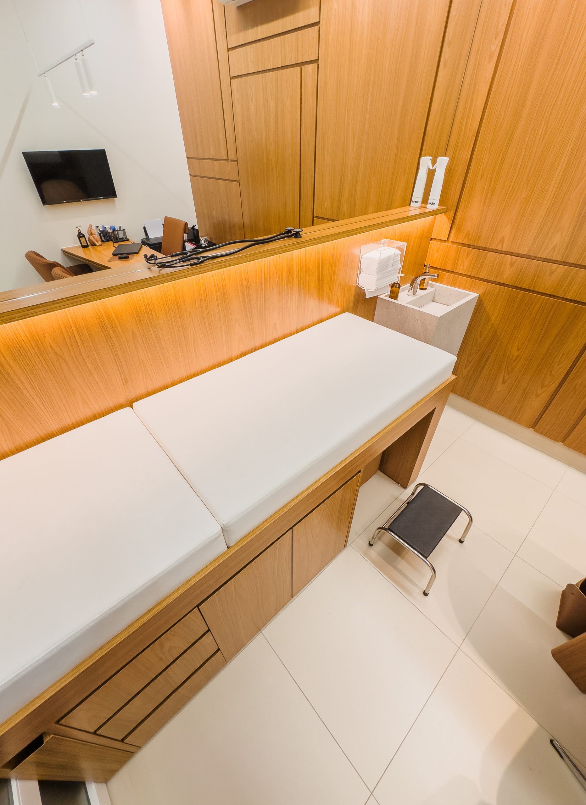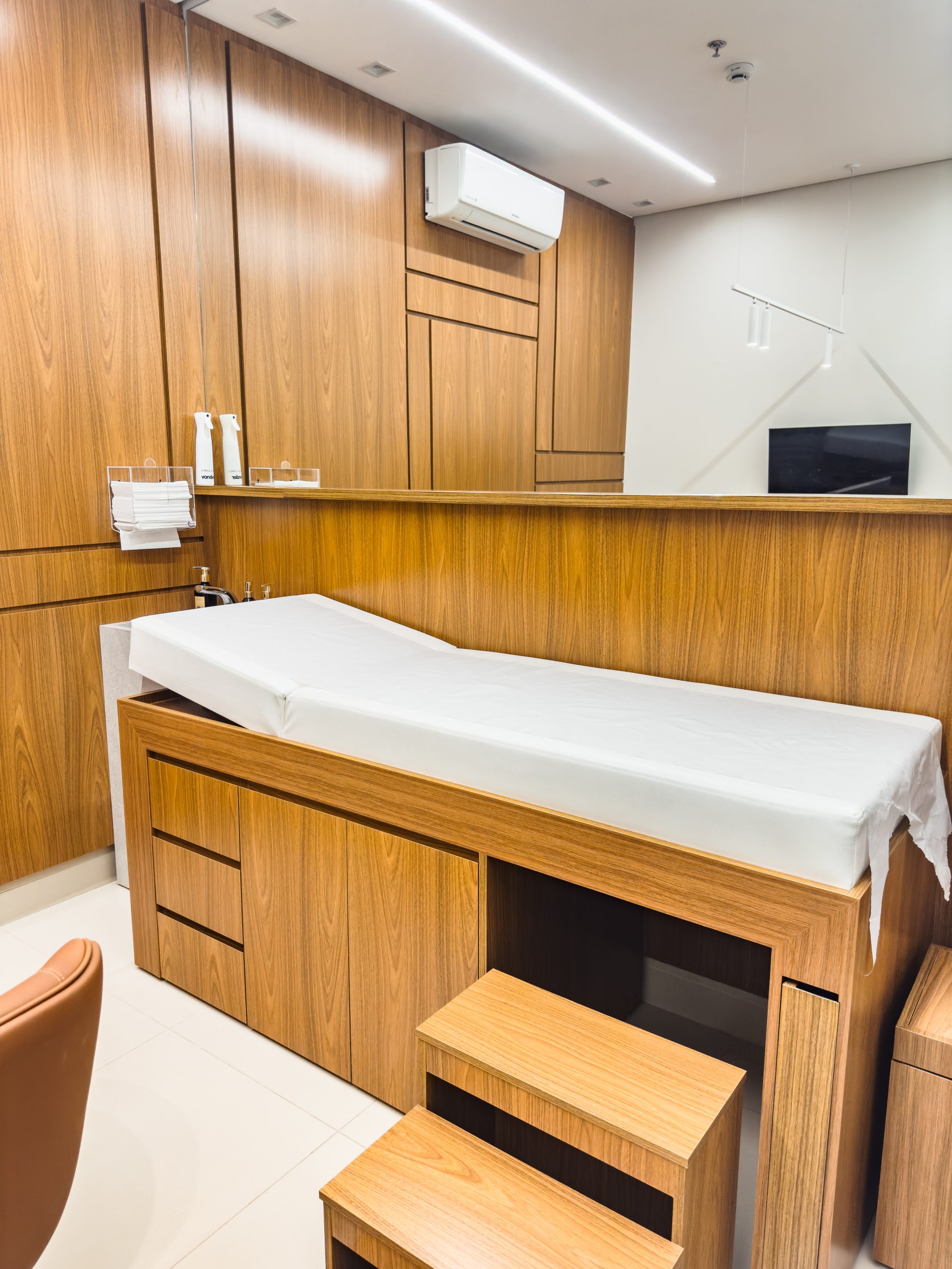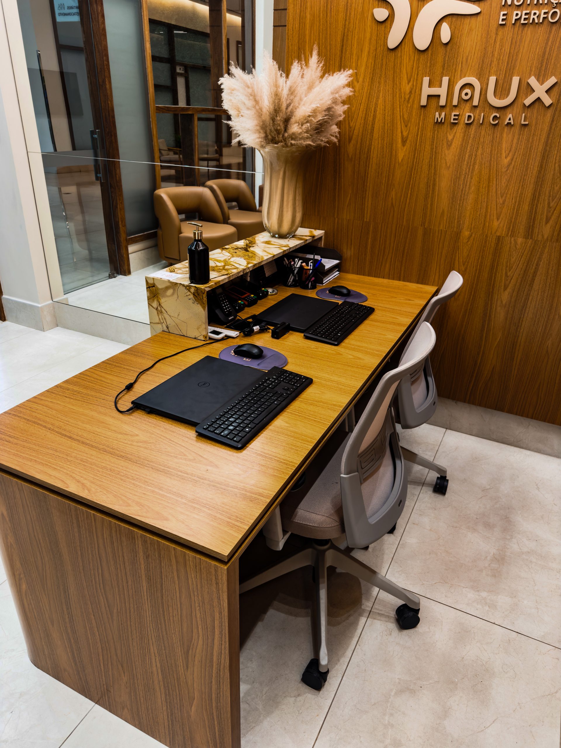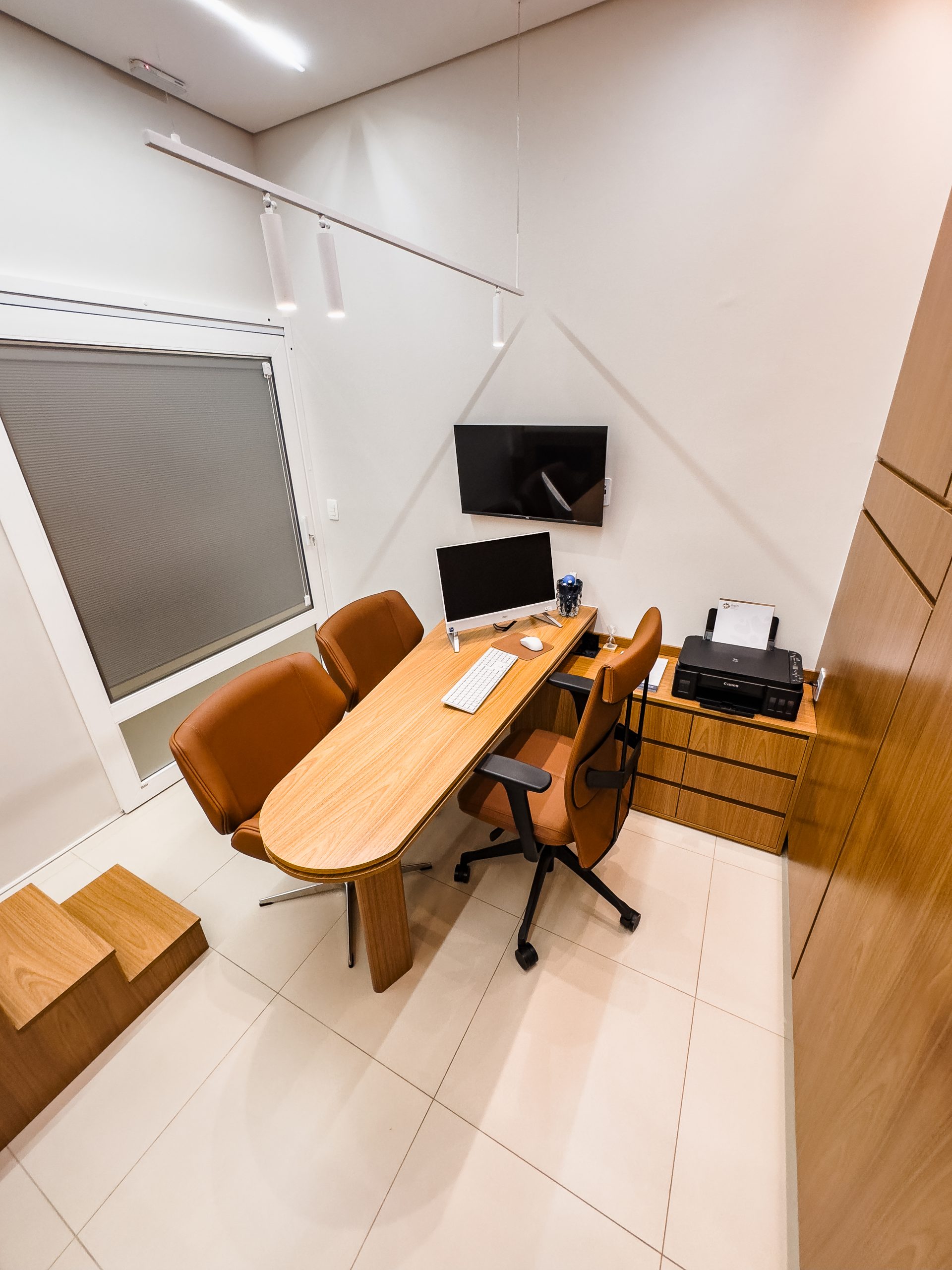 O Painel Integrado Áureo destaca como os móveis planejados transformam a recepção e o consultório em ambientes acolhedores, funcionais e sofisticados. A marcenaria em madeira envolve todo o espaço, criando continuidade visual e integrando nichos, portas camufladas e áreas de apoio com perfeição. A iluminação embutida valoriza os veios da madeira e reforça o tom elegante que acompanha o atendimento desde o primeiro contato.