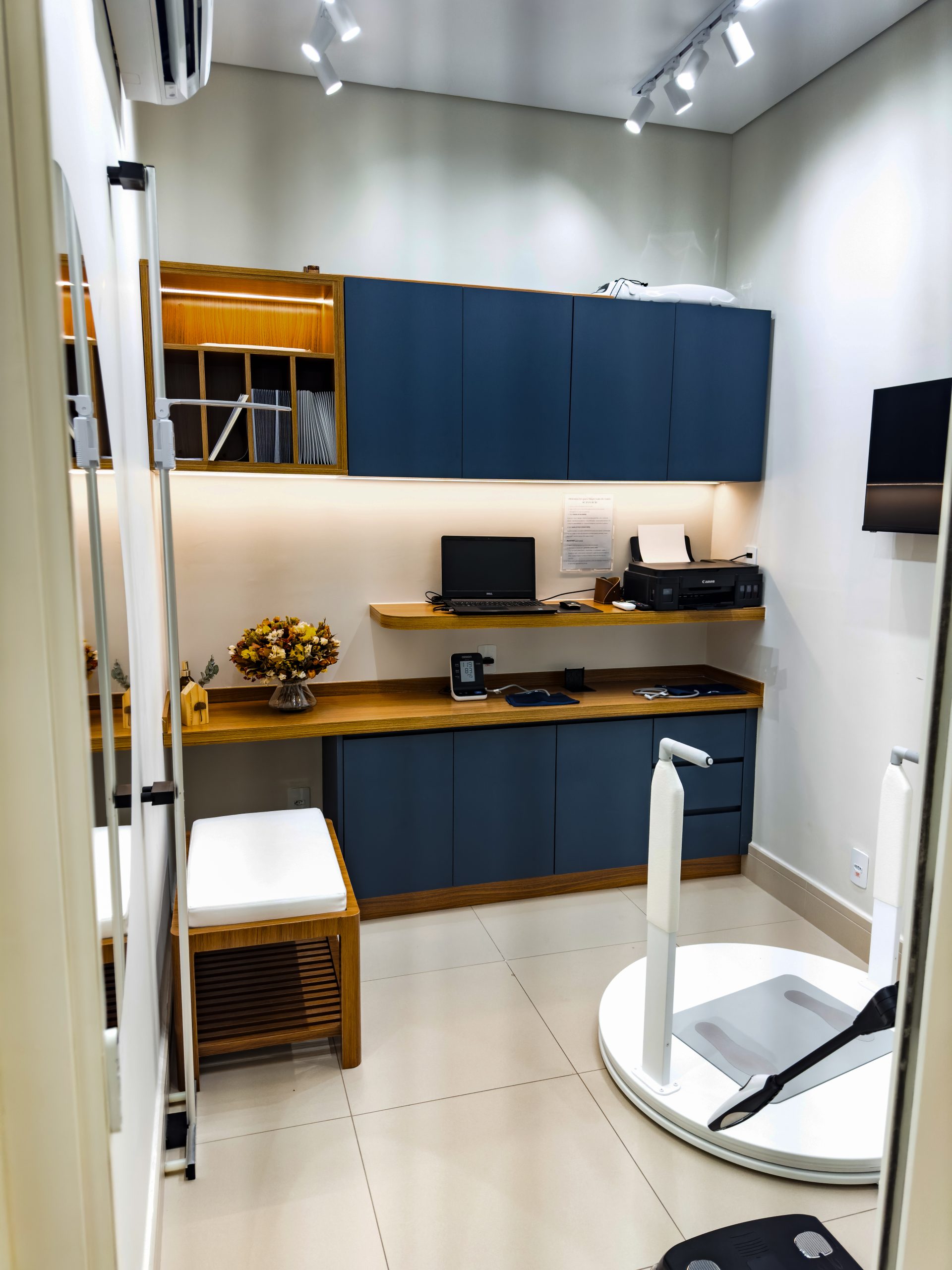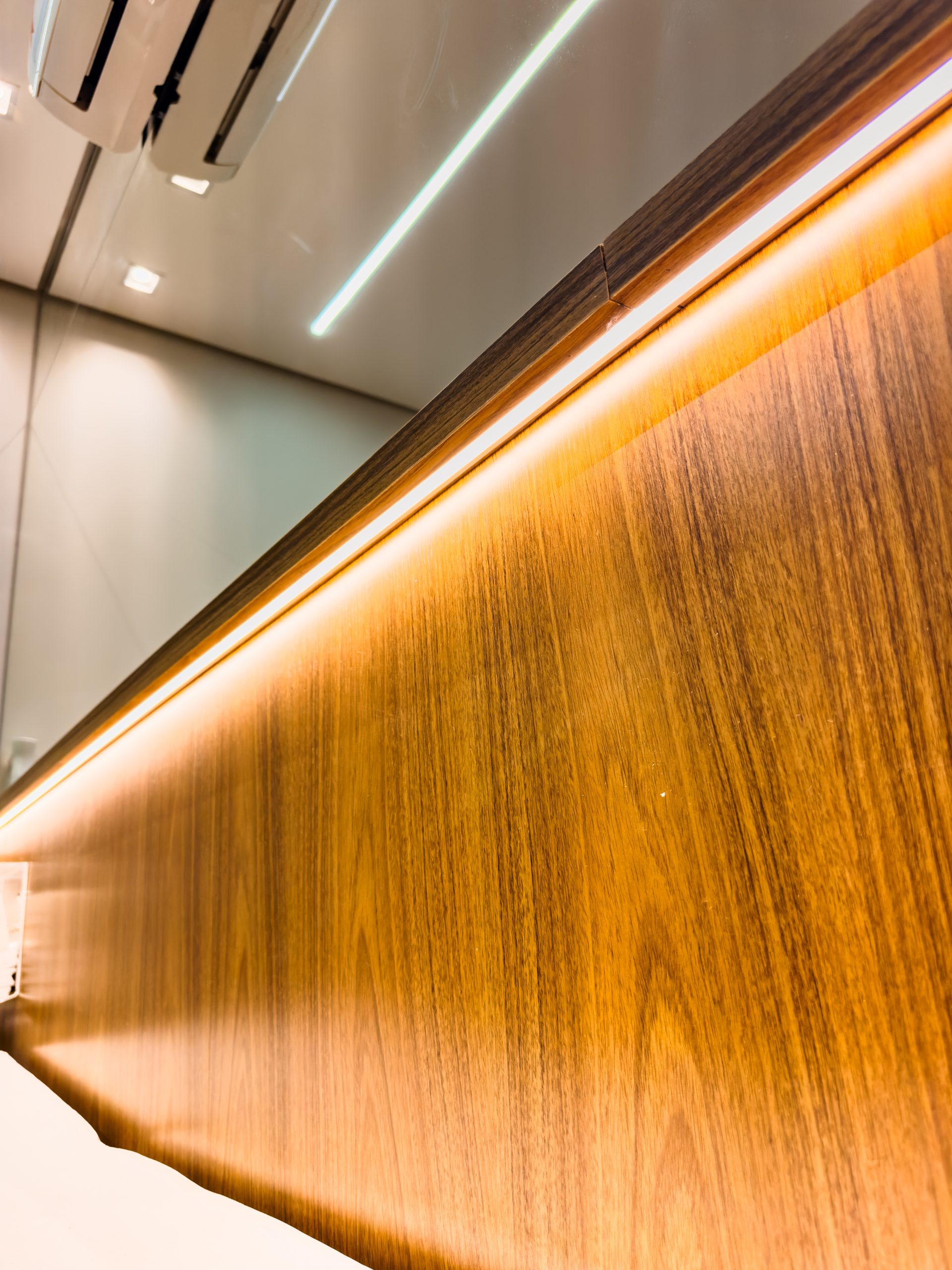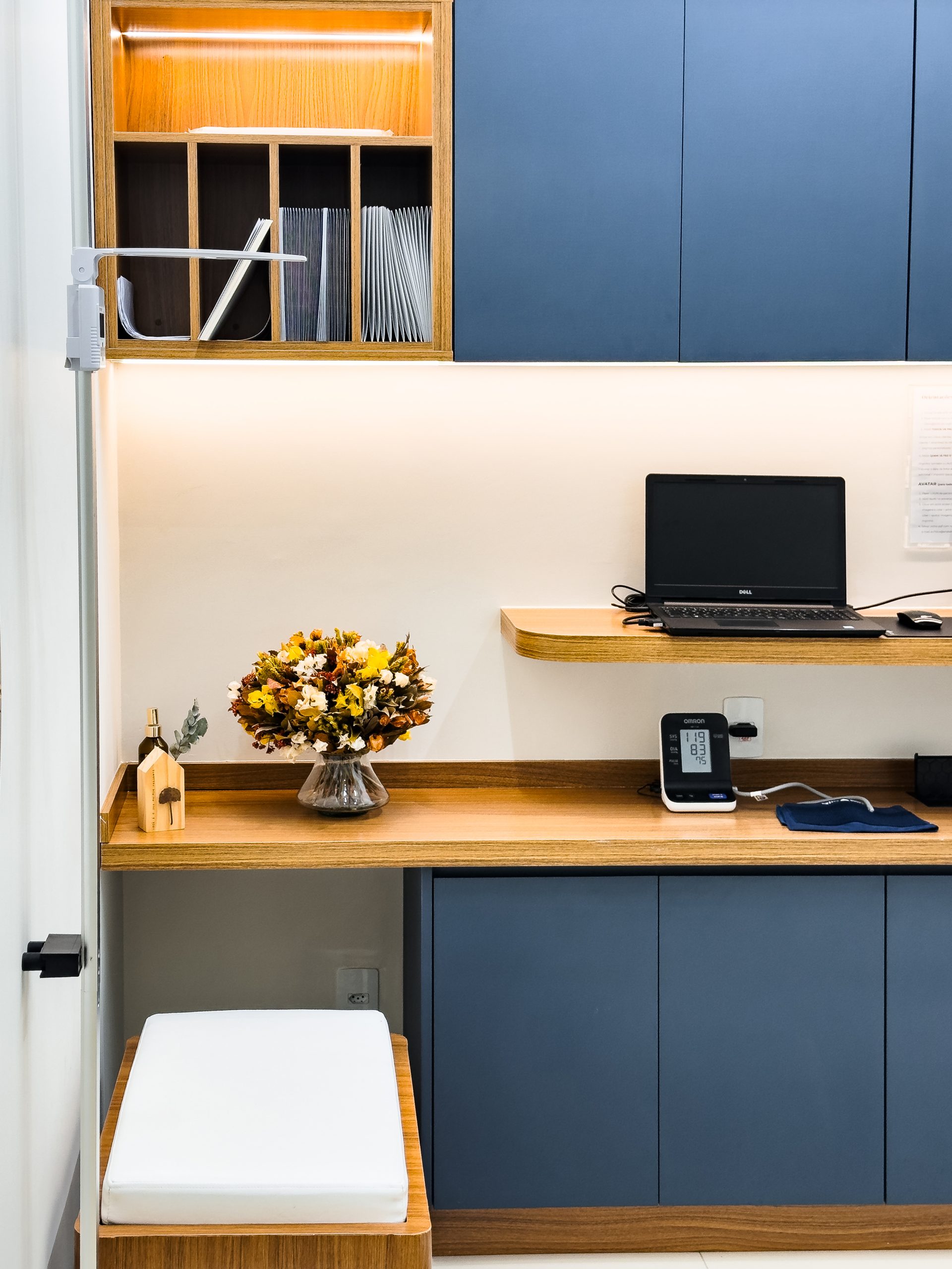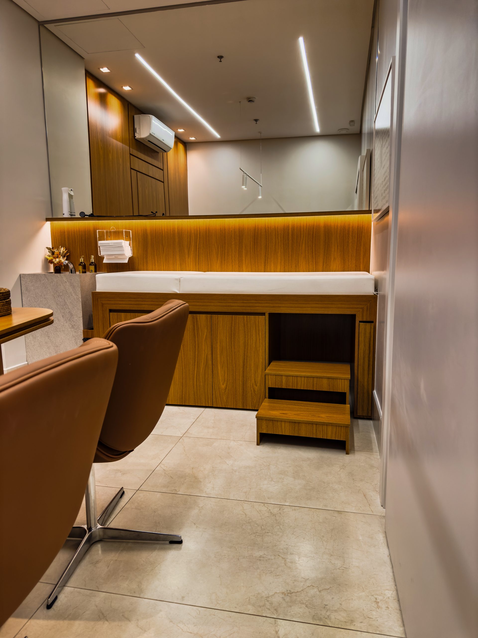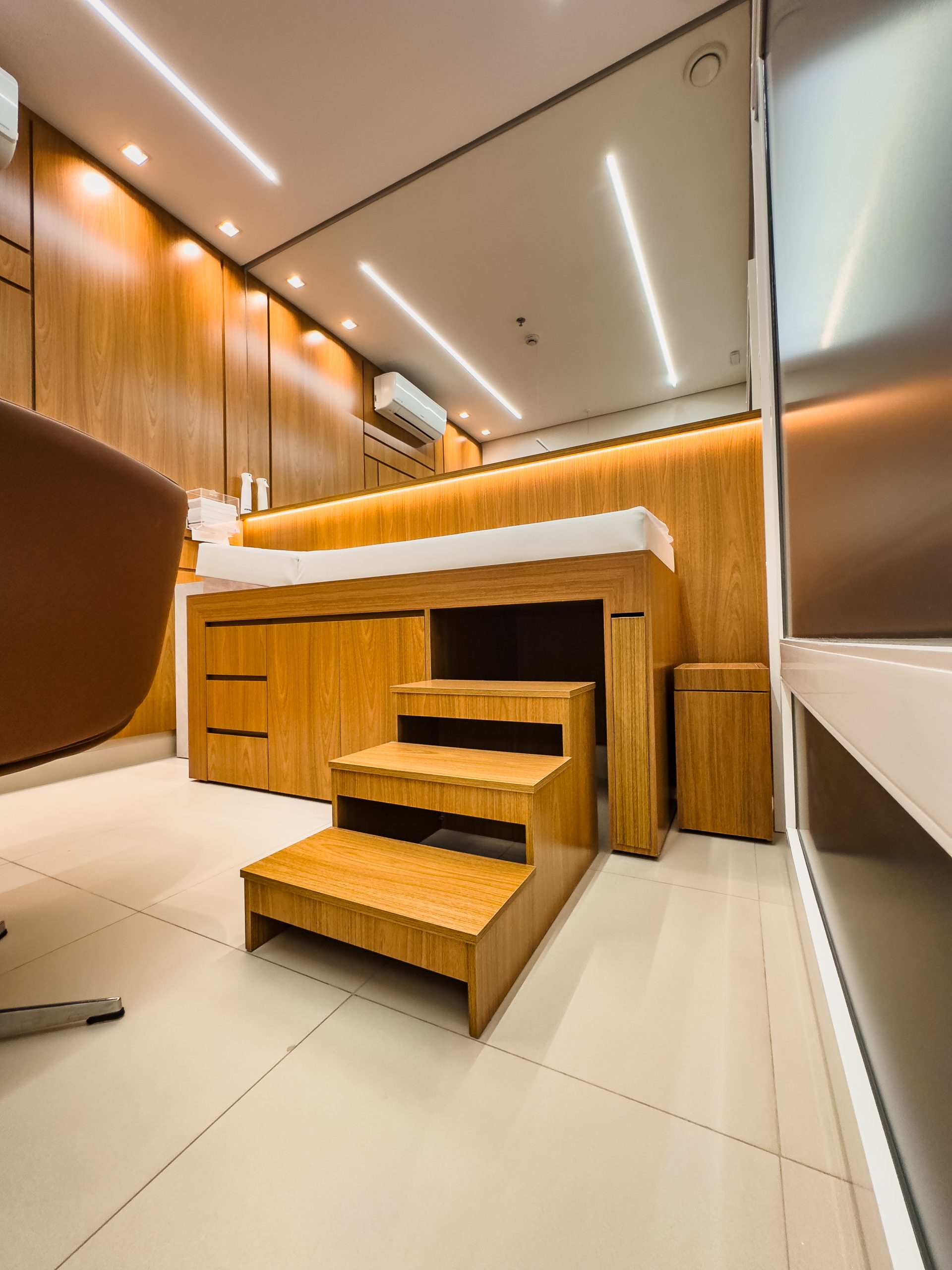O Painel Integrado Áureo destaca como os móveis planejados transformam a recepção e o consultório em ambientes acolhedores, funcionais e sofisticados. A marcenaria em madeira envolve todo o espaço, criando continuidade visual e integrando nichos, portas camufladas e áreas de apoio com perfeição. A iluminação embutida valoriza os veios da madeira e reforça o tom elegante que acompanha o atendimento desde o primeiro contato.