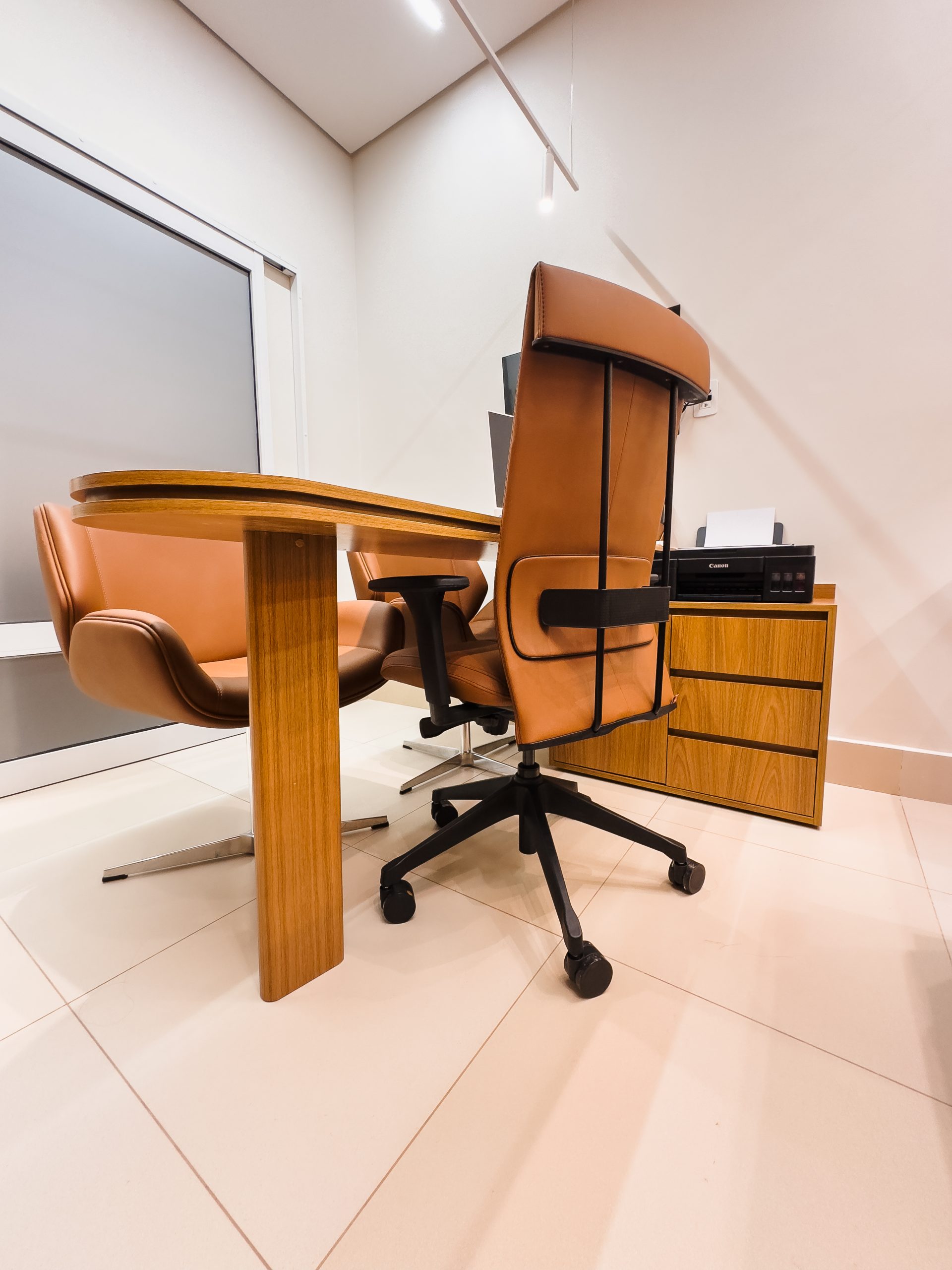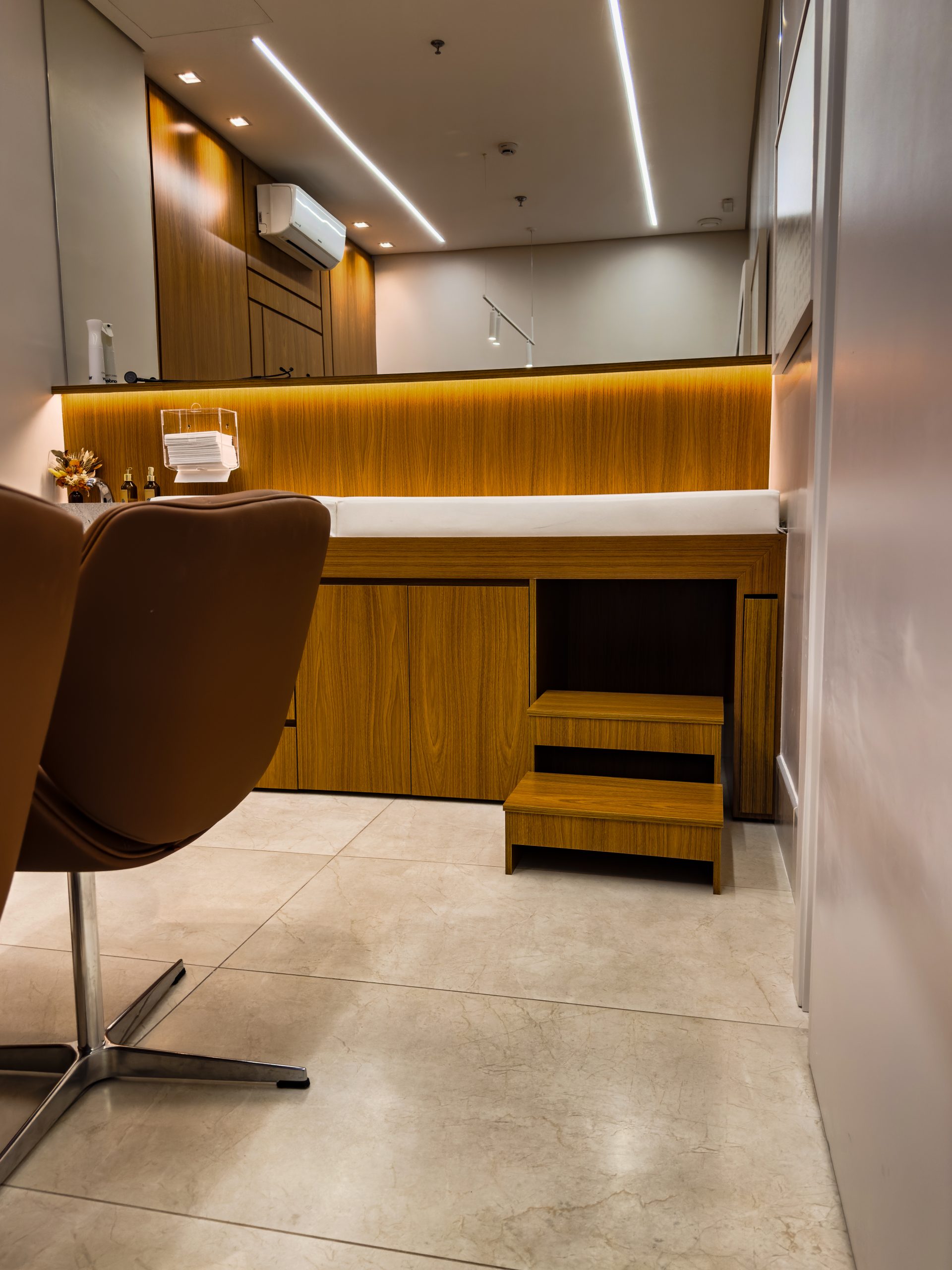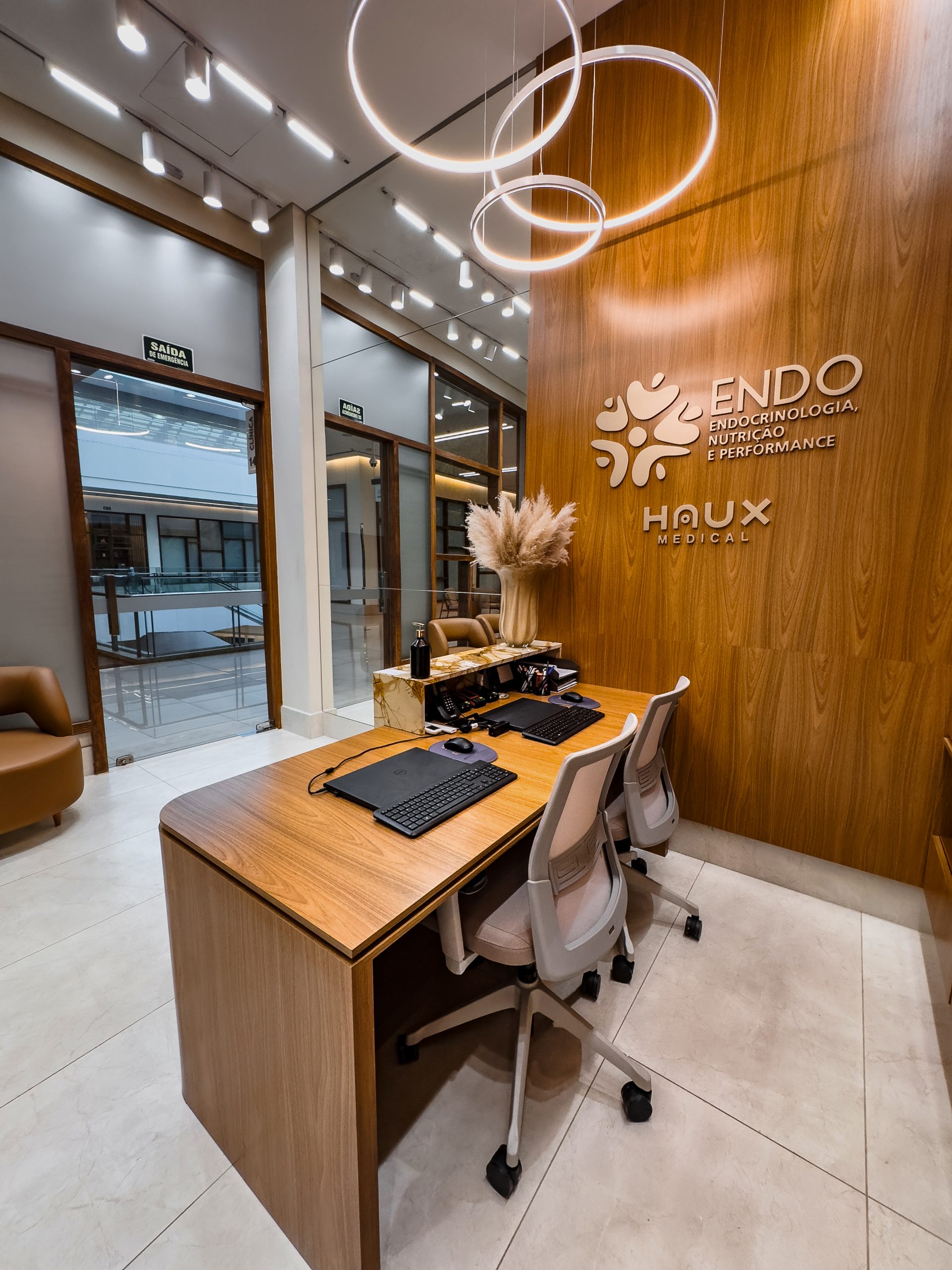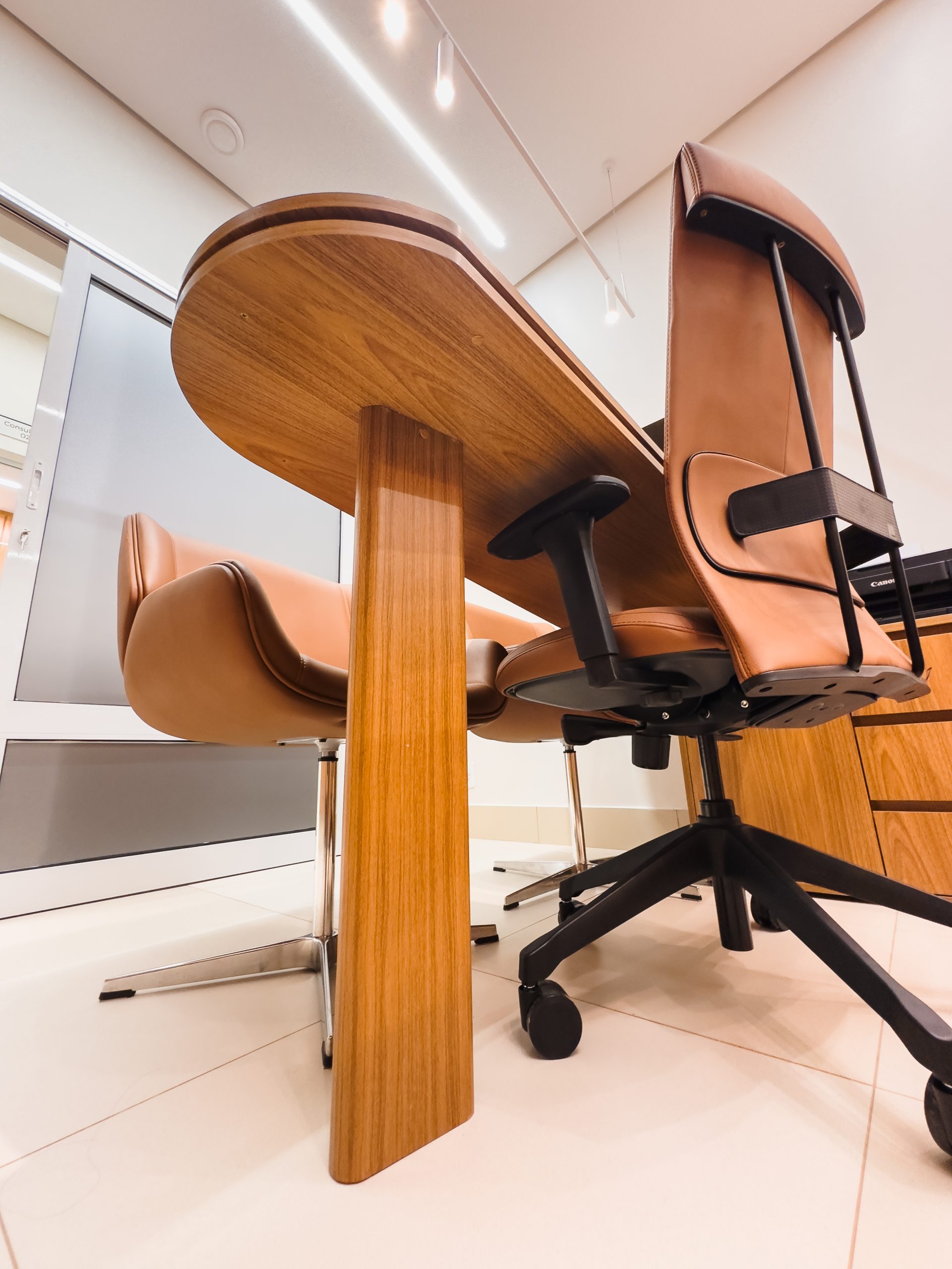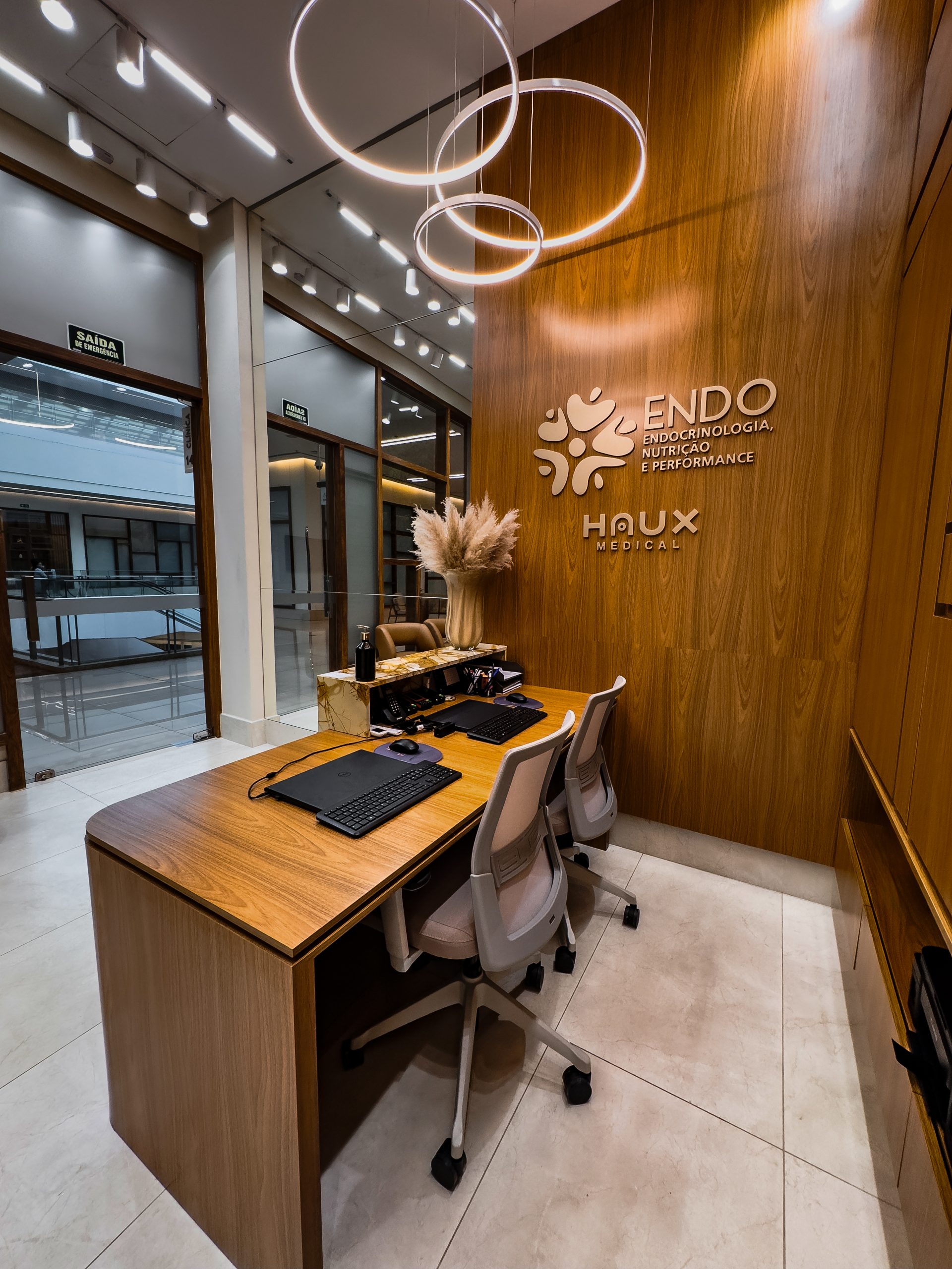 O Painel Integrado Áureo destaca como os móveis planejados transformam a recepção e o consultório em ambientes acolhedores, funcionais e sofisticados. A marcenaria em madeira envolve todo o espaço, criando continuidade visual e integrando nichos, portas camufladas e áreas de apoio com perfeição. A iluminação embutida valoriza os veios da madeira e reforça o tom elegante que acompanha o atendimento desde o primeiro contato.