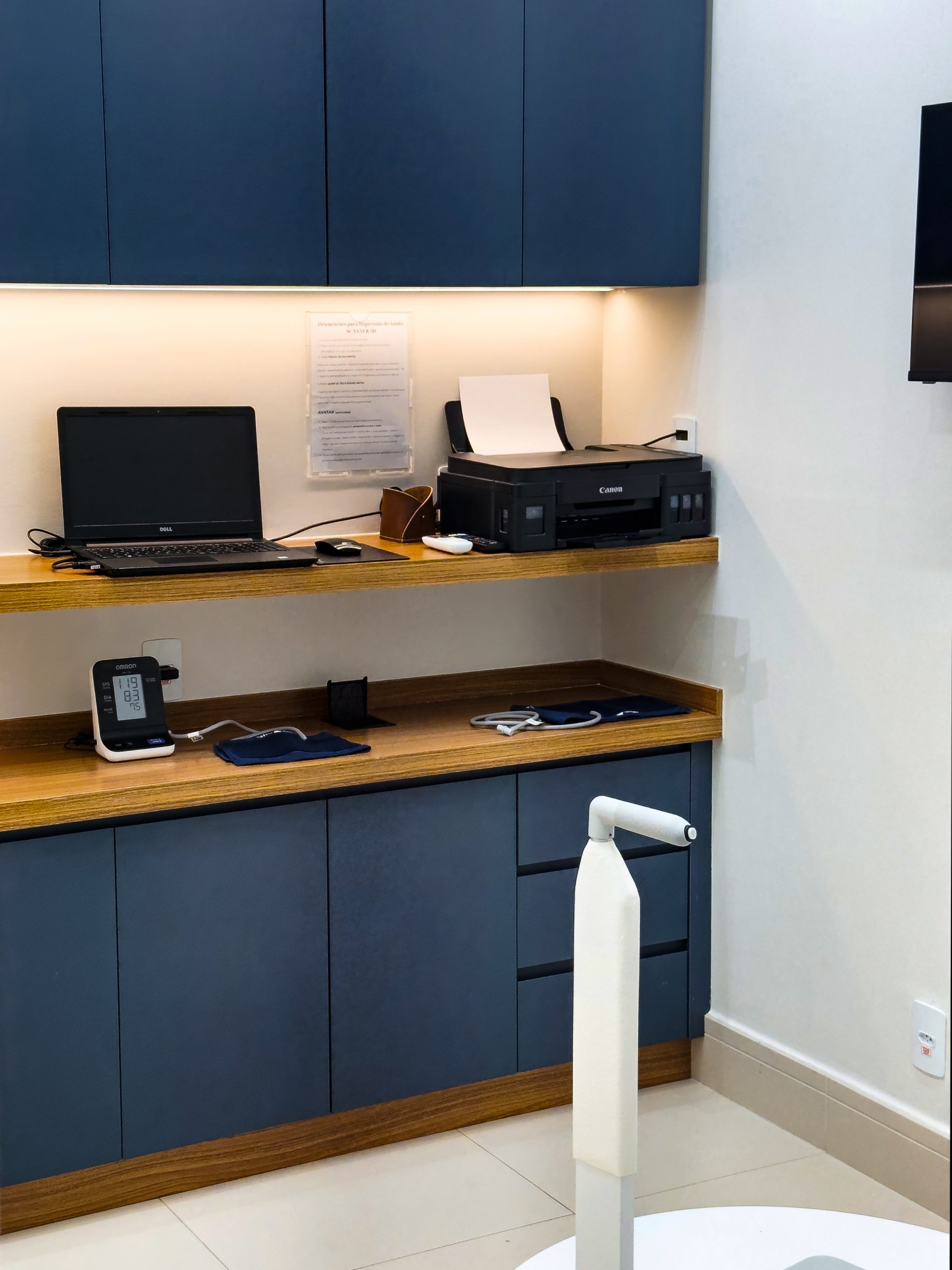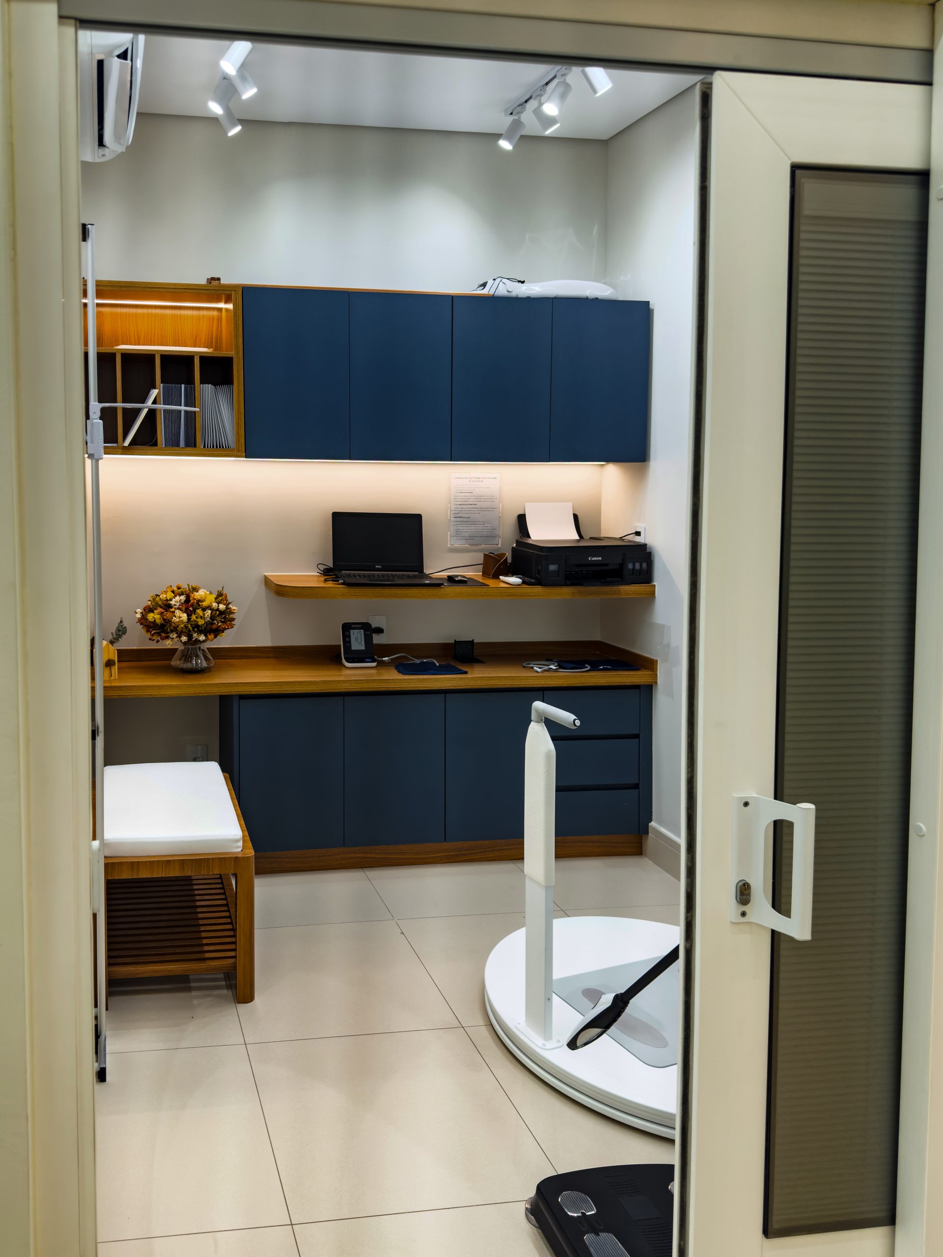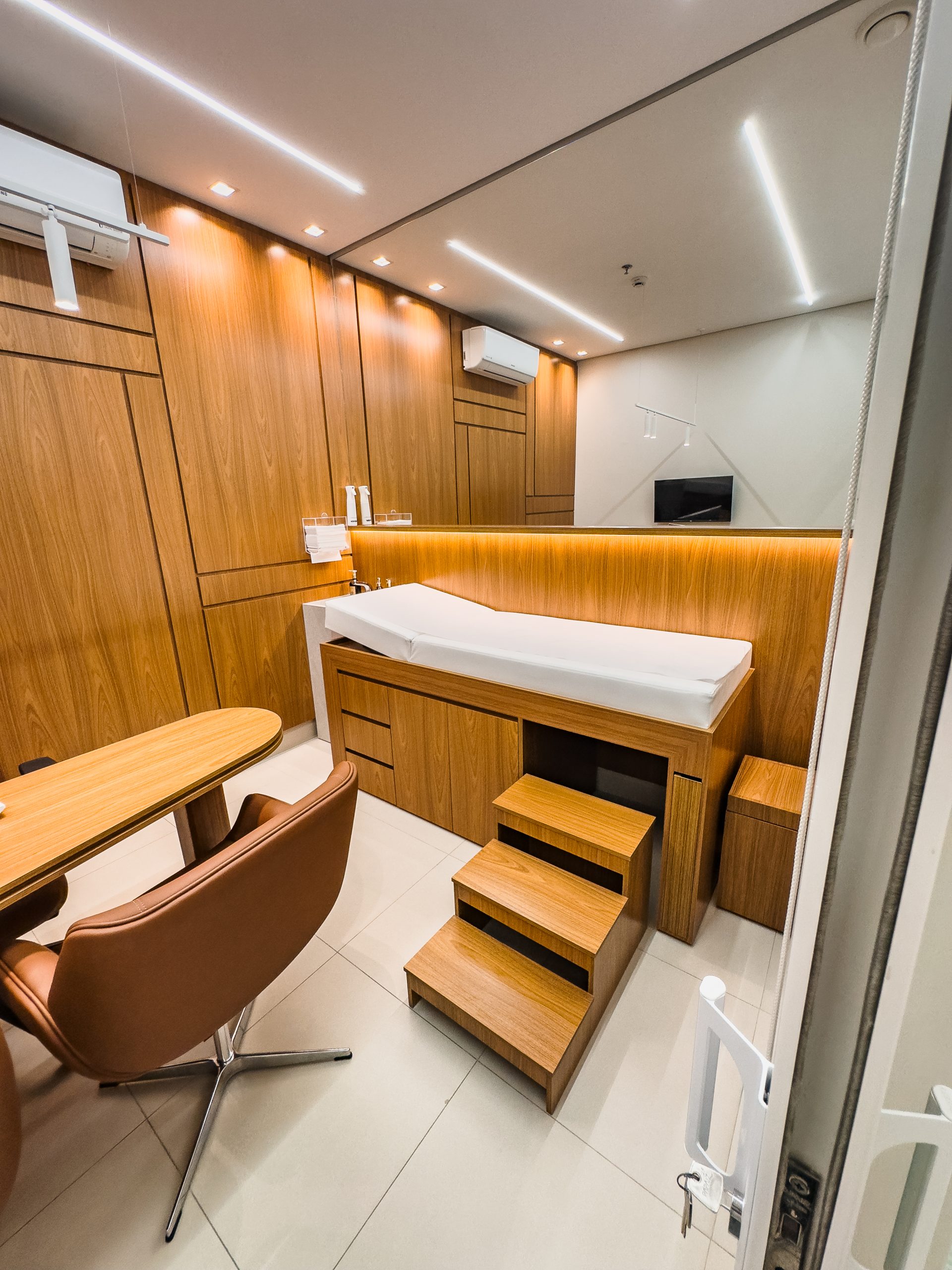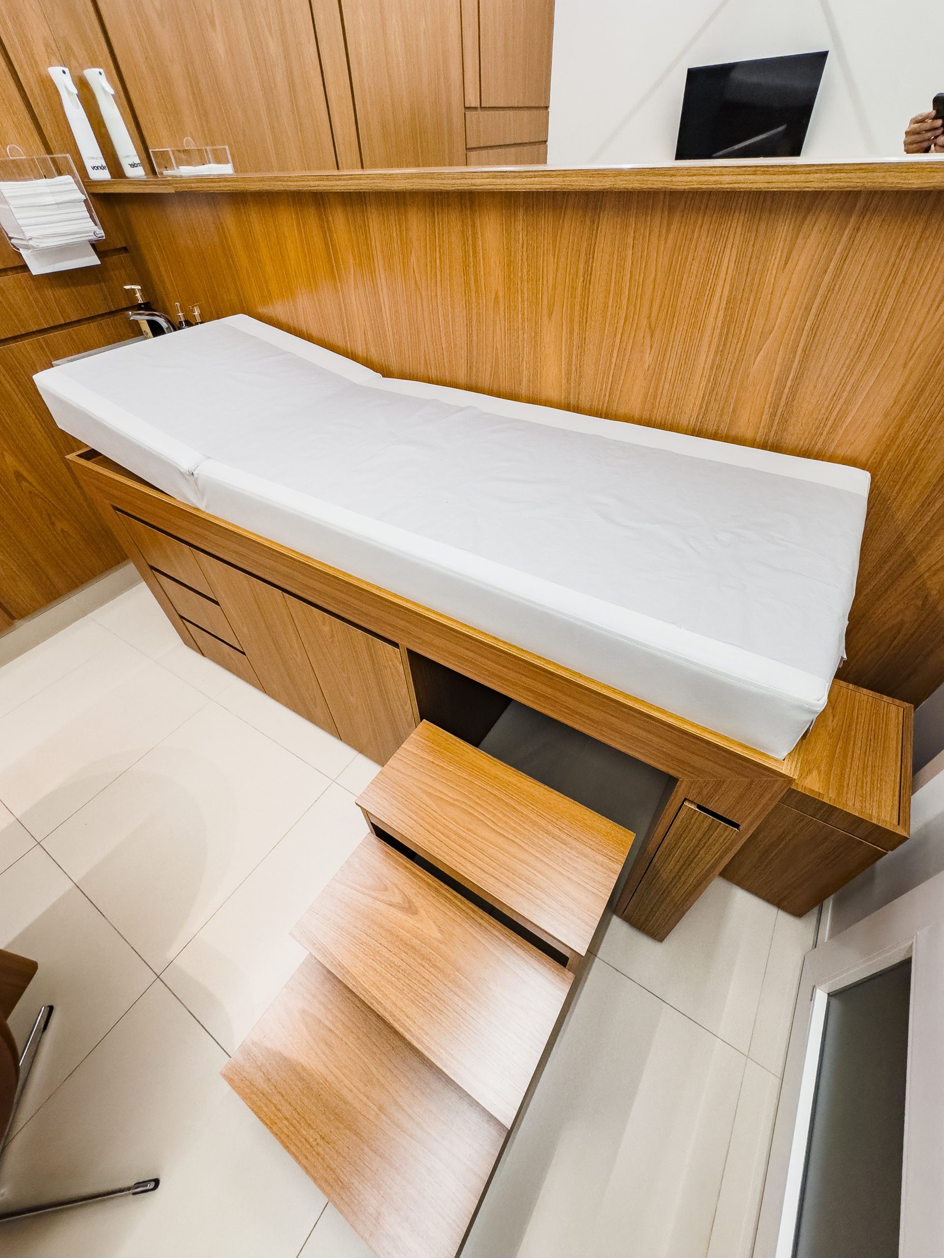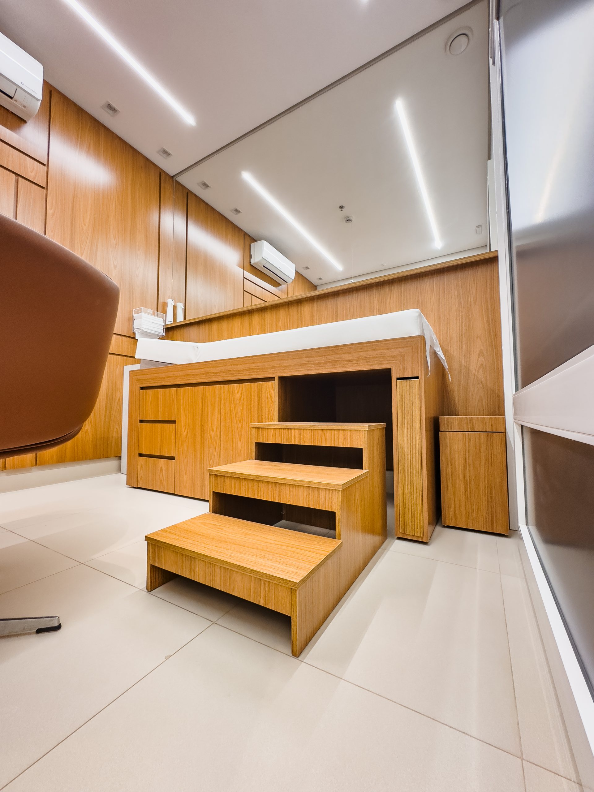 O Painel Integrado Áureo destaca como os móveis planejados transformam a recepção e o consultório em ambientes acolhedores, funcionais e sofisticados. A marcenaria em madeira envolve todo o espaço, criando continuidade visual e integrando nichos, portas camufladas e áreas de apoio com perfeição. A iluminação embutida valoriza os veios da madeira e reforça o tom elegante que acompanha o atendimento desde o primeiro contato.