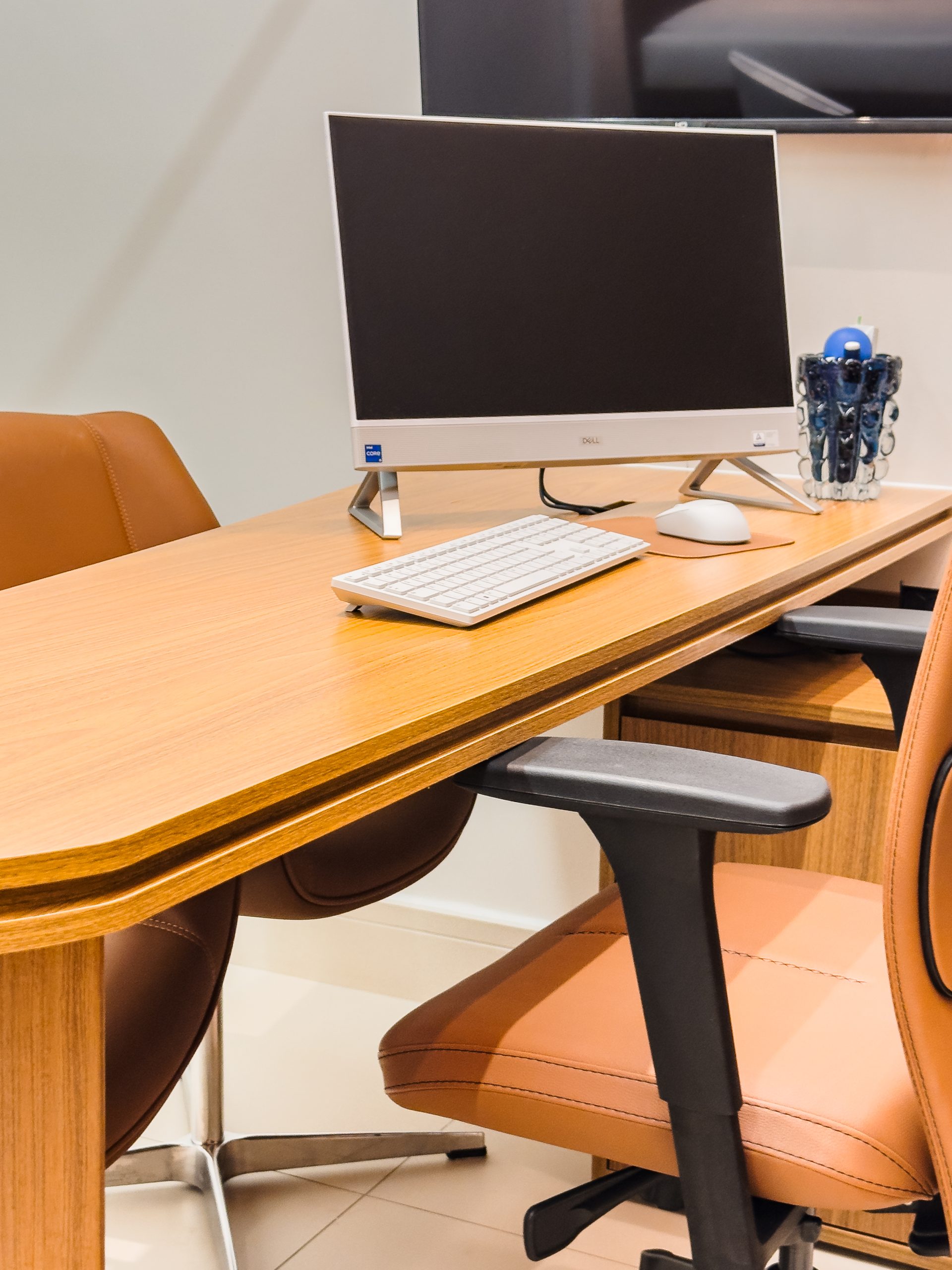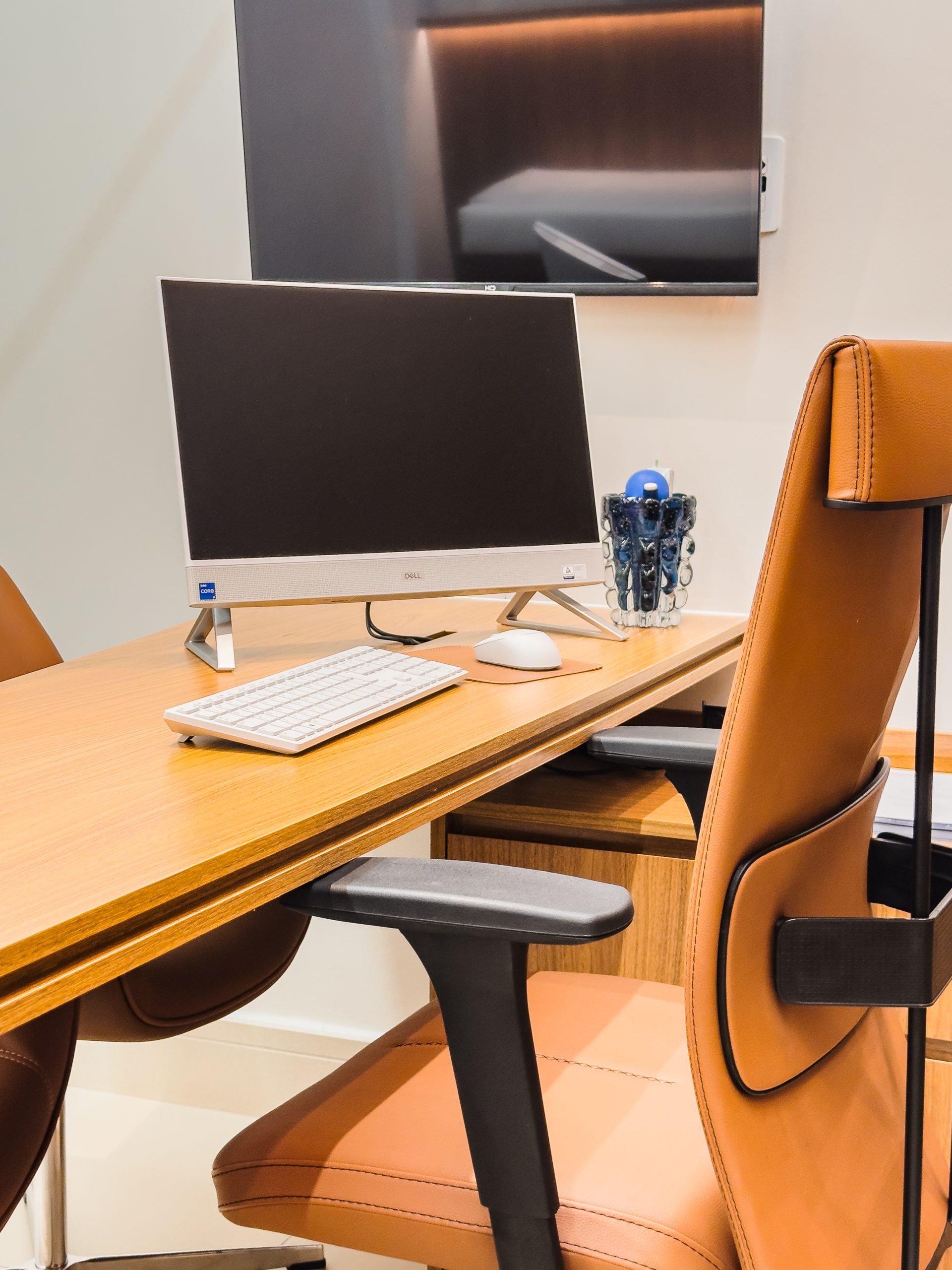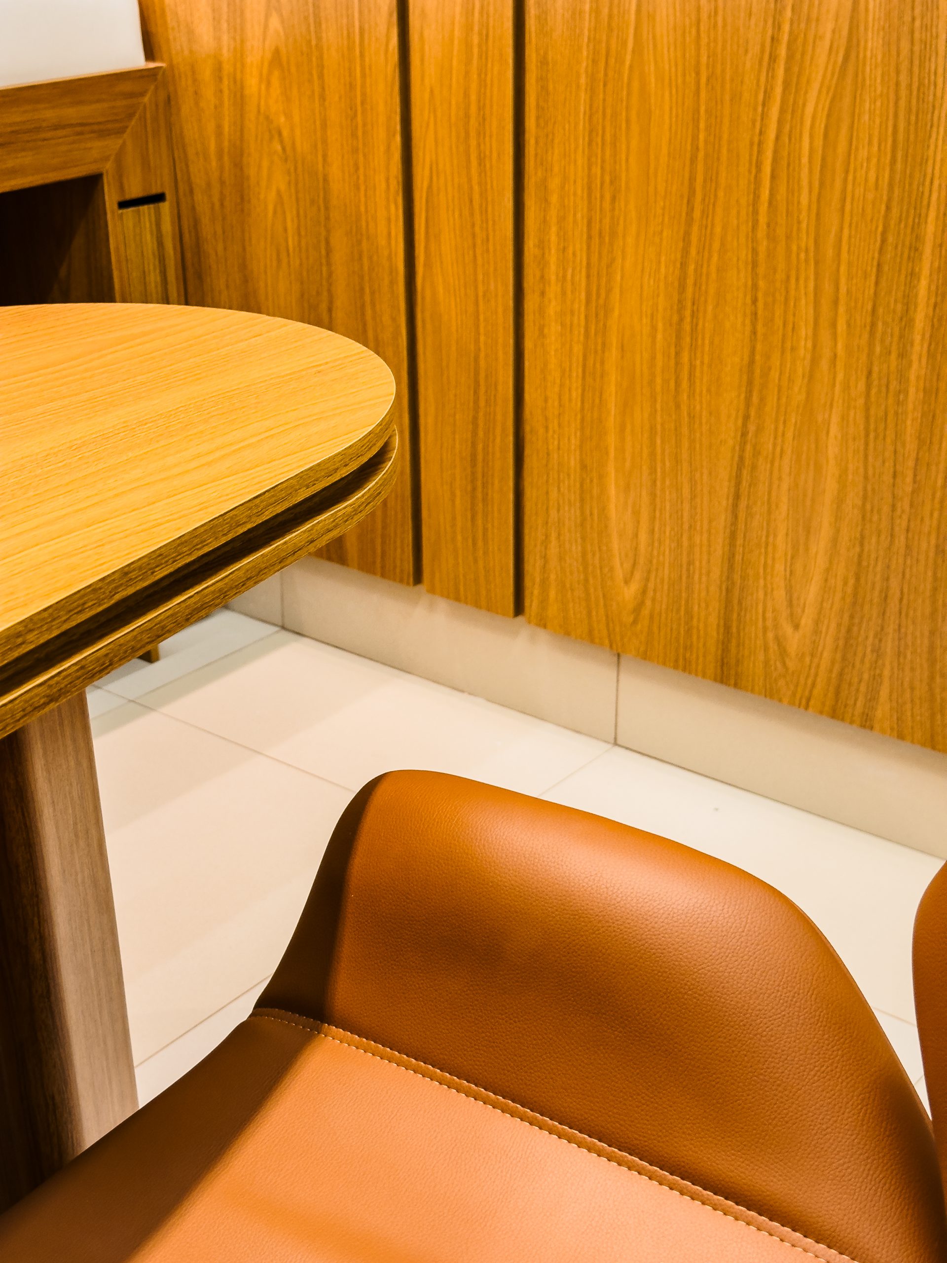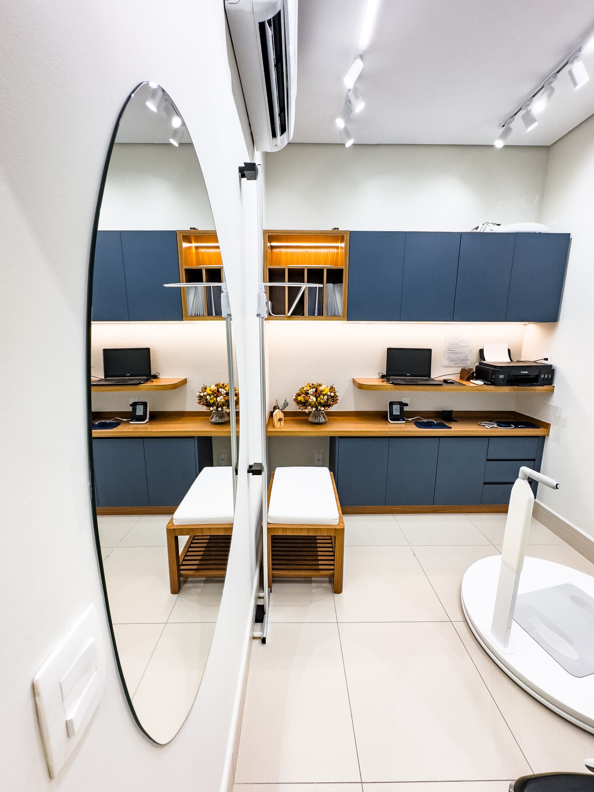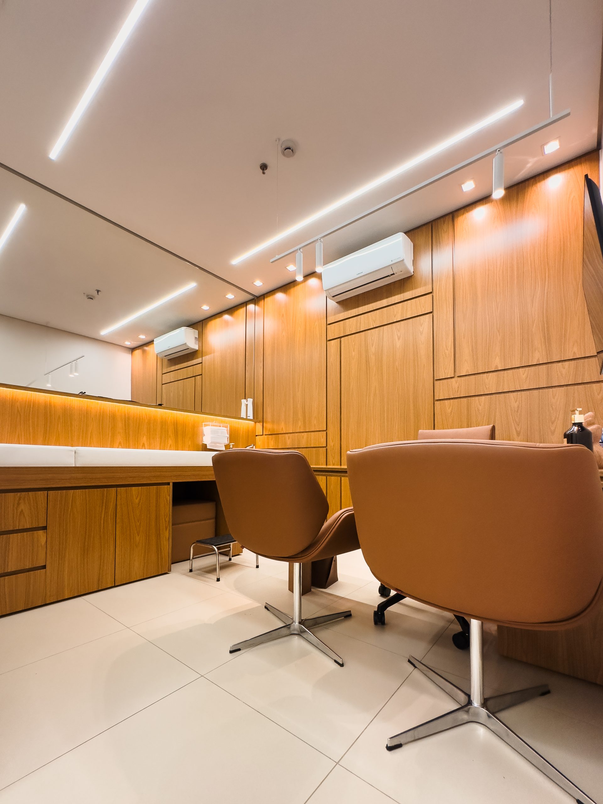 O Painel Integrado Áureo destaca como os móveis planejados transformam a recepção e o consultório em ambientes acolhedores, funcionais e sofisticados. A marcenaria em madeira envolve todo o espaço, criando continuidade visual e integrando nichos, portas camufladas e áreas de apoio com perfeição. A iluminação embutida valoriza os veios da madeira e reforça o tom elegante que acompanha o atendimento desde o primeiro contato.