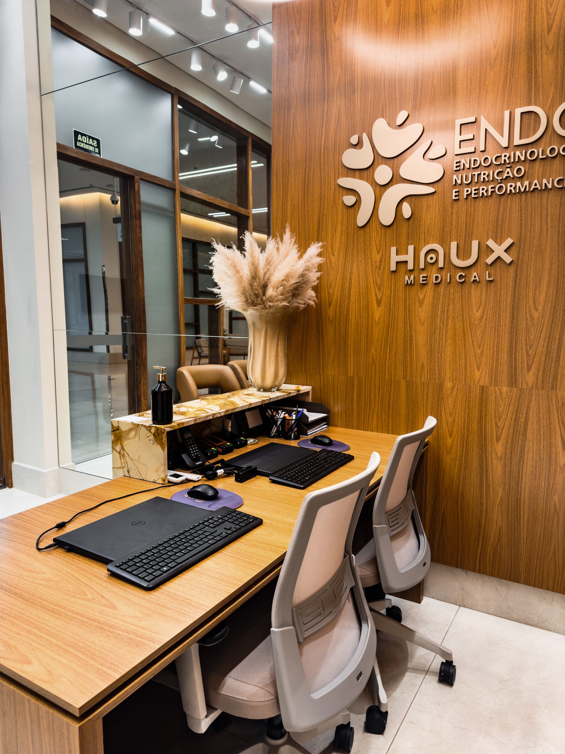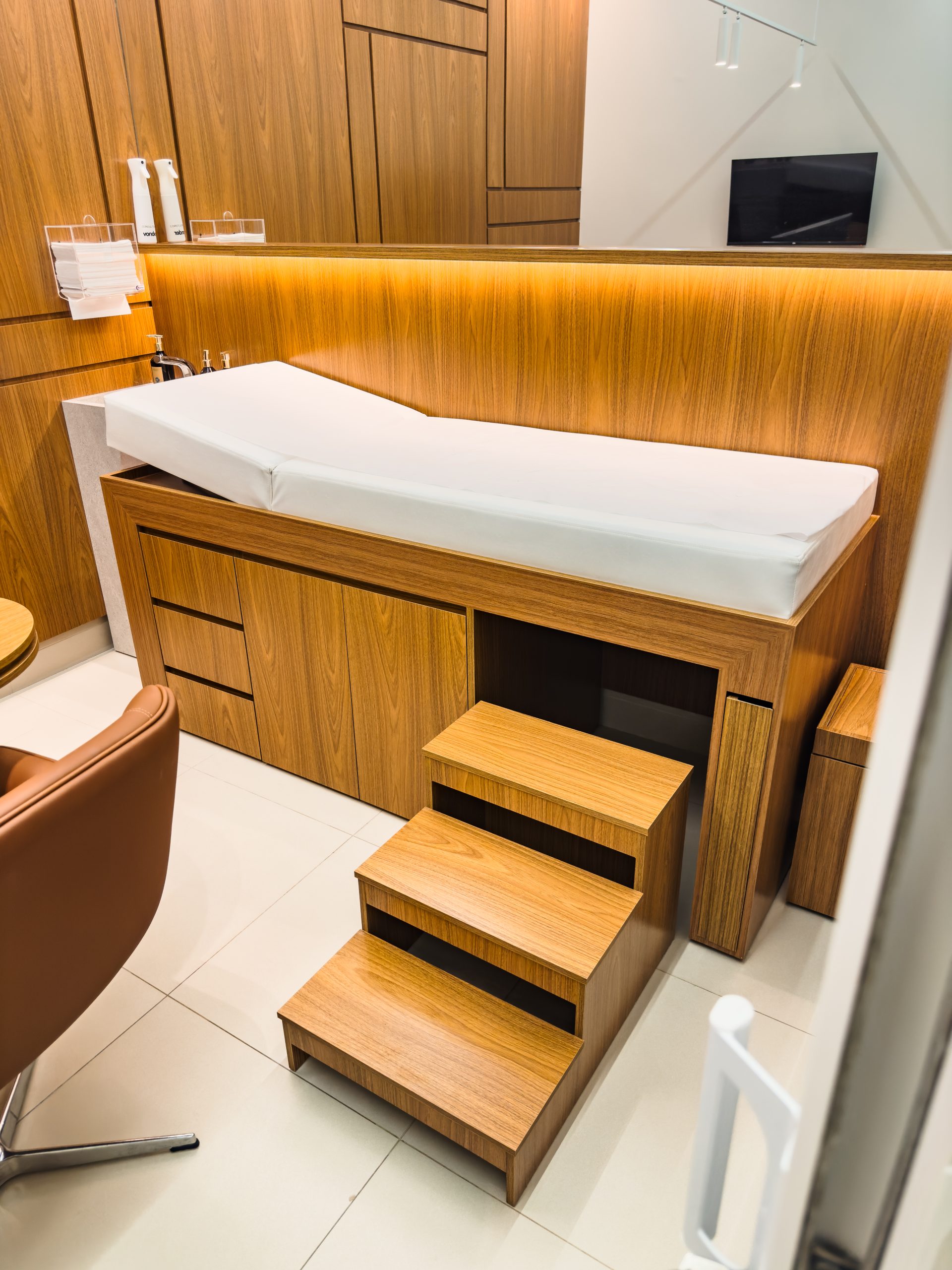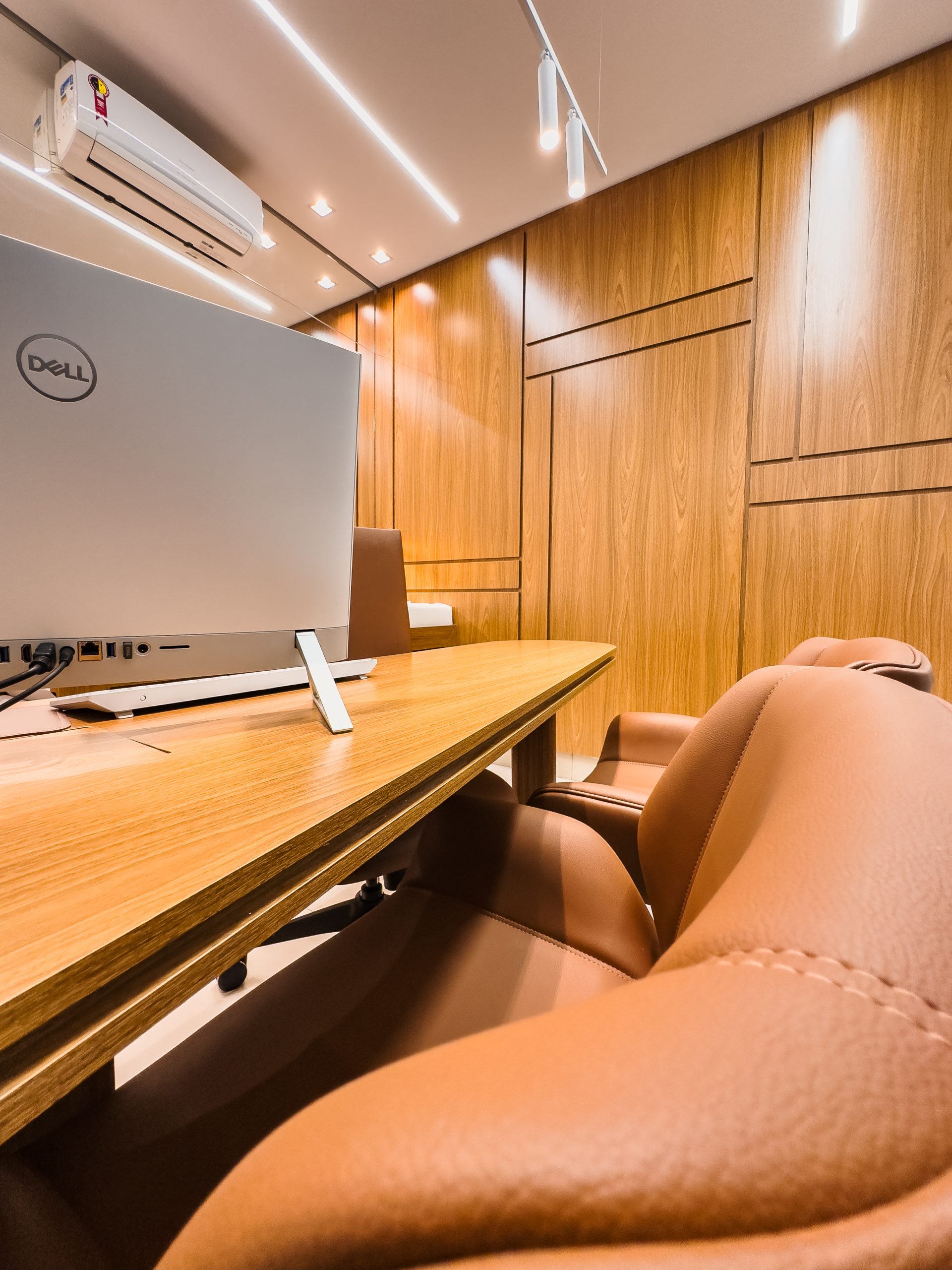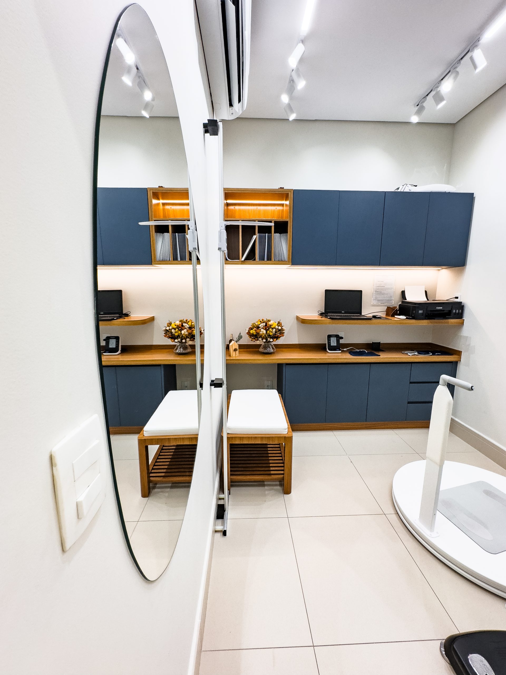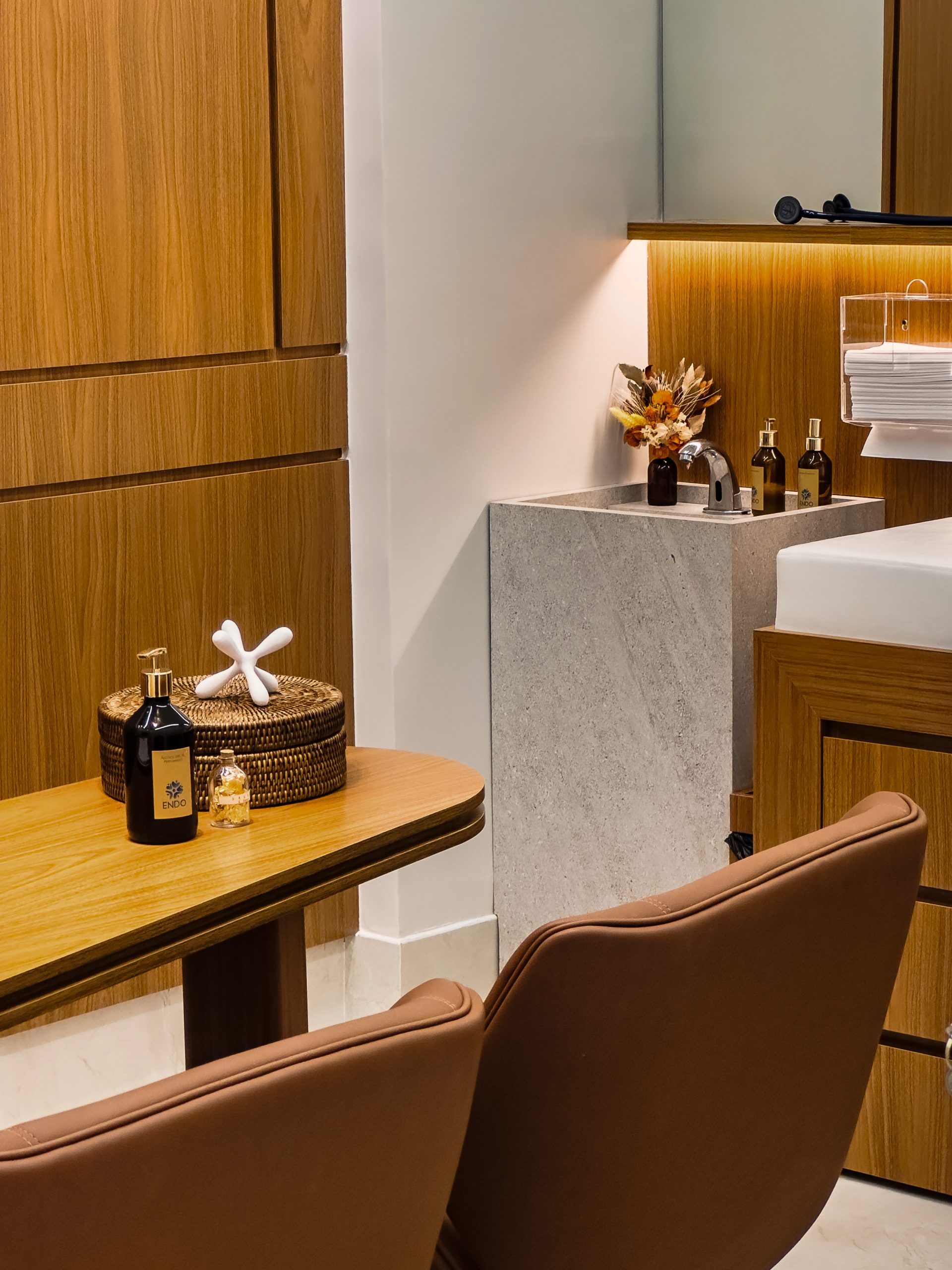 O Painel Integrado Áureo destaca como os móveis planejados transformam a recepção e o consultório em ambientes acolhedores, funcionais e sofisticados. A marcenaria em madeira envolve todo o espaço, criando continuidade visual e integrando nichos, portas camufladas e áreas de apoio com perfeição. A iluminação embutida valoriza os veios da madeira e reforça o tom elegante que acompanha o atendimento desde o primeiro contato.