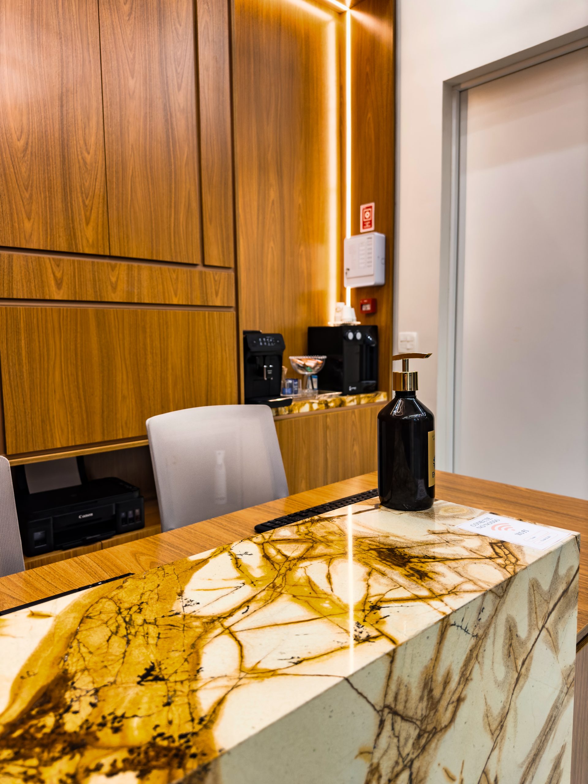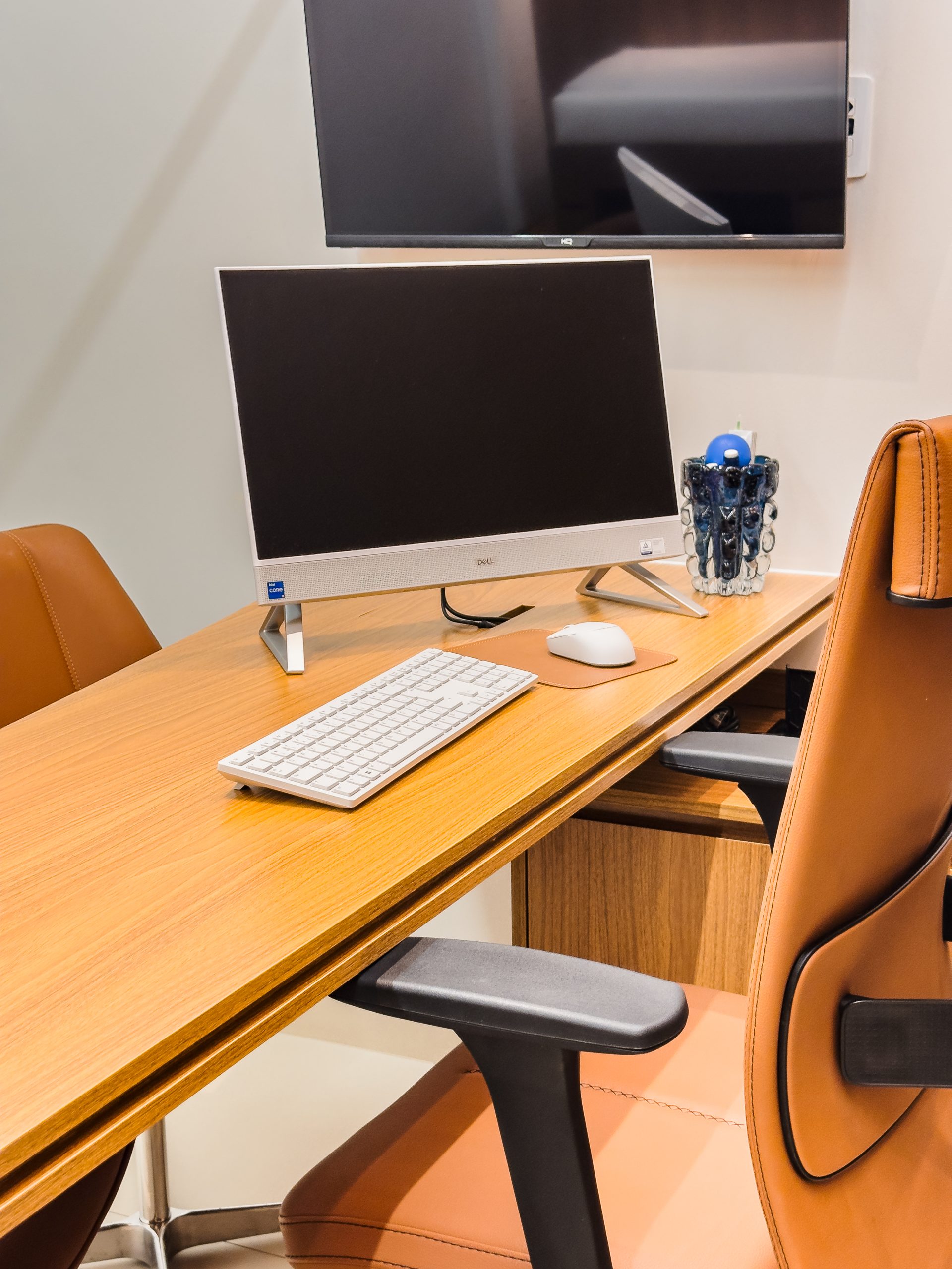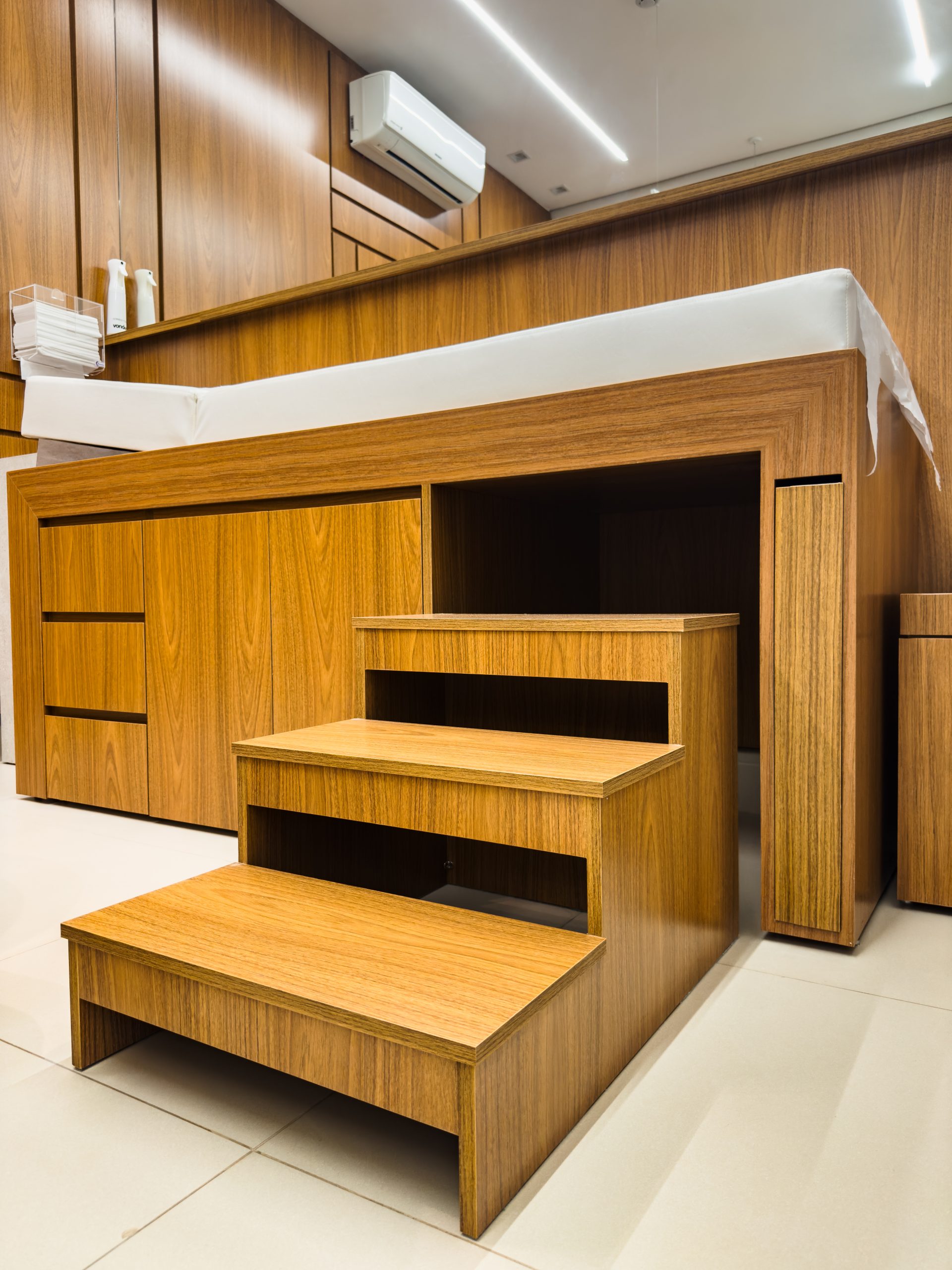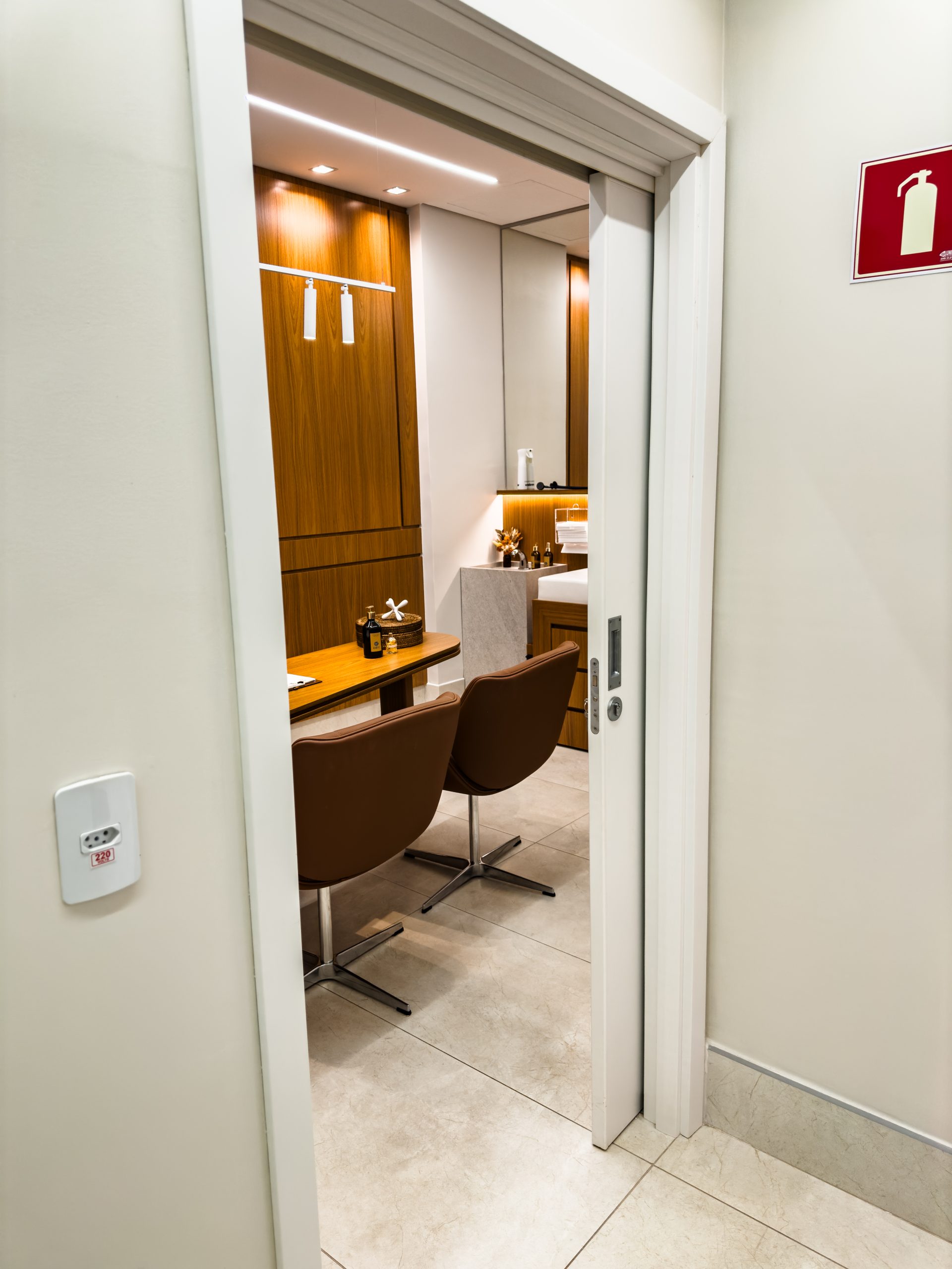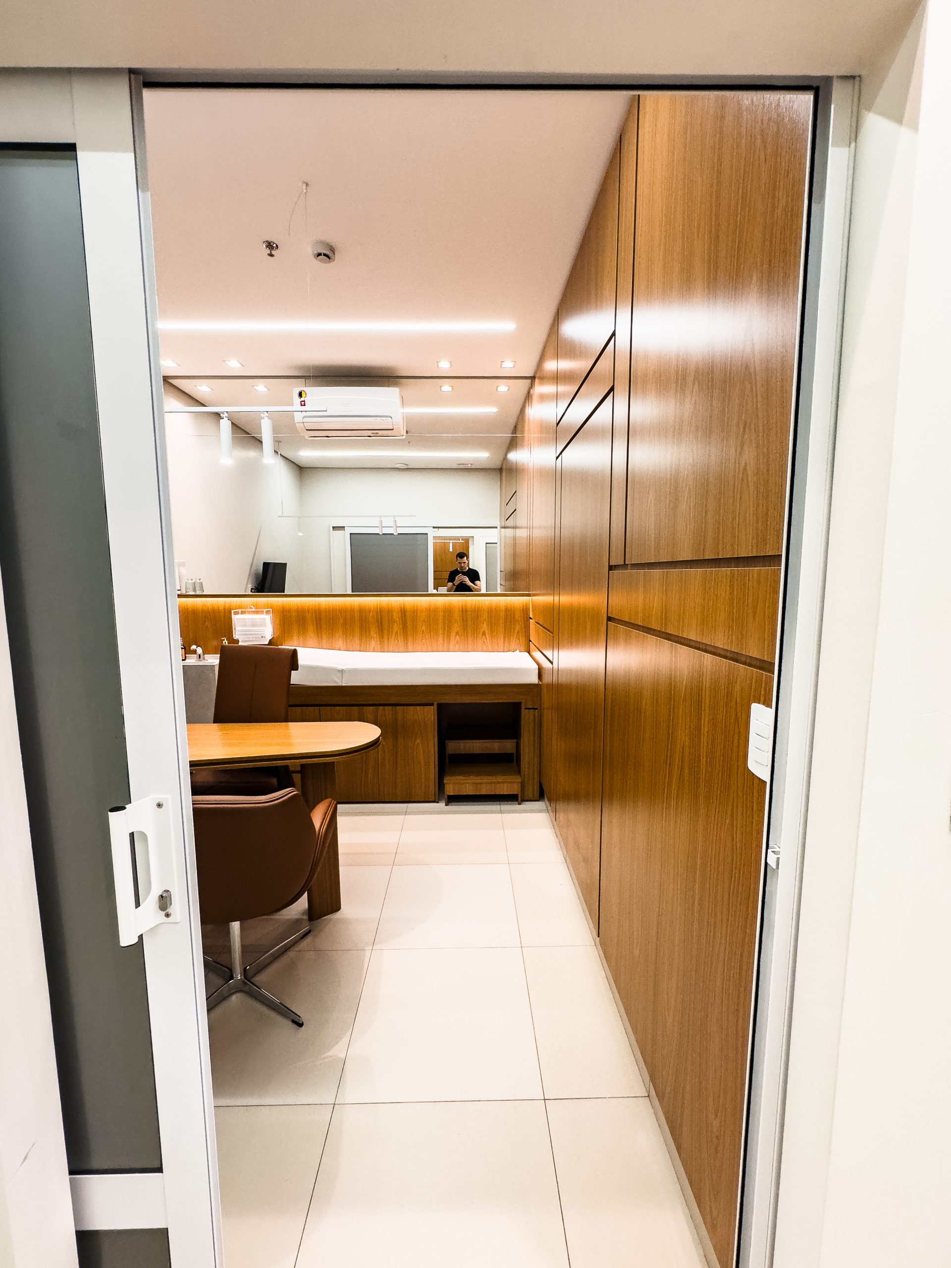 O Painel Integrado Áureo destaca como os móveis planejados transformam a recepção e o consultório em ambientes acolhedores, funcionais e sofisticados. A marcenaria em madeira envolve todo o espaço, criando continuidade visual e integrando nichos, portas camufladas e áreas de apoio com perfeição. A iluminação embutida valoriza os veios da madeira e reforça o tom elegante que acompanha o atendimento desde o primeiro contato.