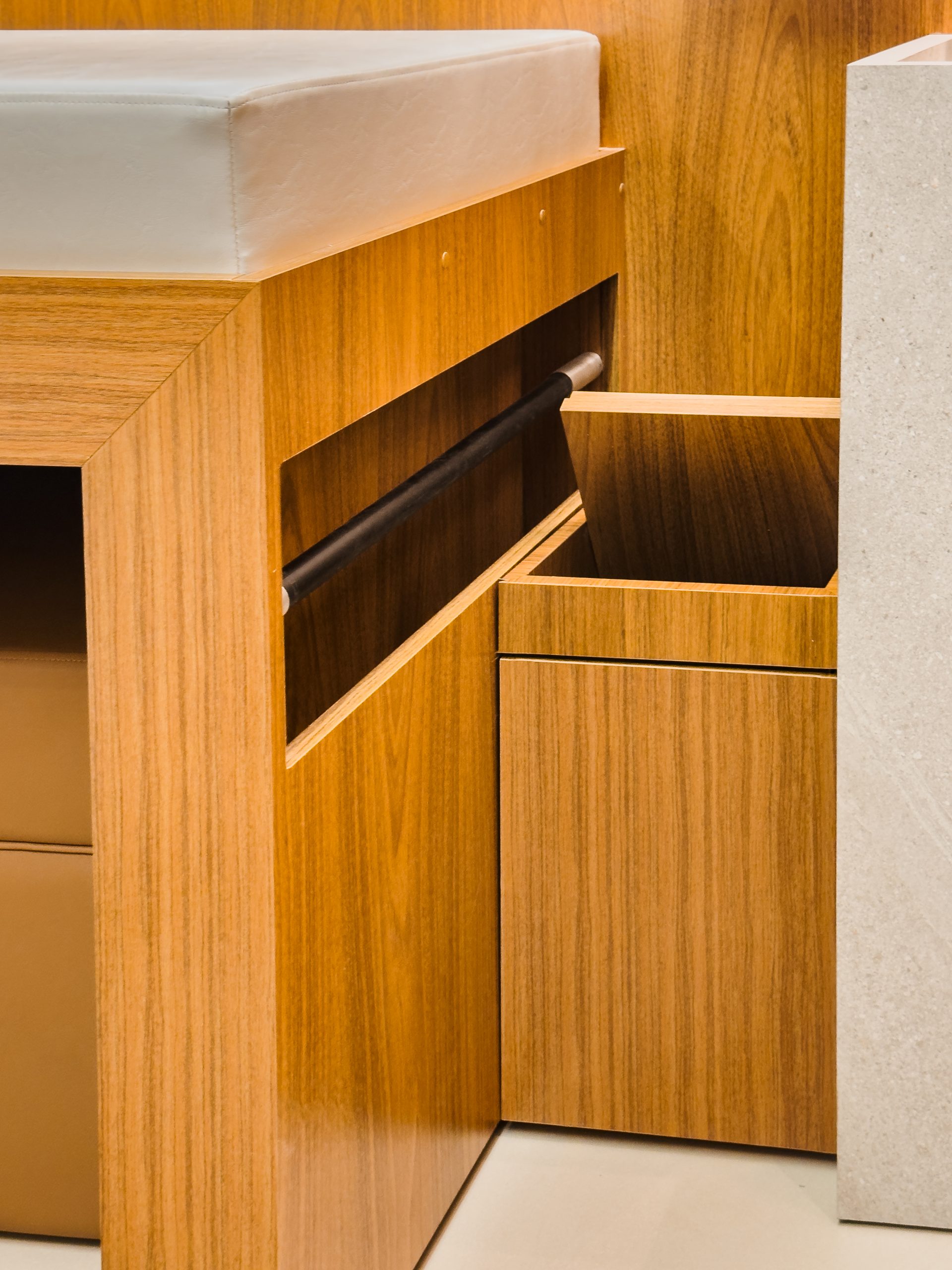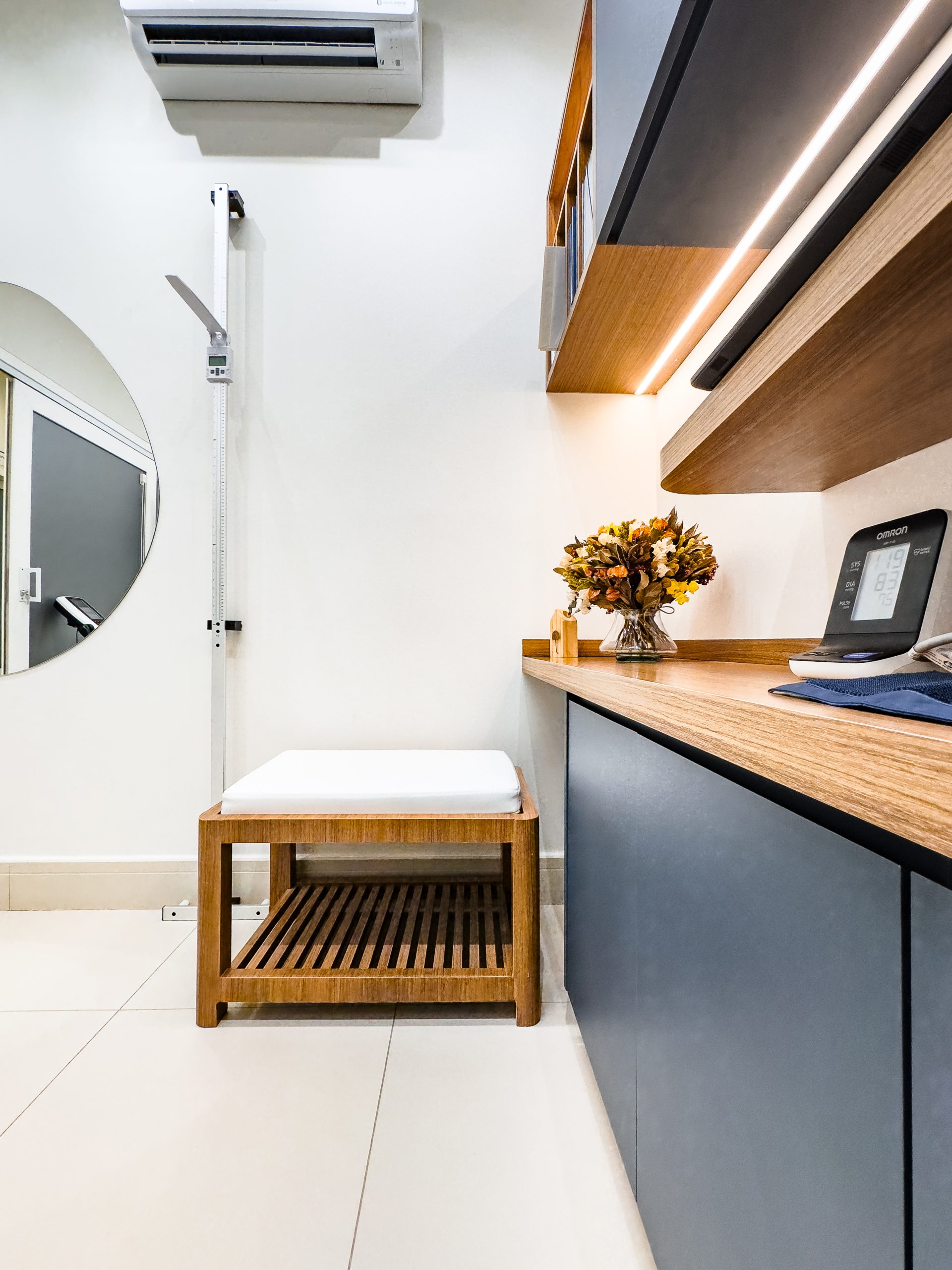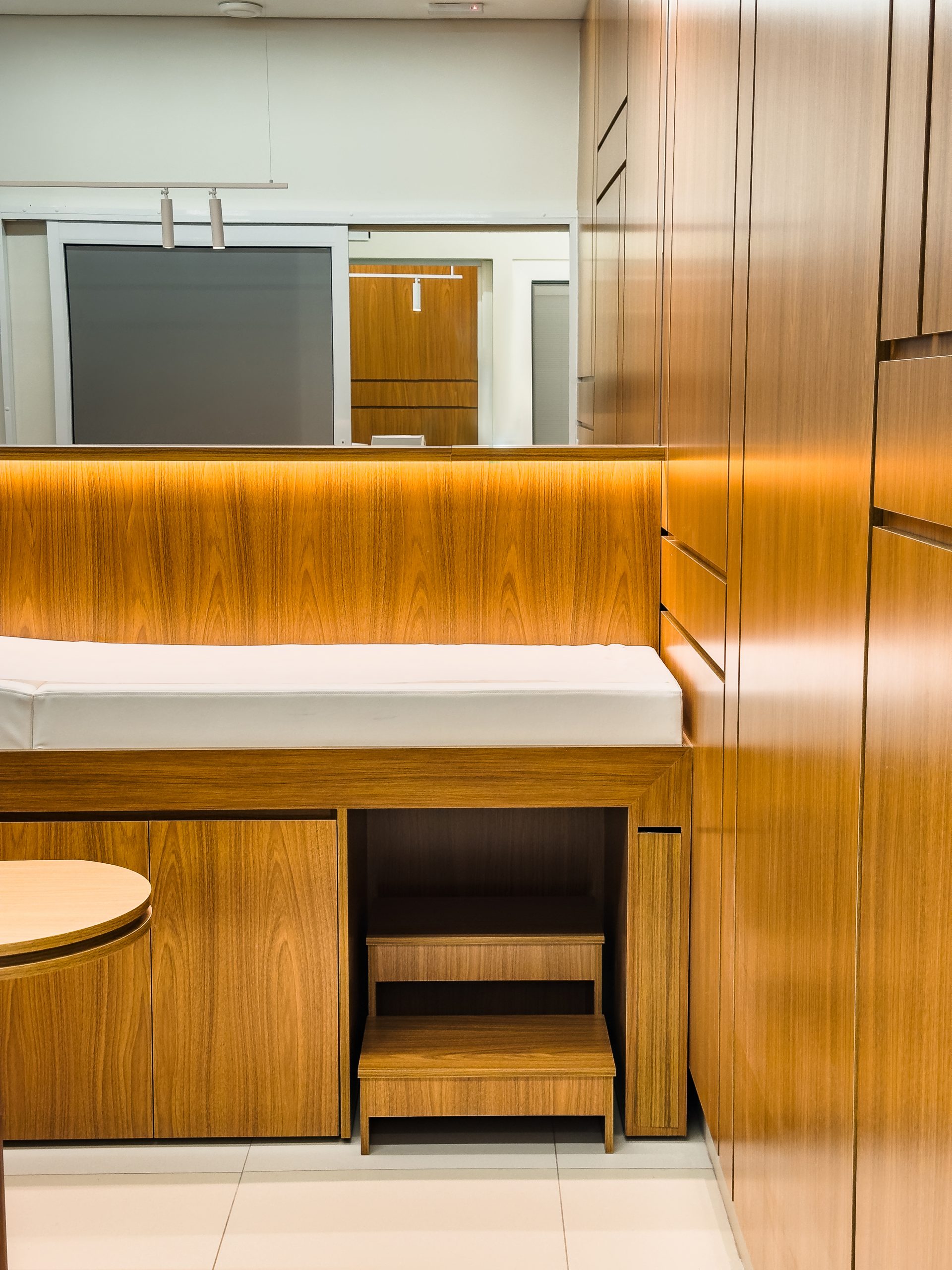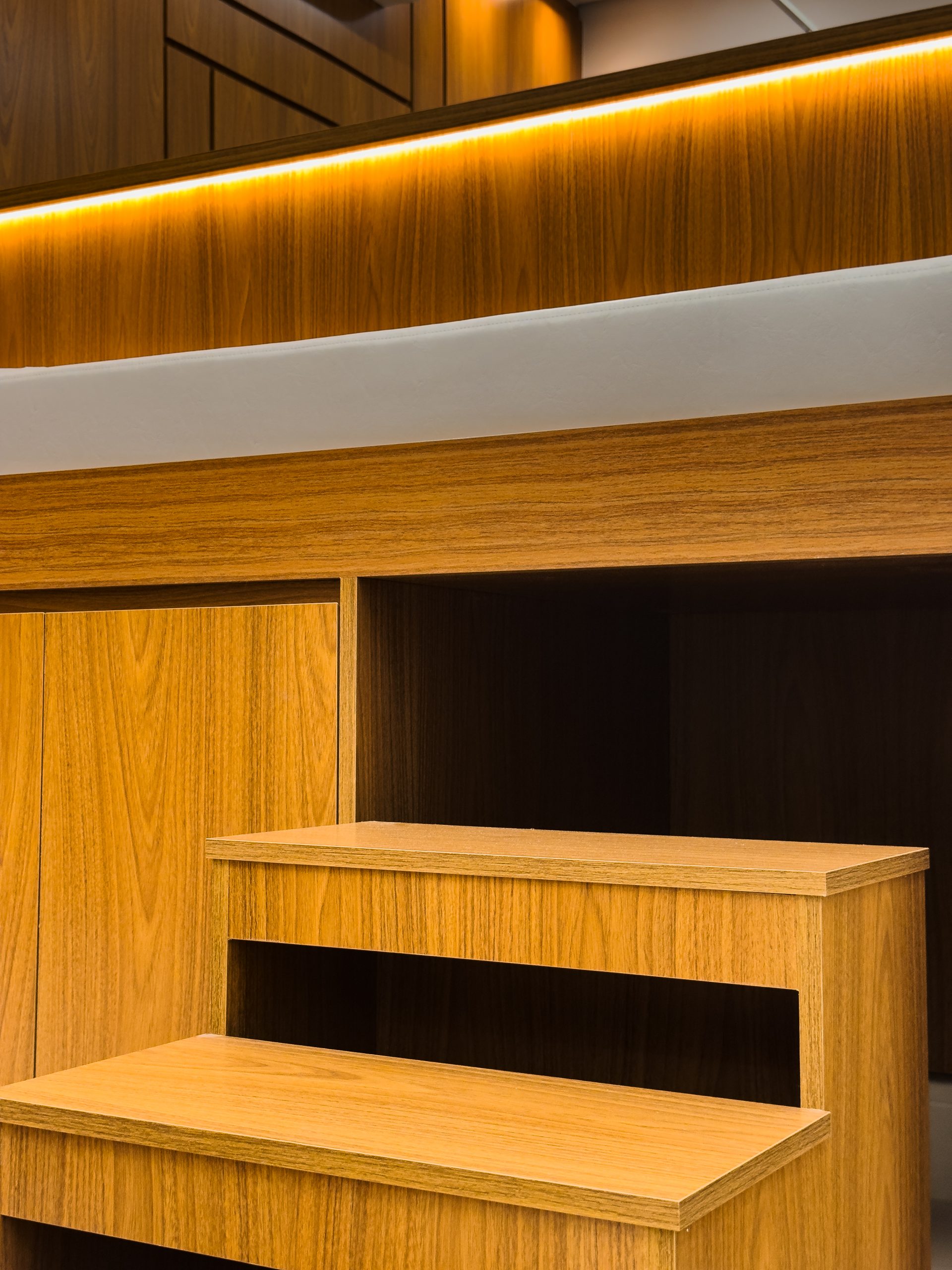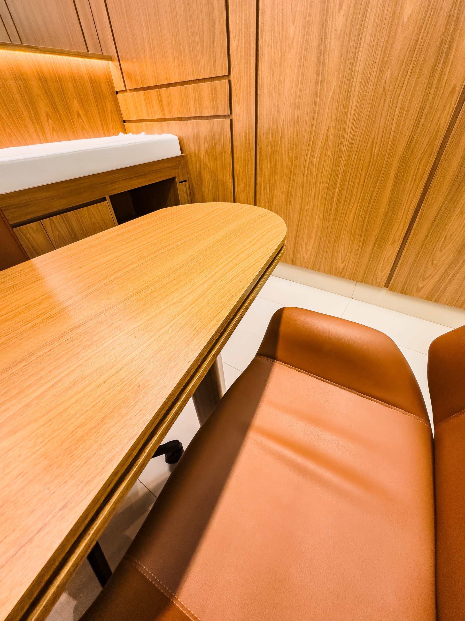 O Painel Integrado Áureo destaca como os móveis planejados transformam a recepção e o consultório em ambientes acolhedores, funcionais e sofisticados. A marcenaria em madeira envolve todo o espaço, criando continuidade visual e integrando nichos, portas camufladas e áreas de apoio com perfeição. A iluminação embutida valoriza os veios da madeira e reforça o tom elegante que acompanha o atendimento desde o primeiro contato.