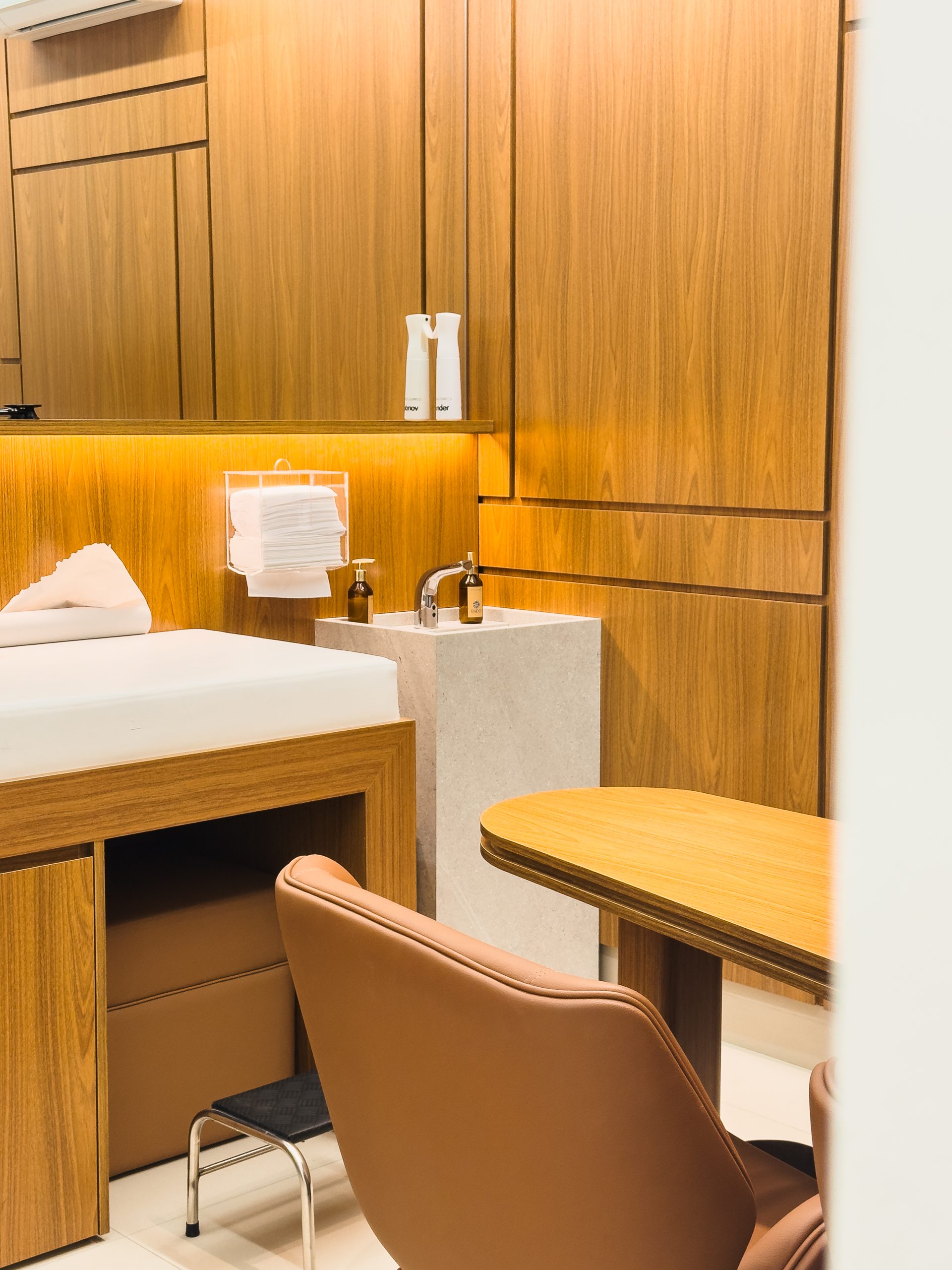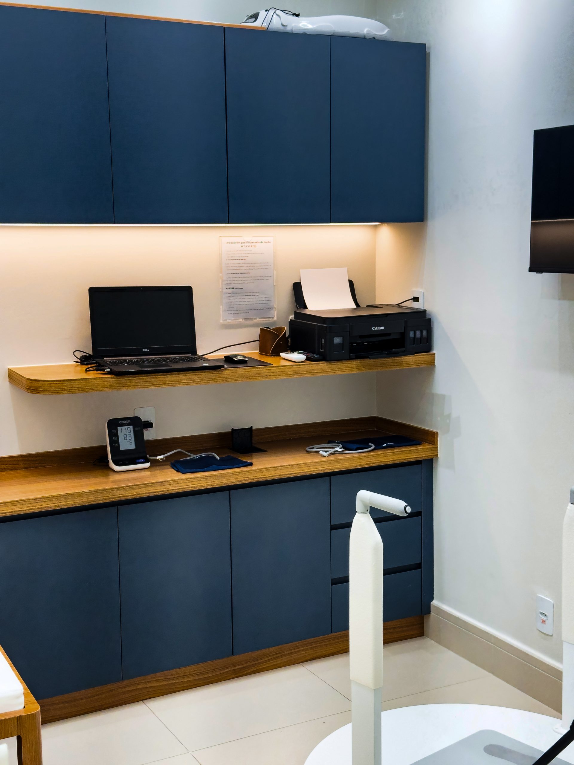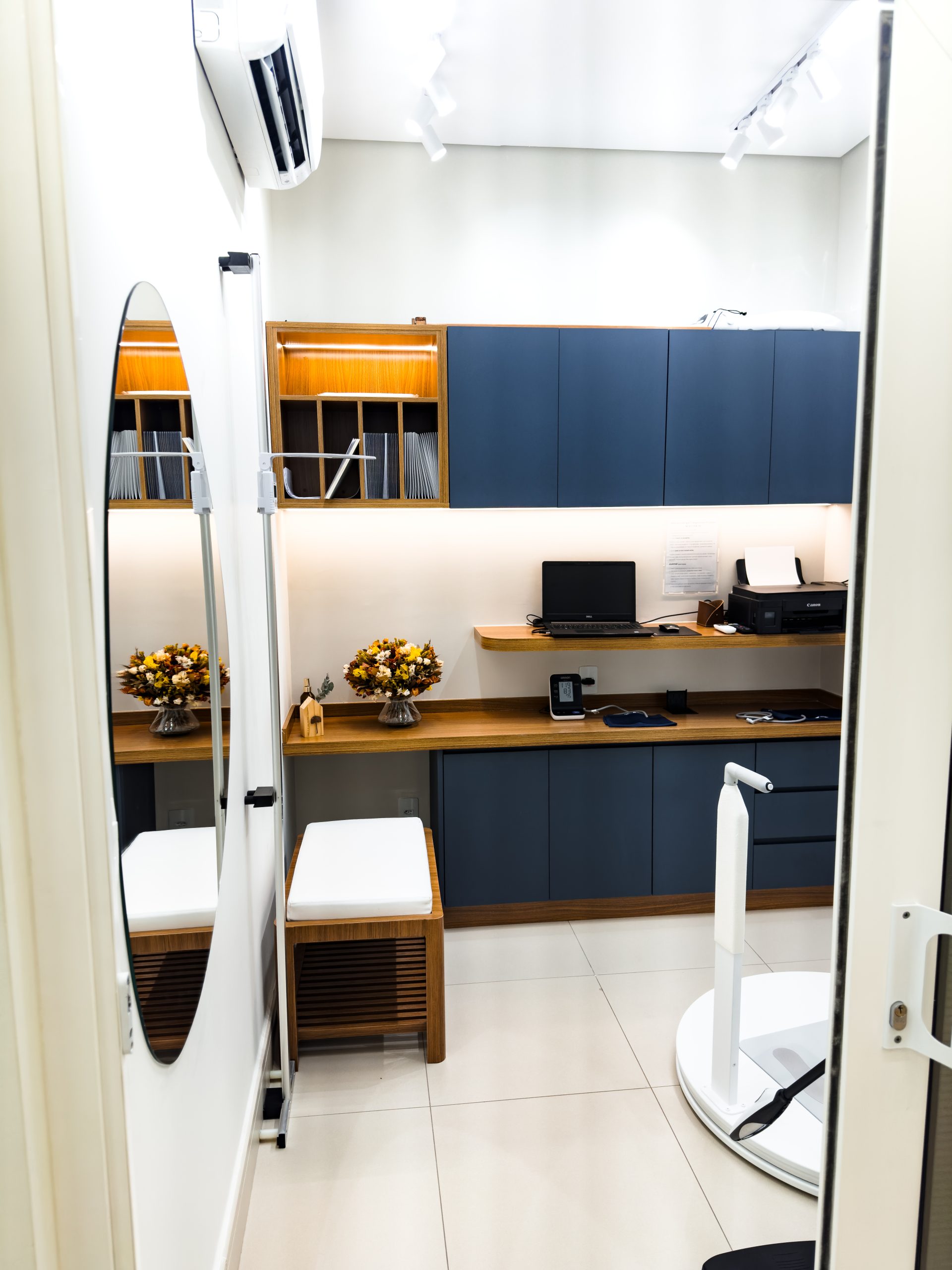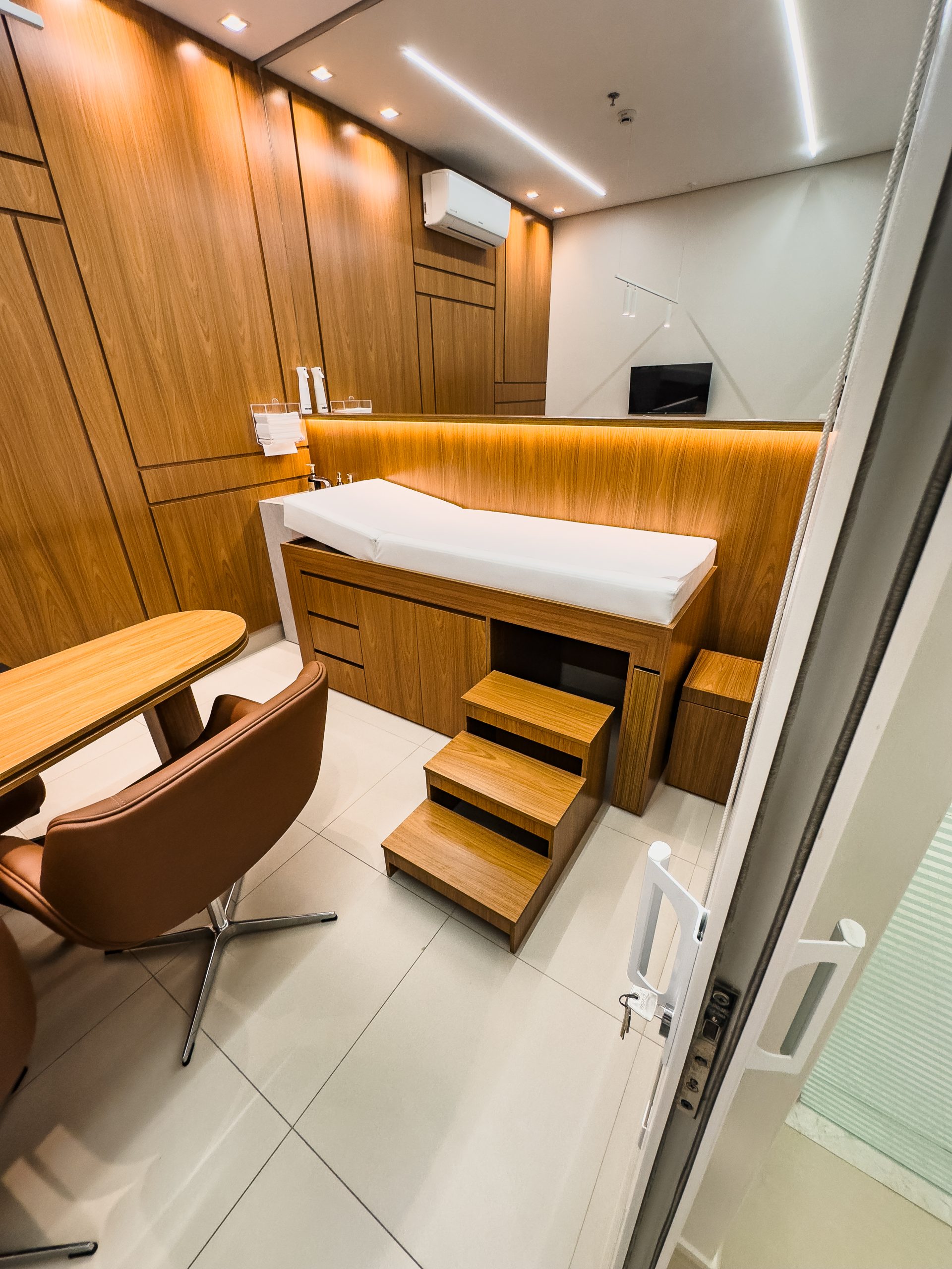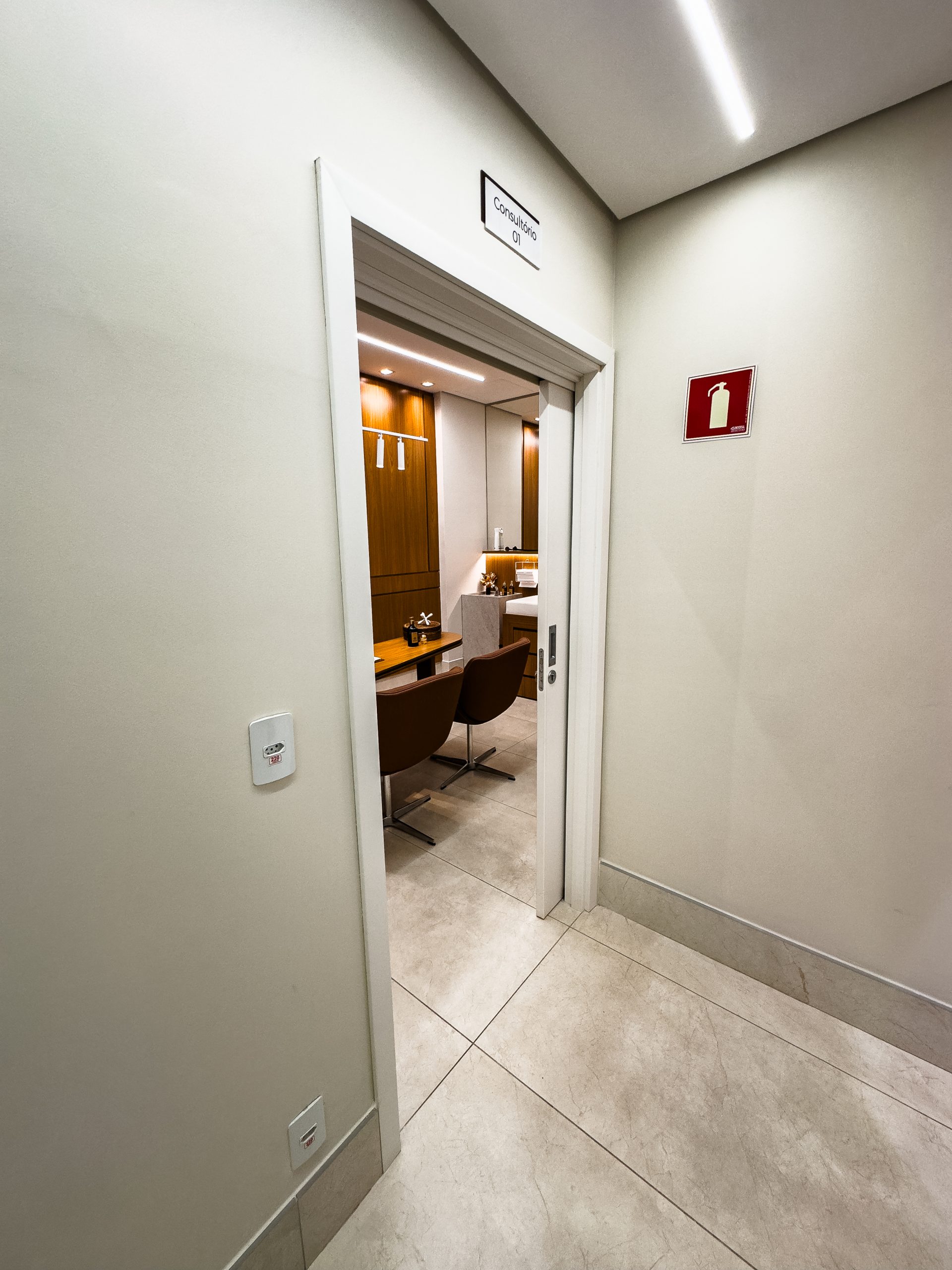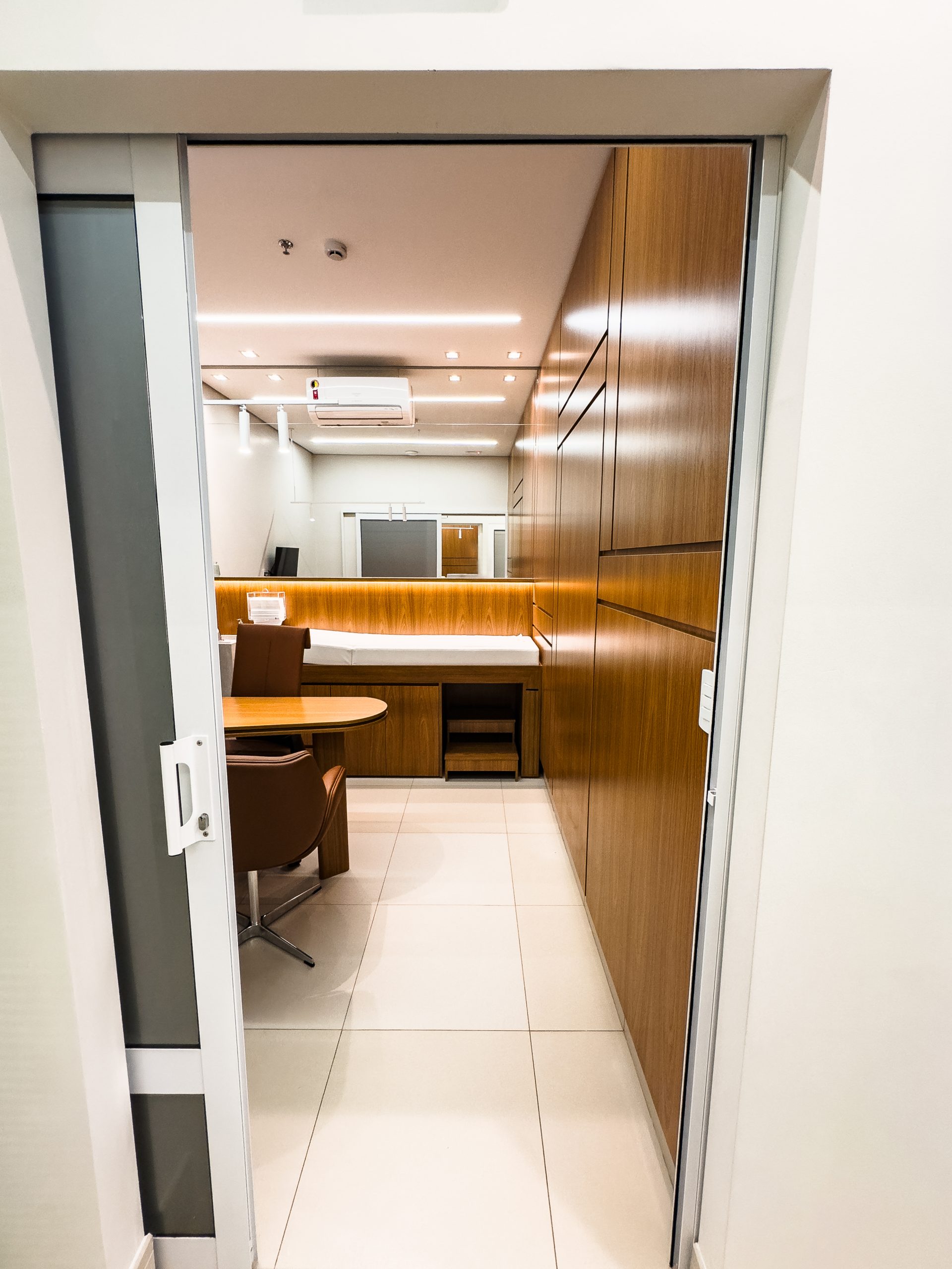 O Painel Integrado Áureo destaca como os móveis planejados transformam a recepção e o consultório em ambientes acolhedores, funcionais e sofisticados. A marcenaria em madeira envolve todo o espaço, criando continuidade visual e integrando nichos, portas camufladas e áreas de apoio com perfeição. A iluminação embutida valoriza os veios da madeira e reforça o tom elegante que acompanha o atendimento desde o primeiro contato.