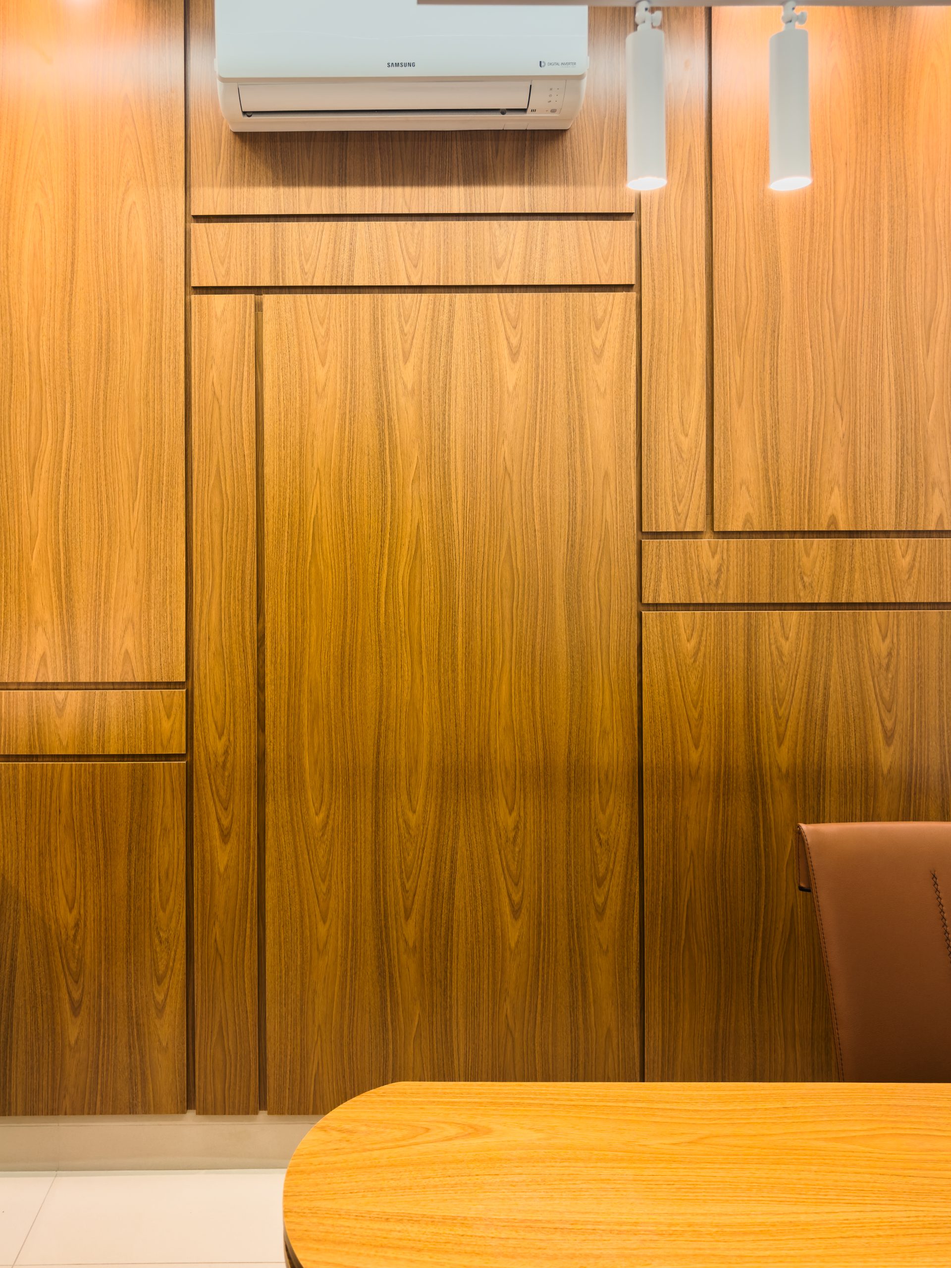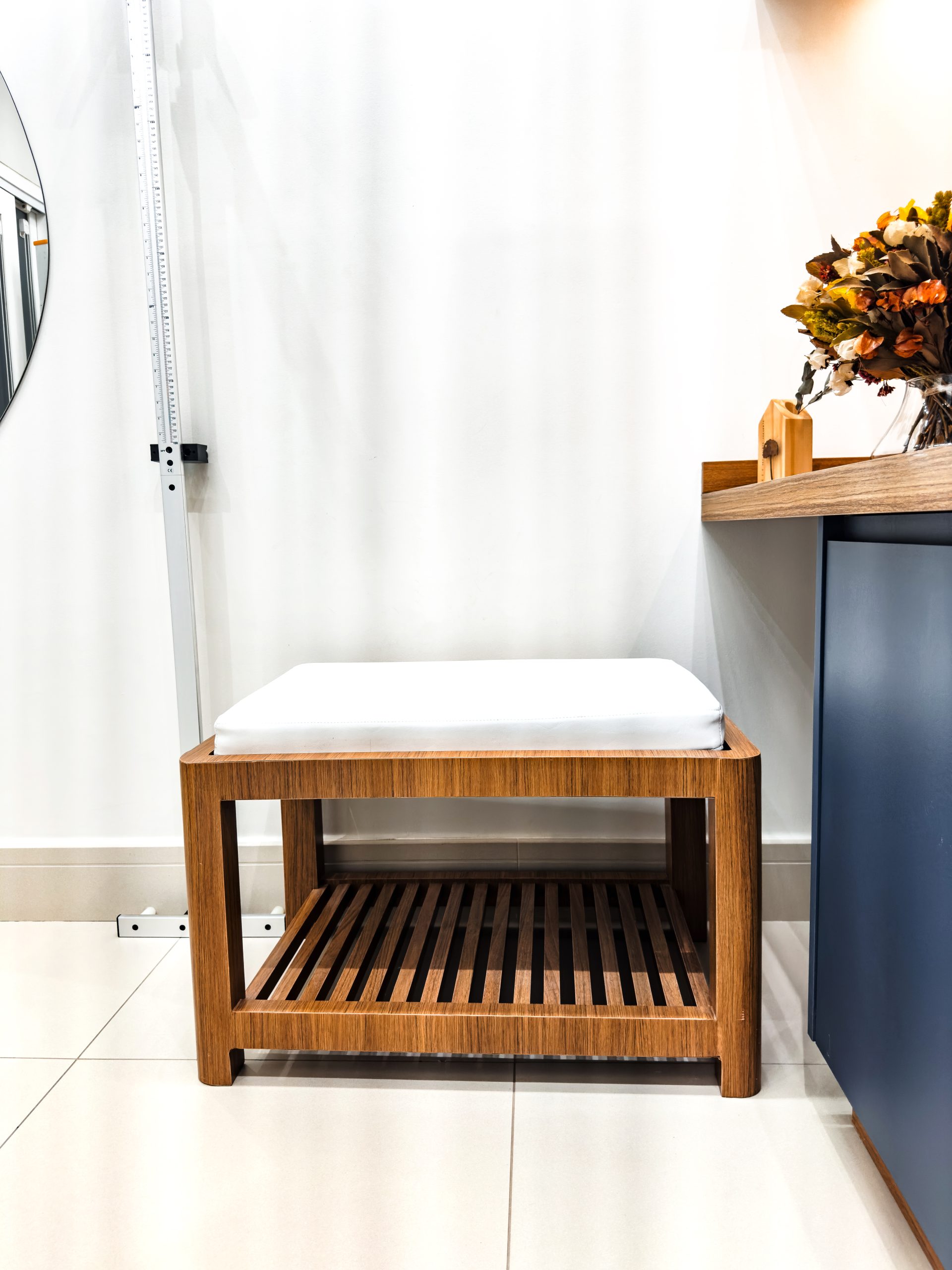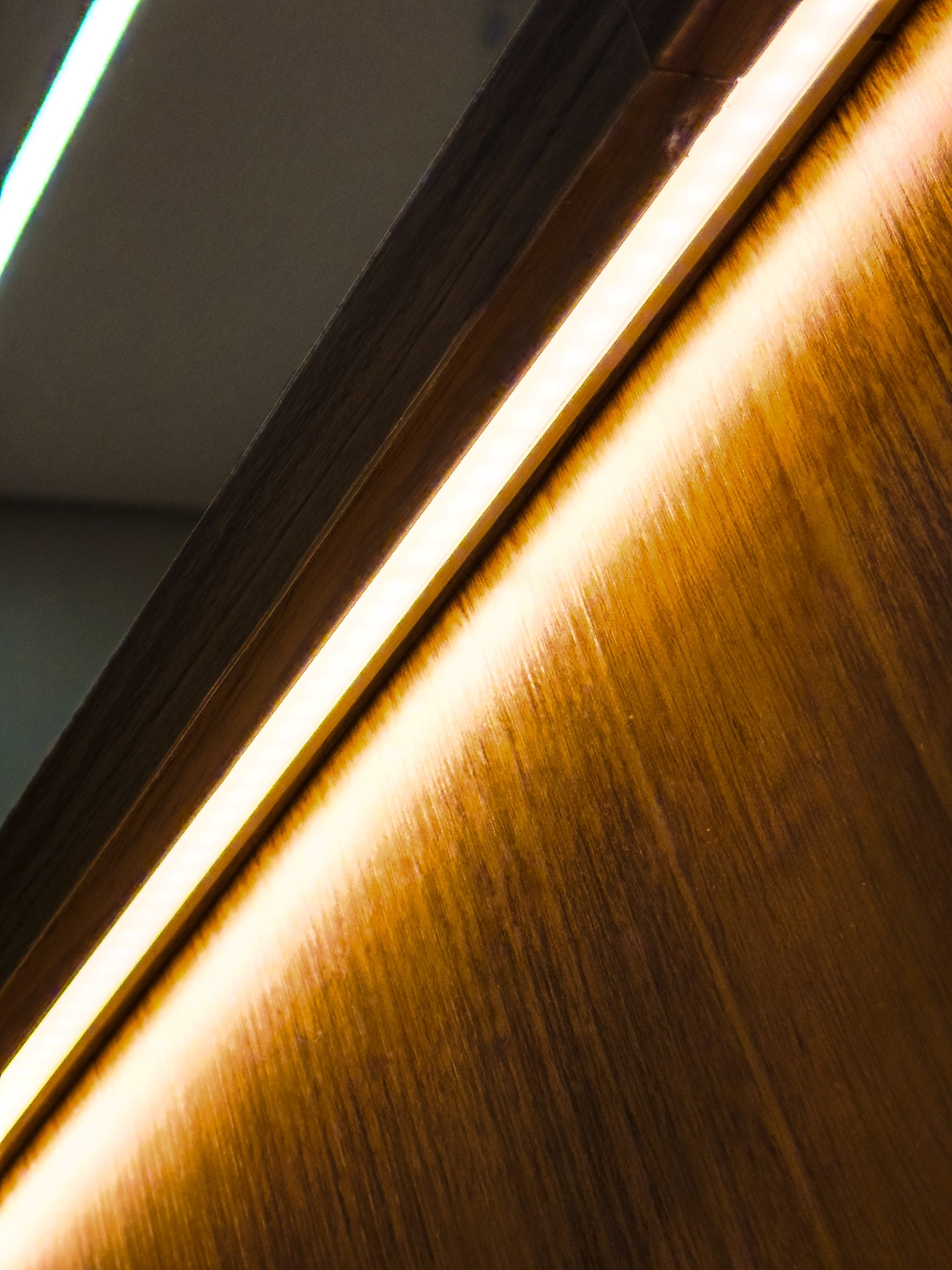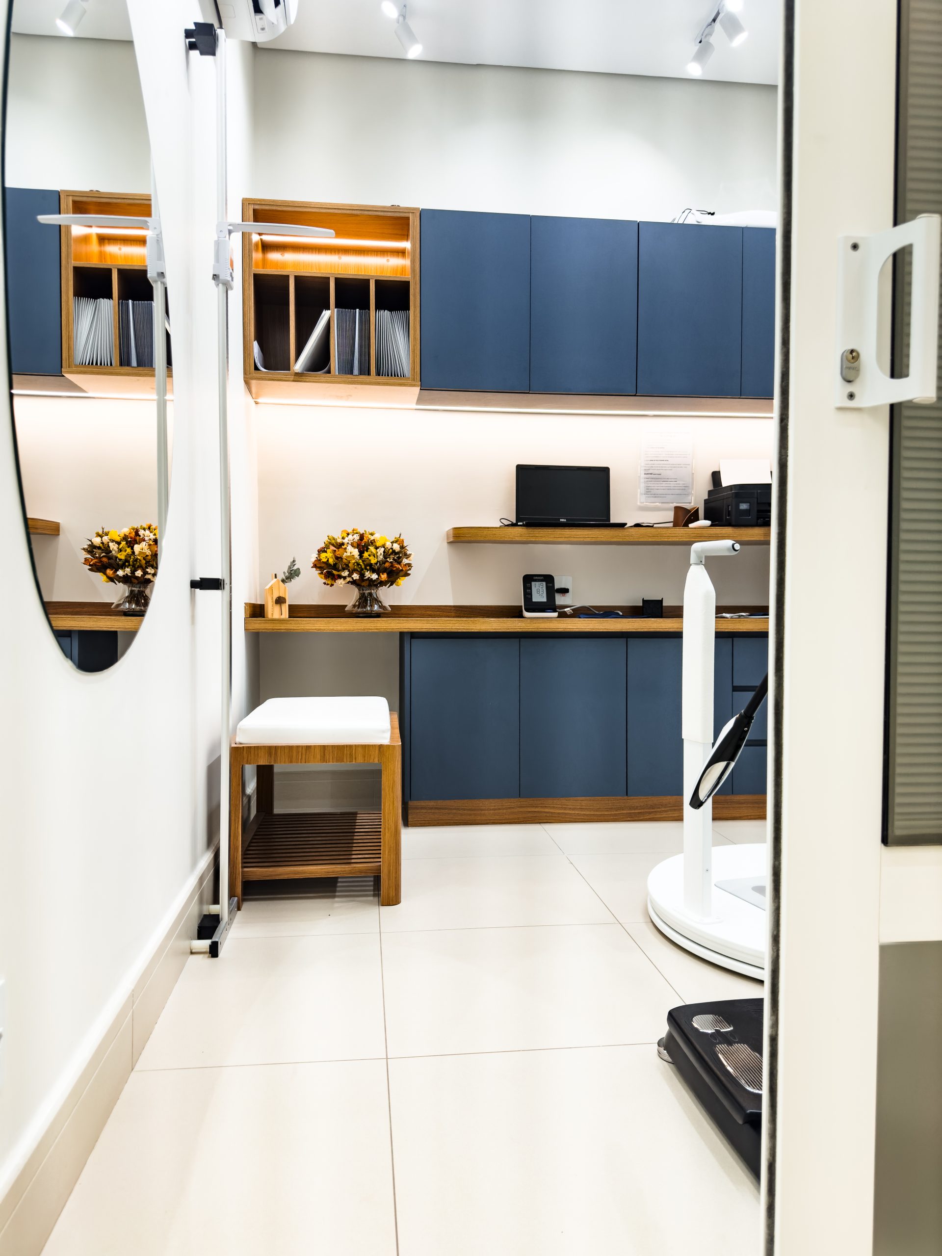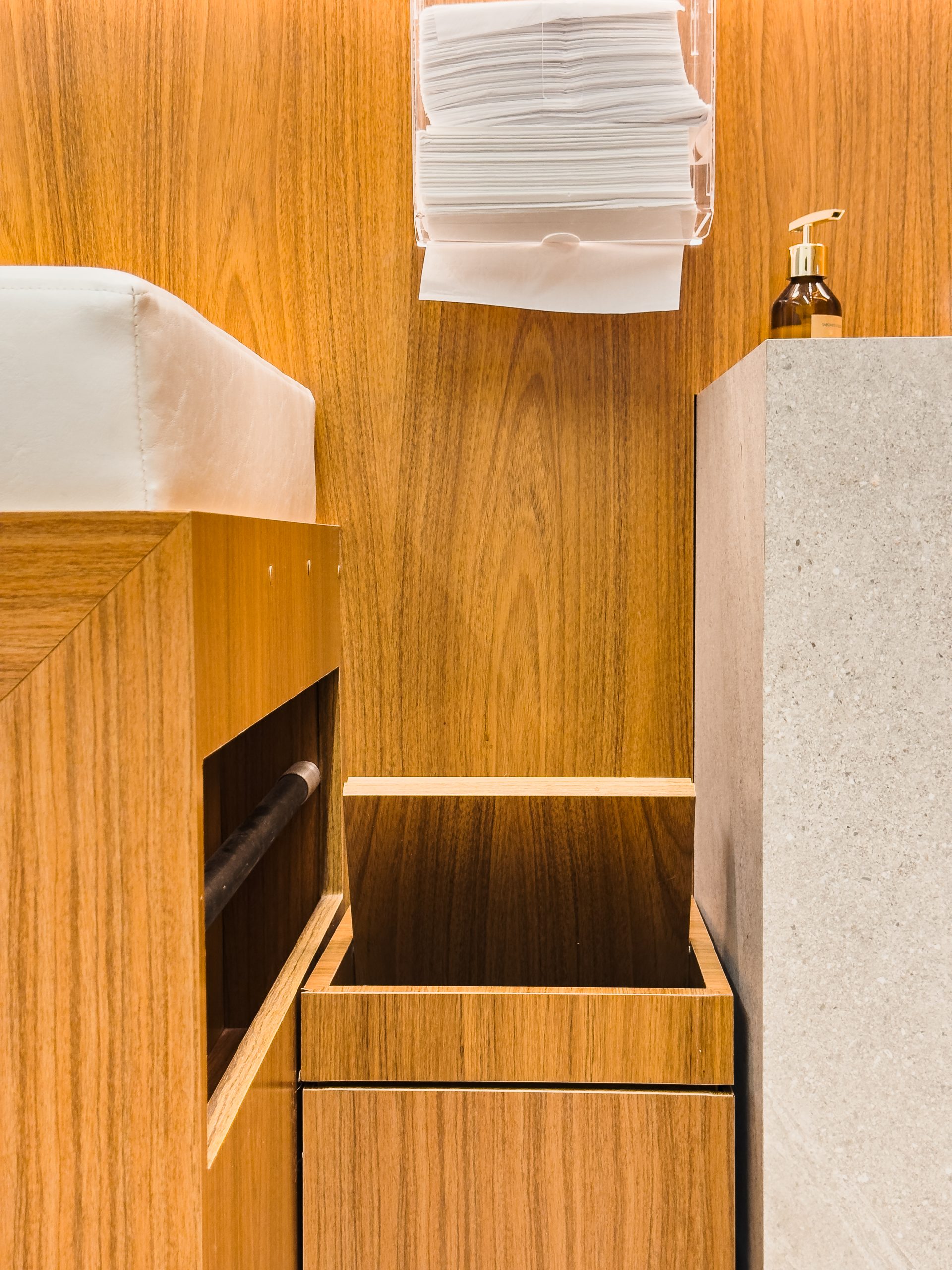 O Painel Integrado Áureo destaca como os móveis planejados transformam a recepção e o consultório em ambientes acolhedores, funcionais e sofisticados. A marcenaria em madeira envolve todo o espaço, criando continuidade visual e integrando nichos, portas camufladas e áreas de apoio com perfeição. A iluminação embutida valoriza os veios da madeira e reforça o tom elegante que acompanha o atendimento desde o primeiro contato.