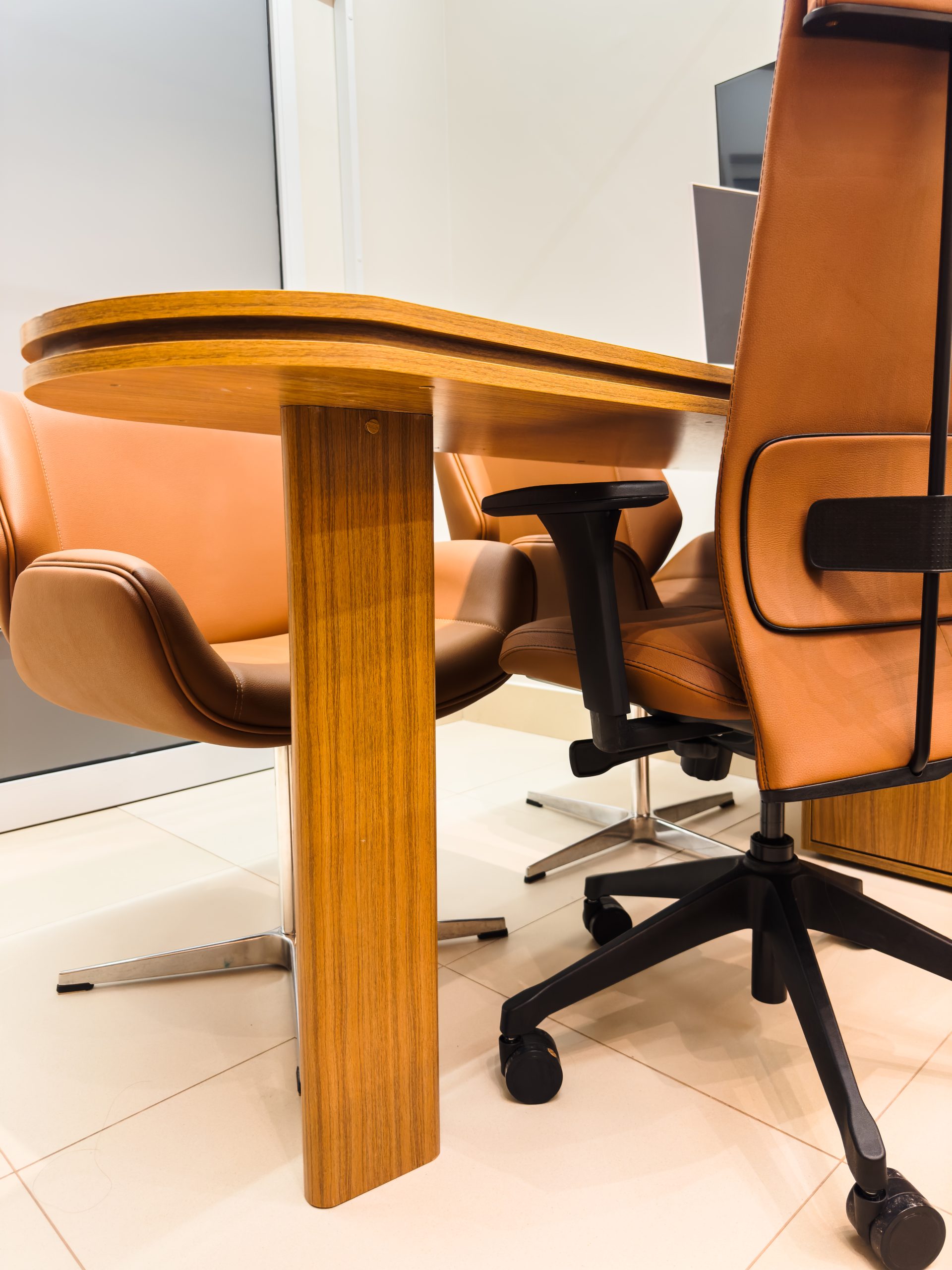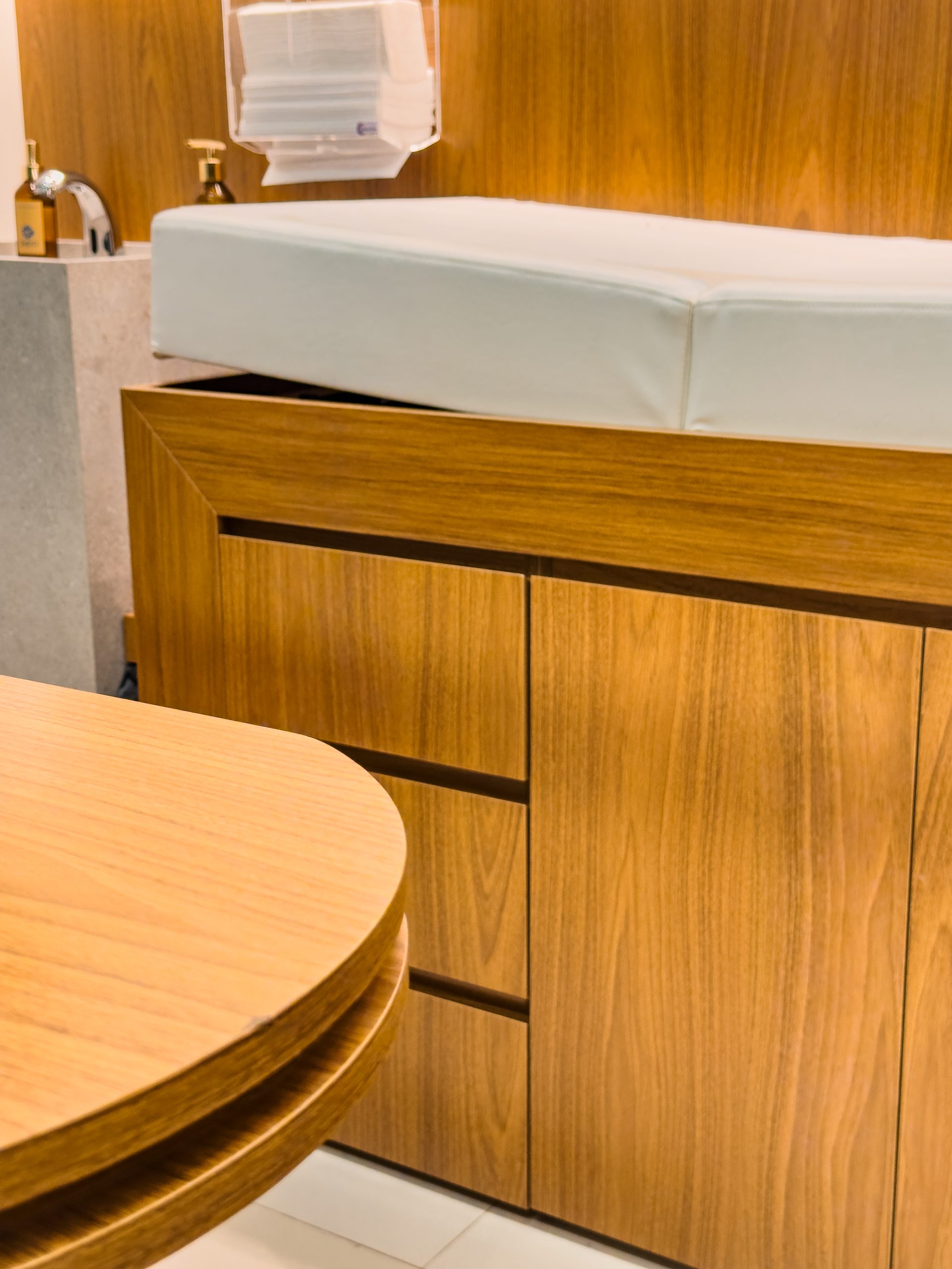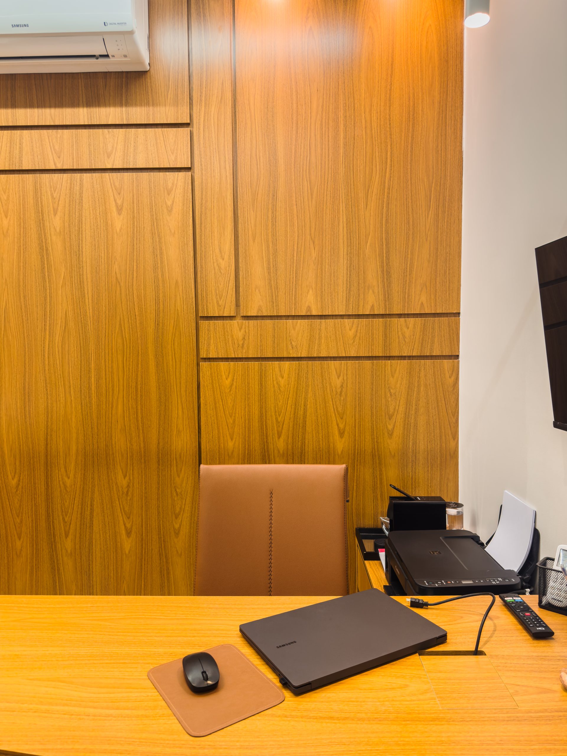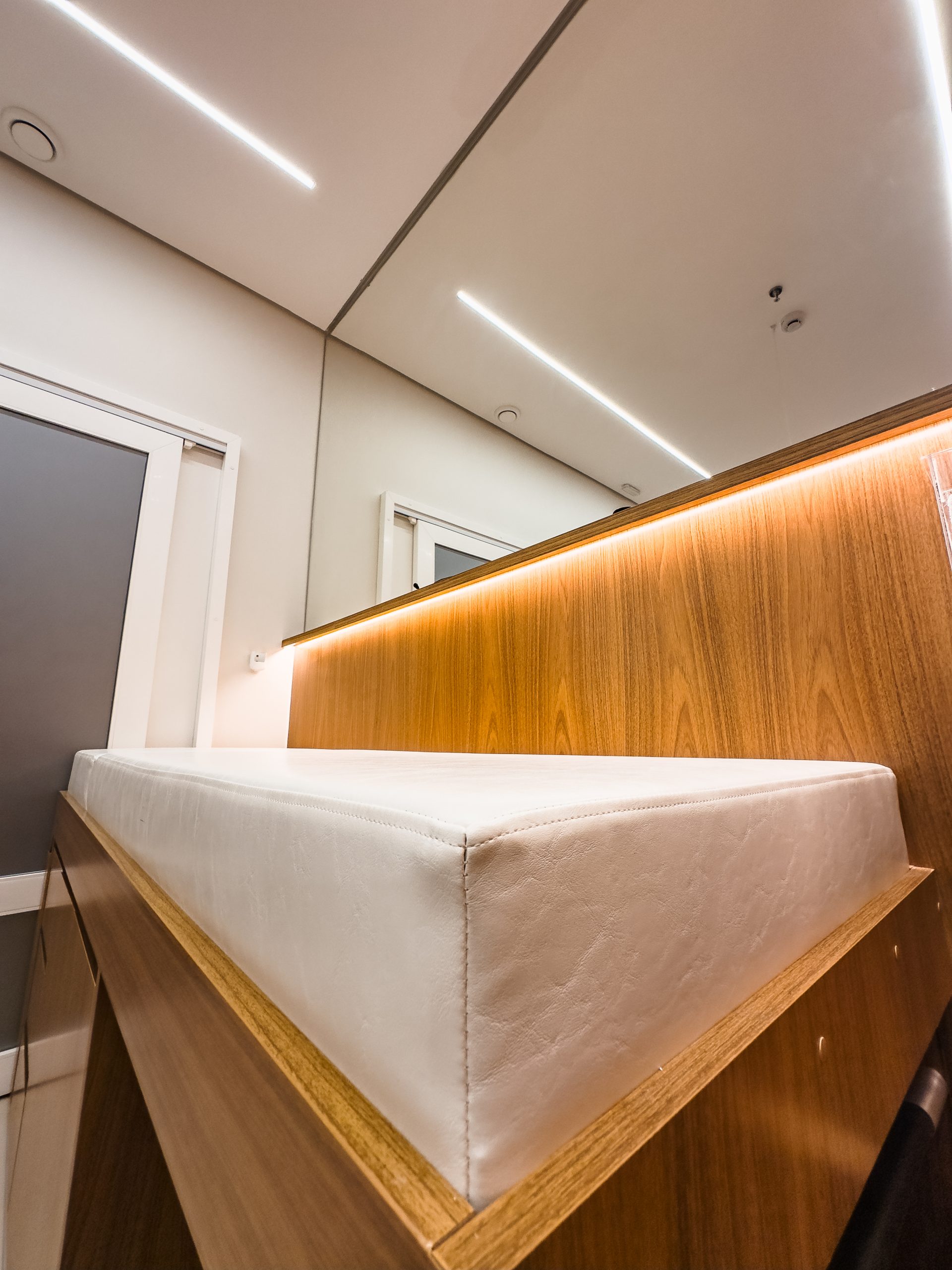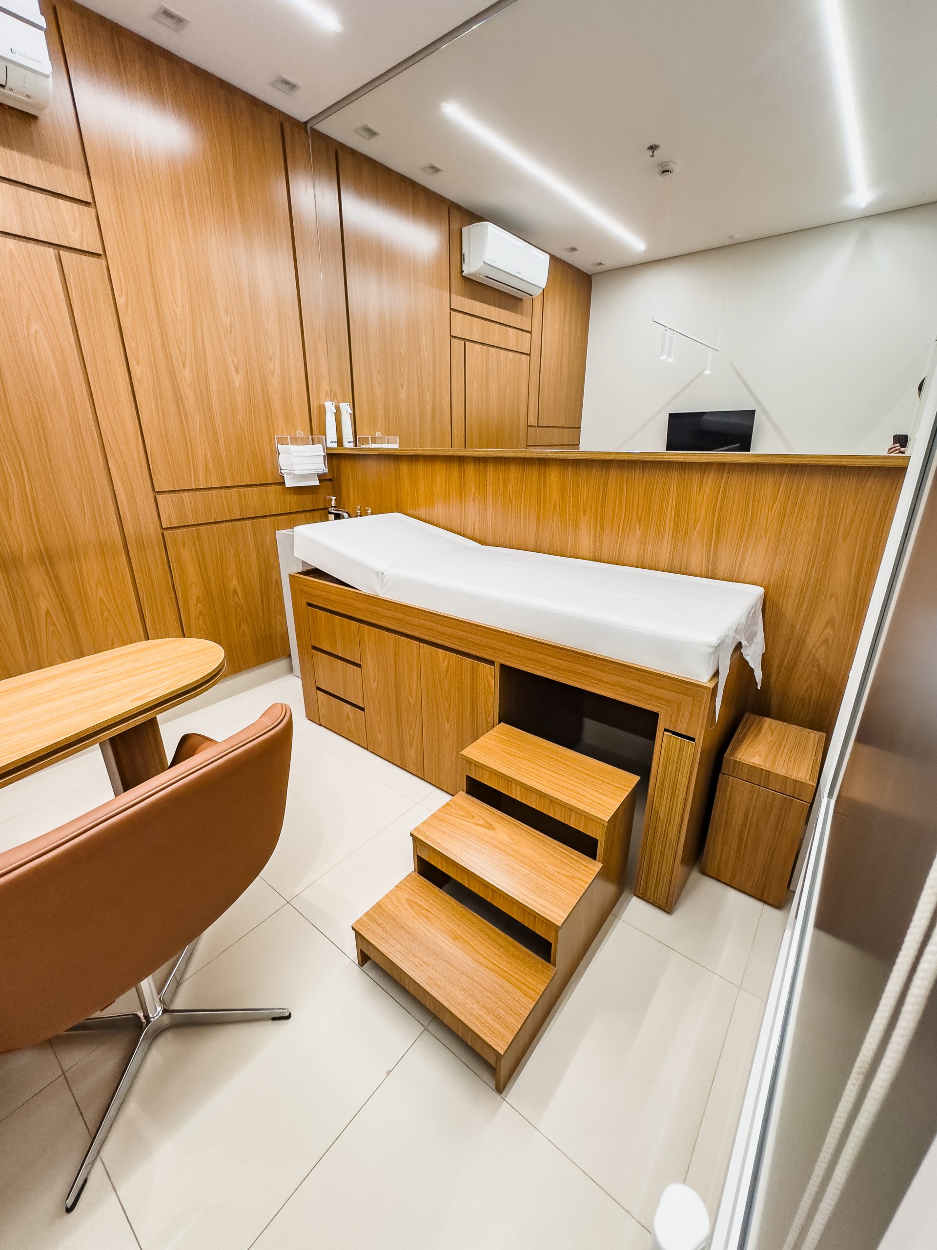 O Painel Integrado Áureo destaca como os móveis planejados transformam a recepção e o consultório em ambientes acolhedores, funcionais e sofisticados. A marcenaria em madeira envolve todo o espaço, criando continuidade visual e integrando nichos, portas camufladas e áreas de apoio com perfeição. A iluminação embutida valoriza os veios da madeira e reforça o tom elegante que acompanha o atendimento desde o primeiro contato.