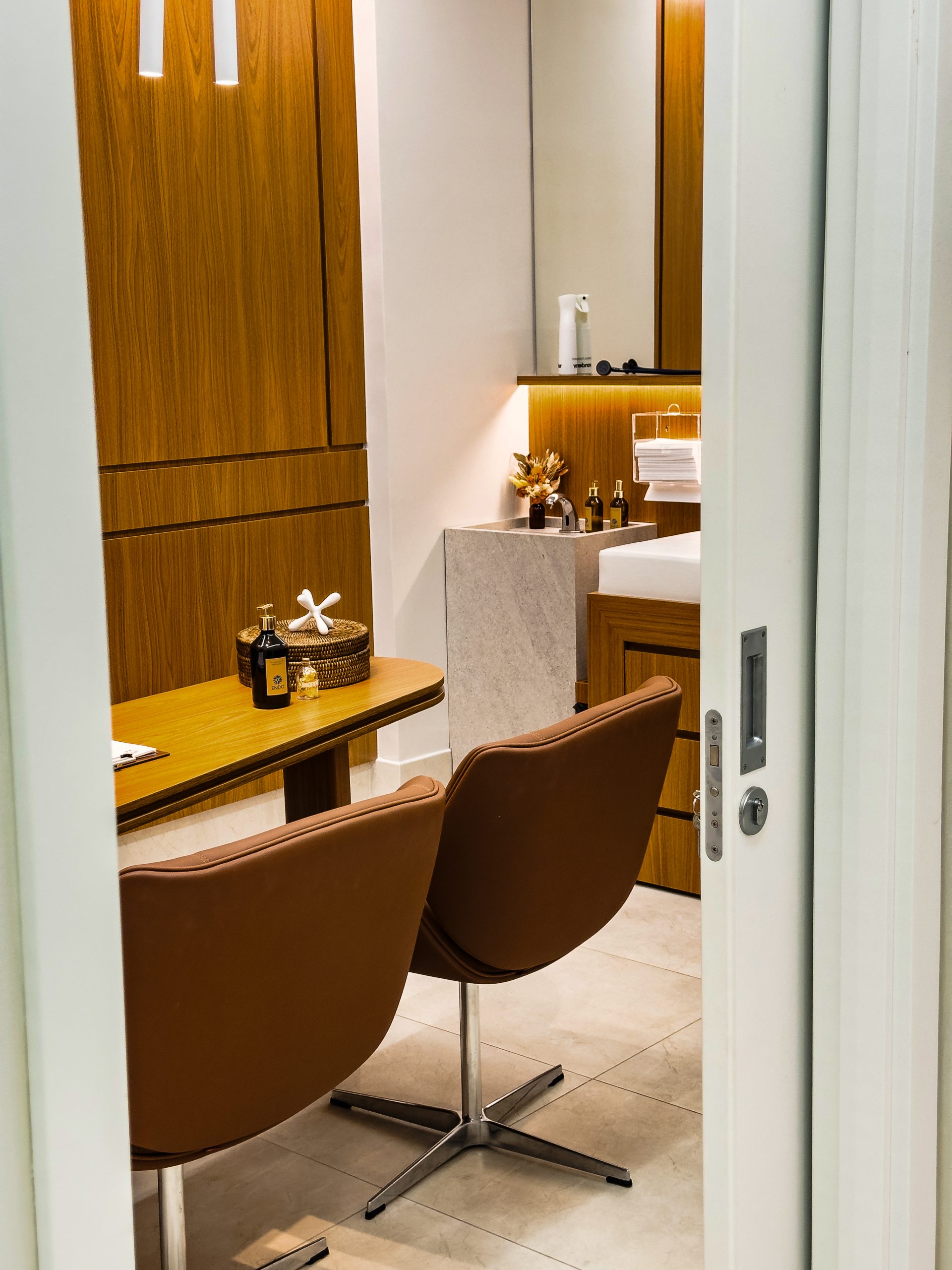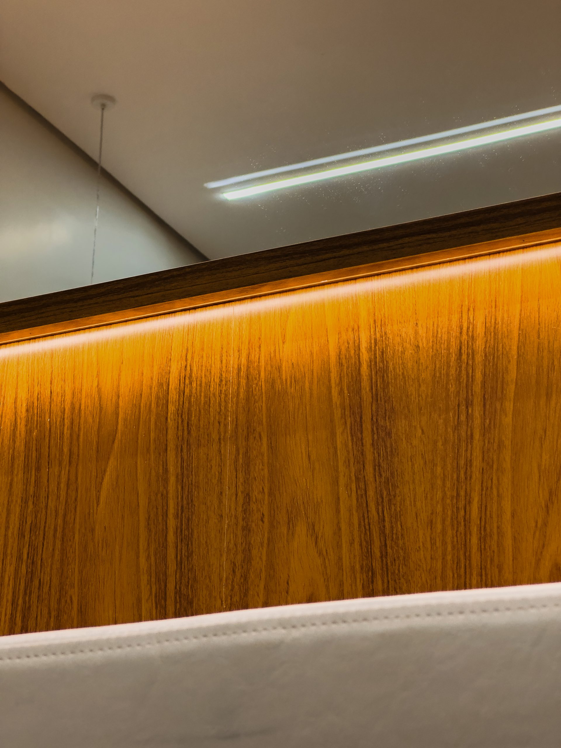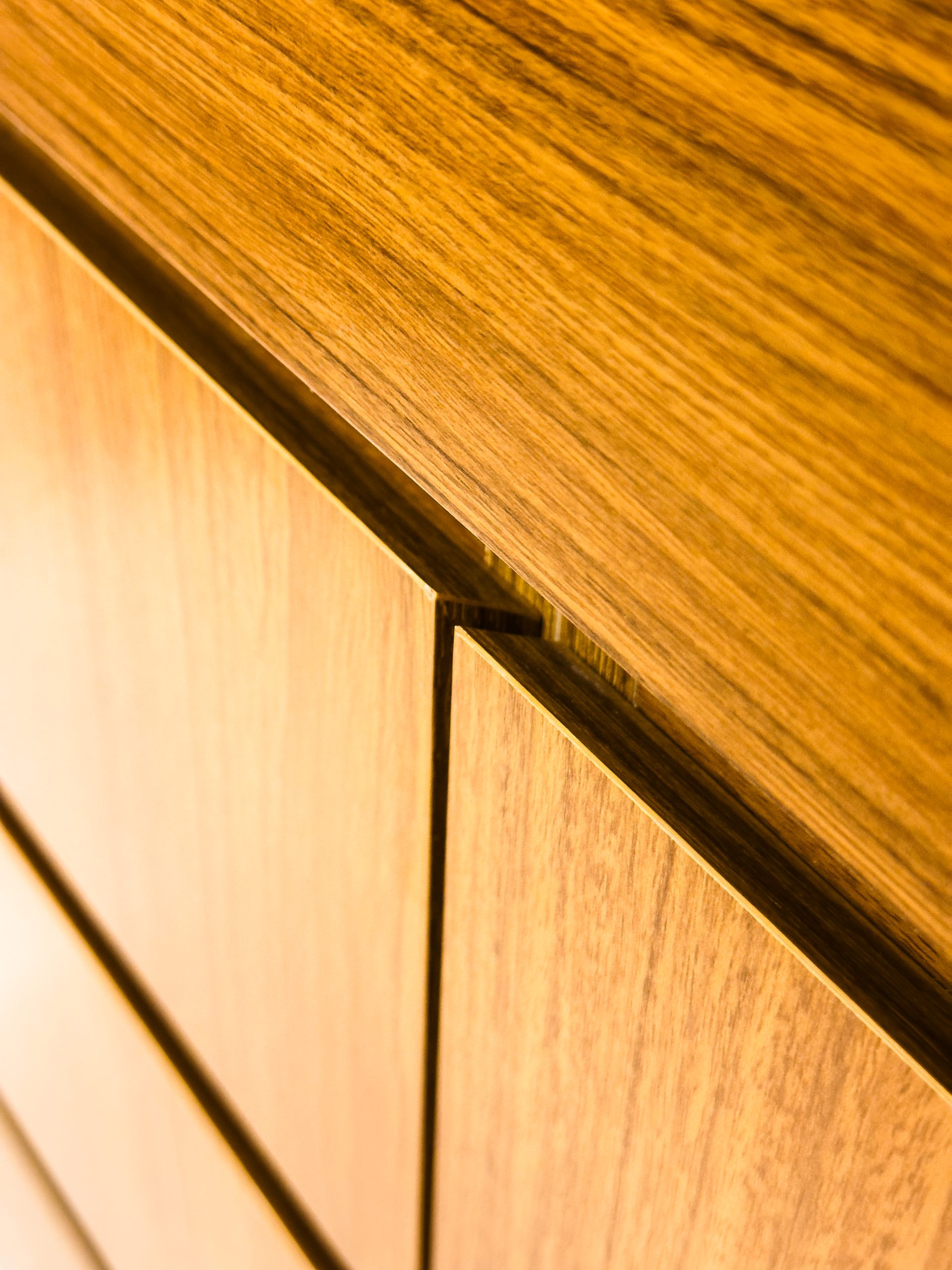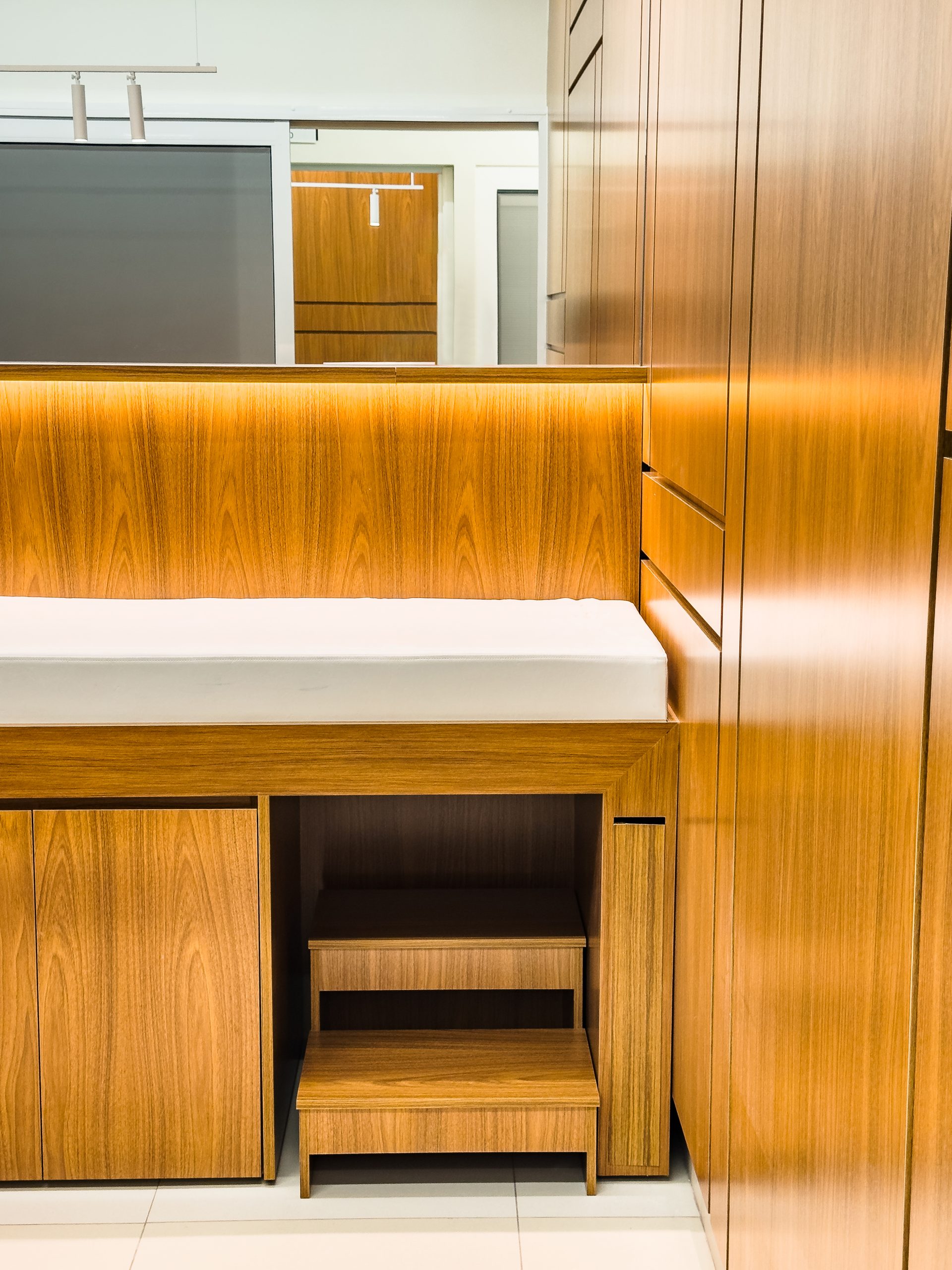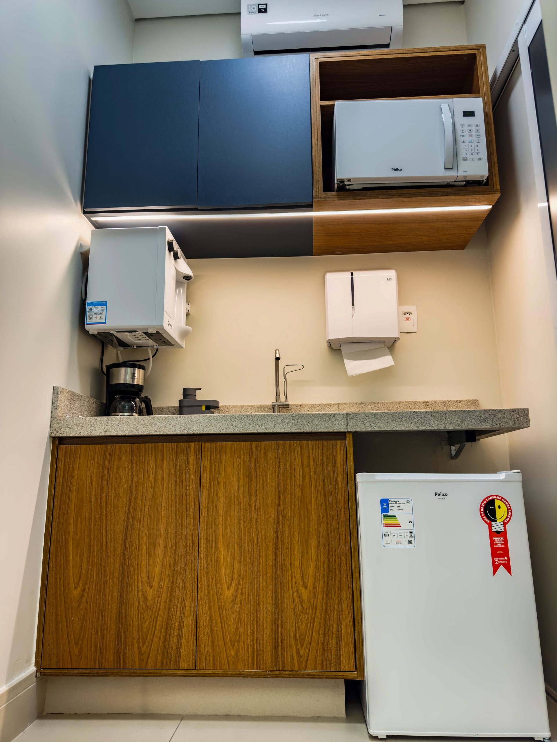 O Painel Integrado Áureo destaca como os móveis planejados transformam a recepção e o consultório em ambientes acolhedores, funcionais e sofisticados. A marcenaria em madeira envolve todo o espaço, criando continuidade visual e integrando nichos, portas camufladas e áreas de apoio com perfeição. A iluminação embutida valoriza os veios da madeira e reforça o tom elegante que acompanha o atendimento desde o primeiro contato.